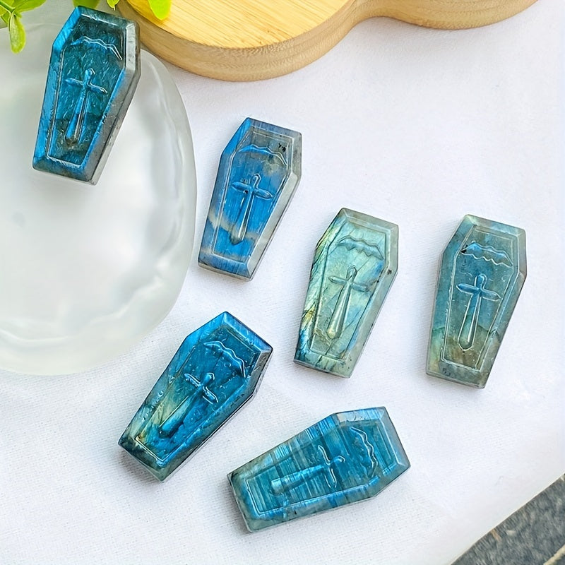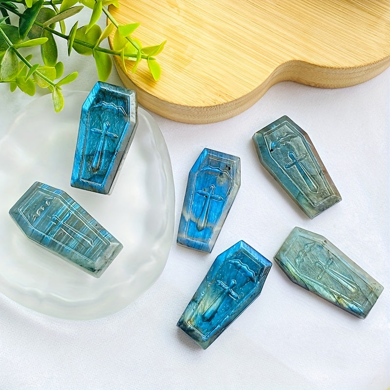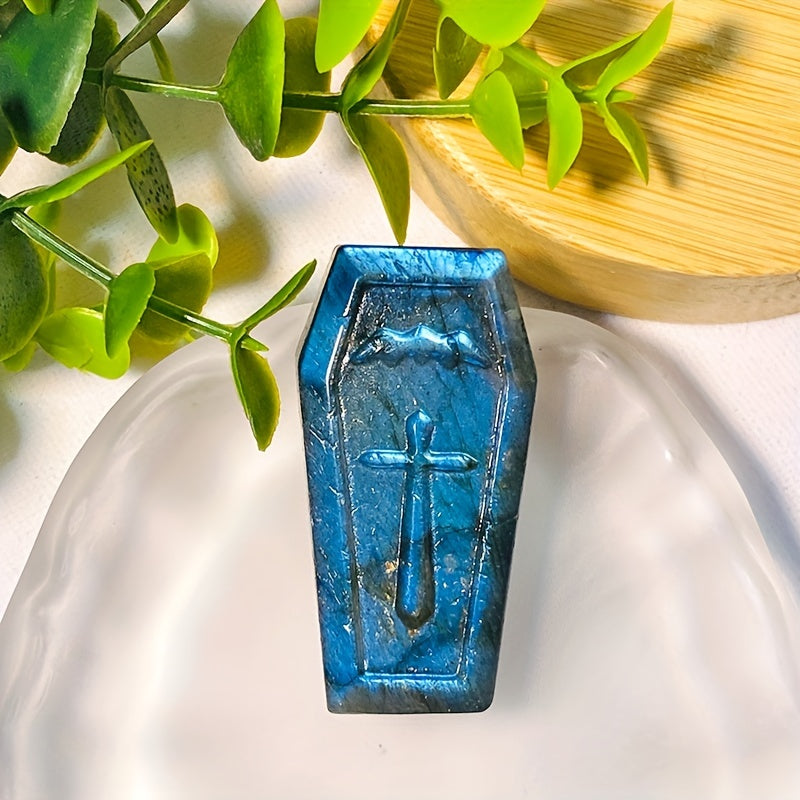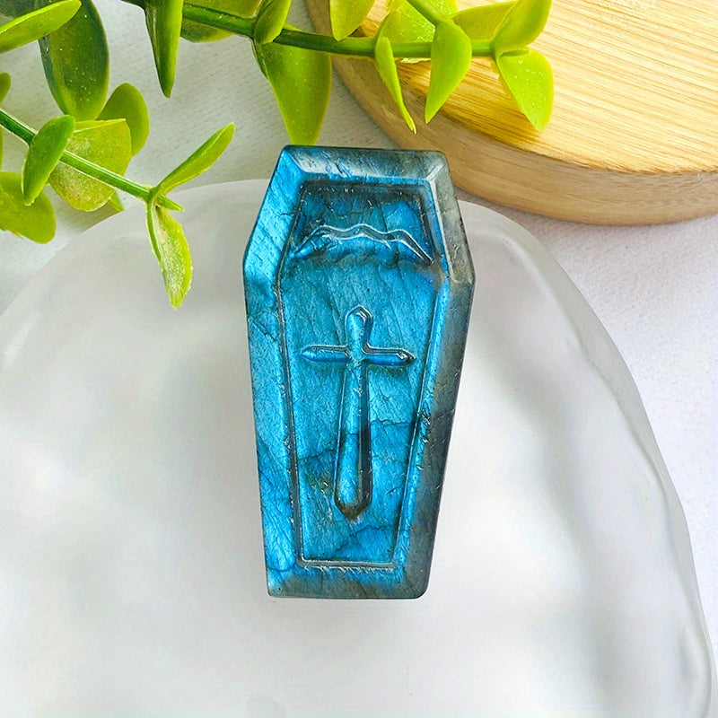 Enhance your home decor with this Labradorite Coffin Wood Plank Carving. This unique piece features natural crystal healing energy, making it a perfect addition to your space.
