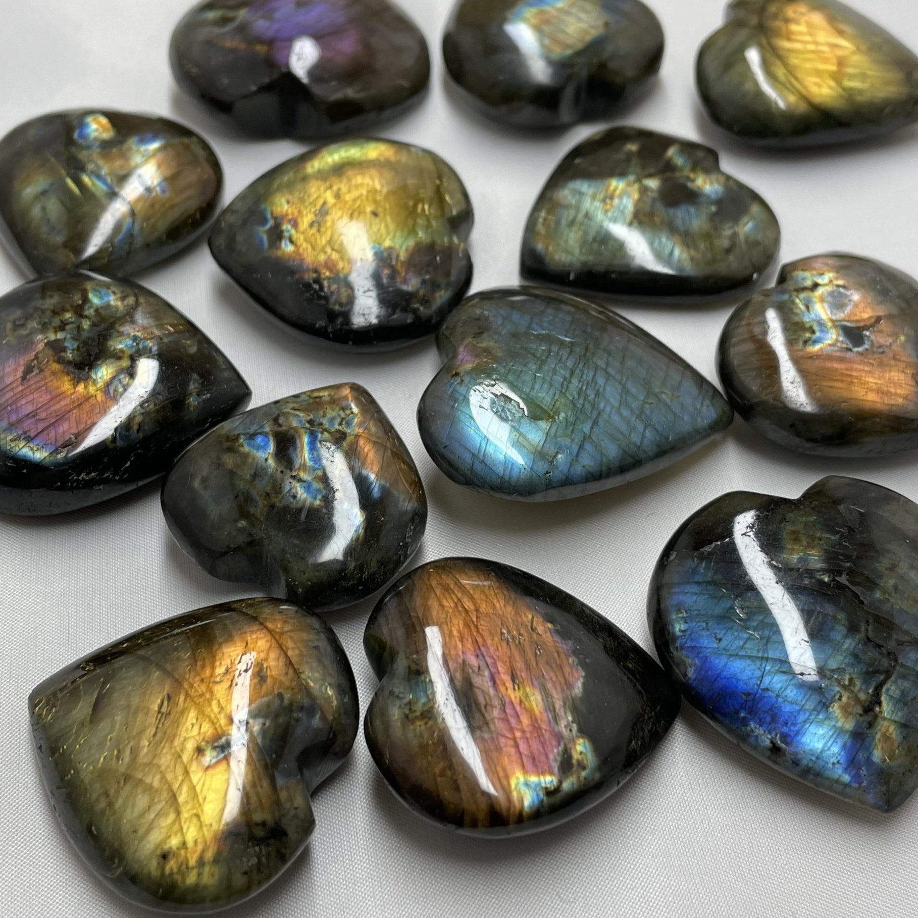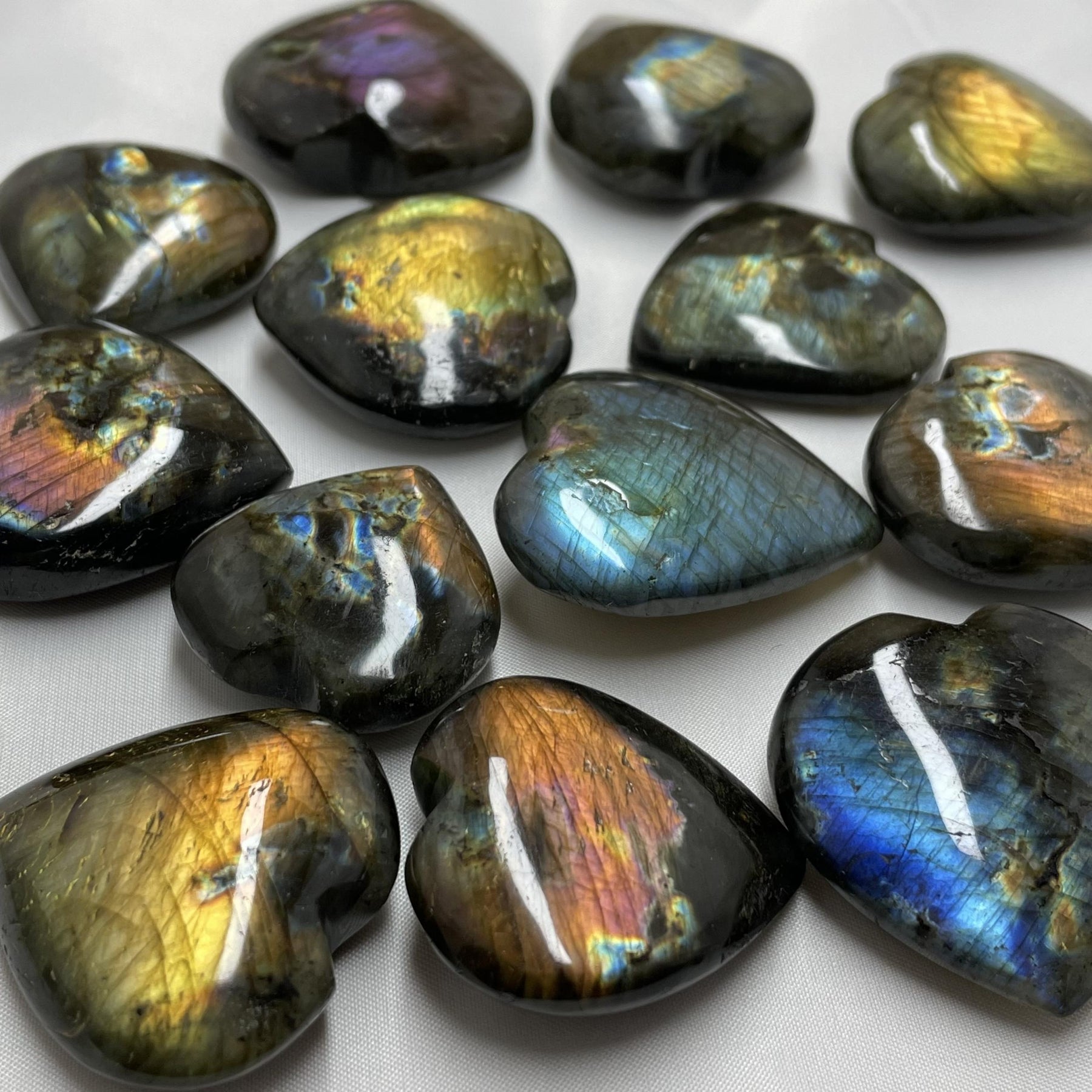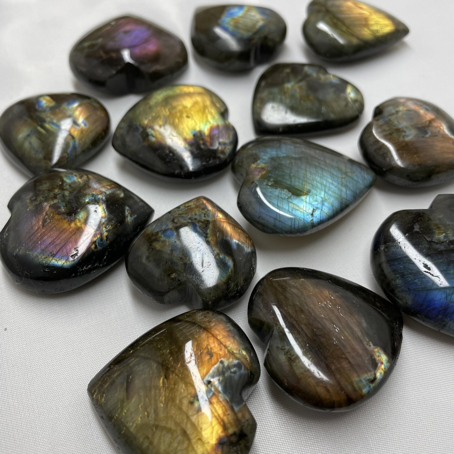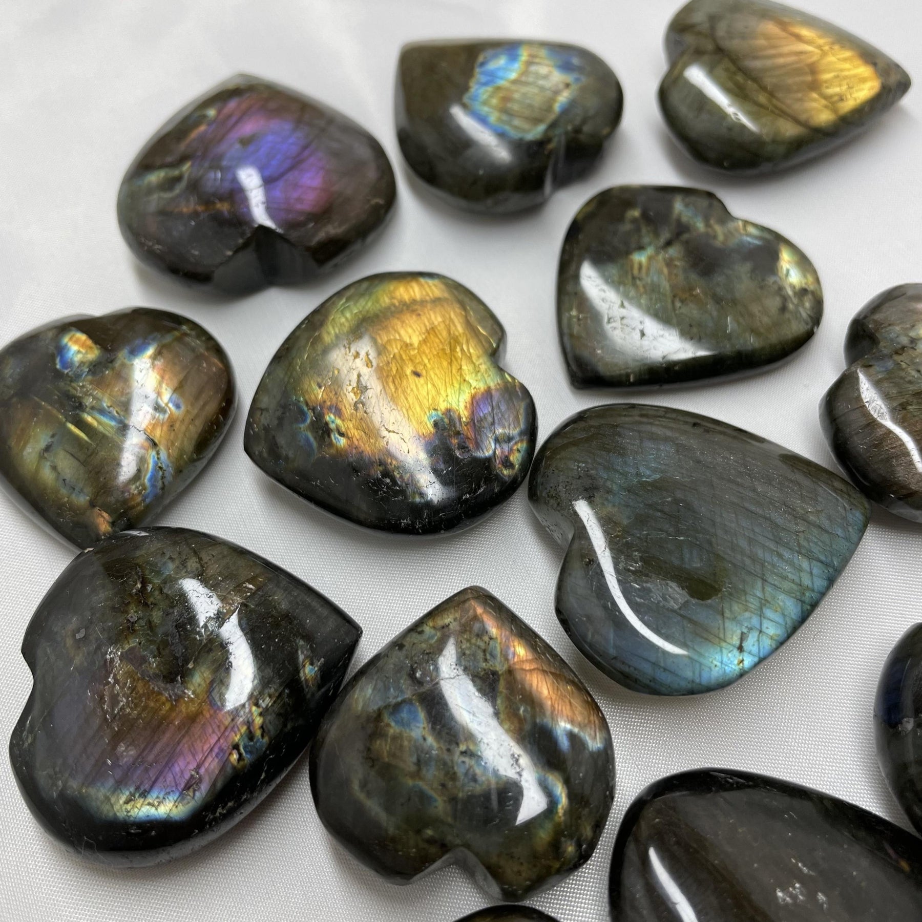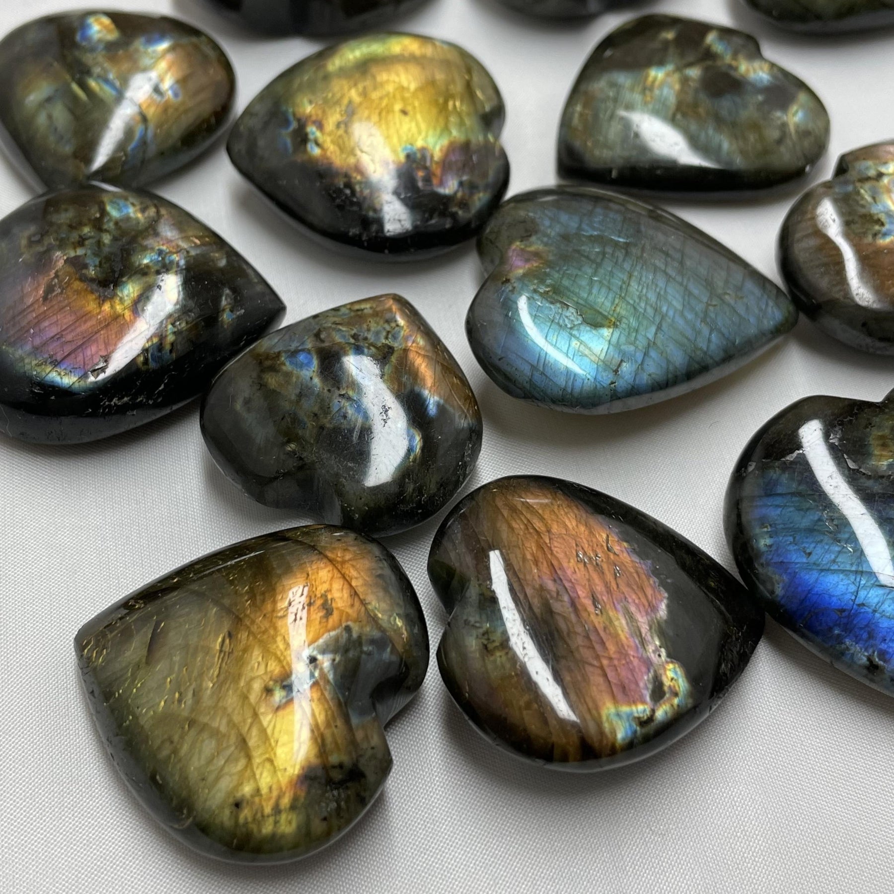 This unique Labradorite heart palm stone is perfect for Reiki healing and spiritual energy. Enhance your decor with this stunning crystal.