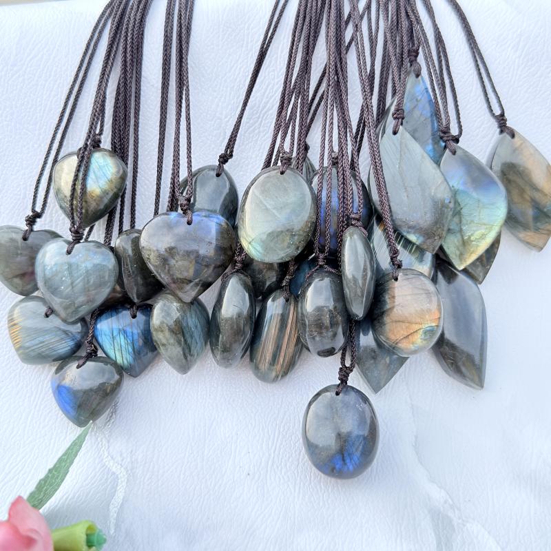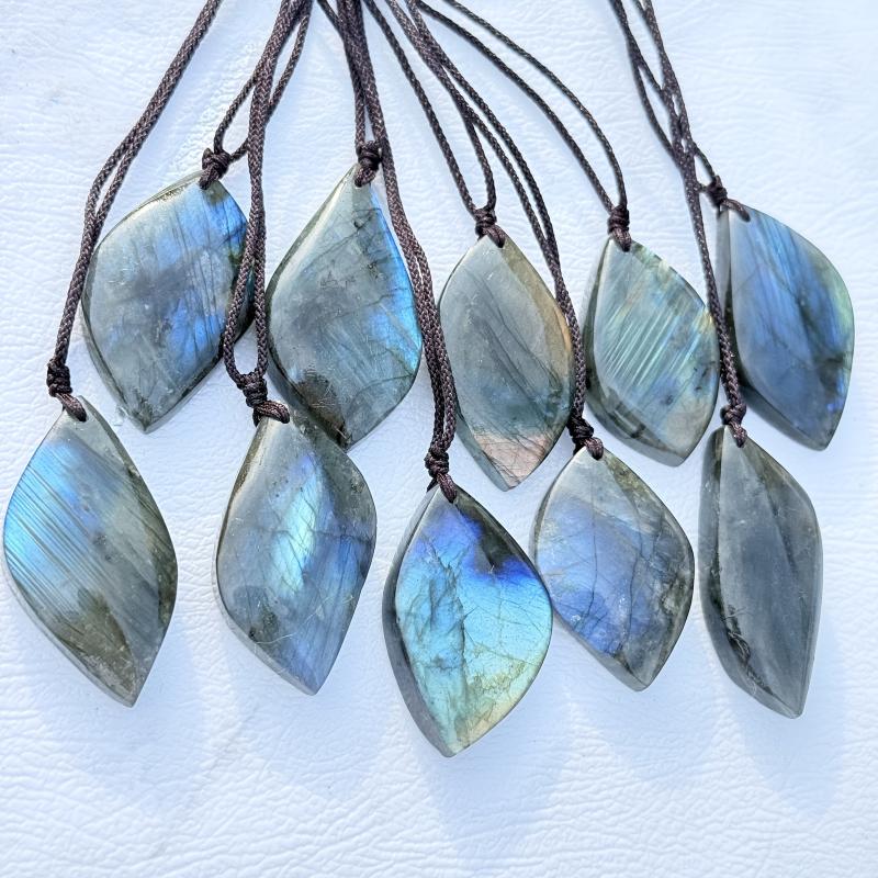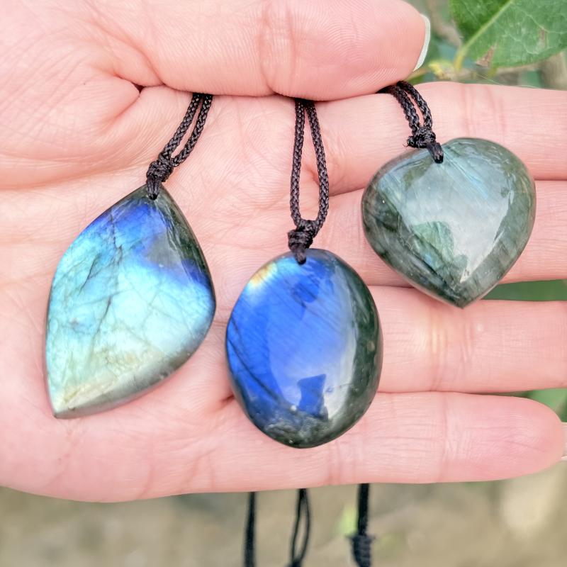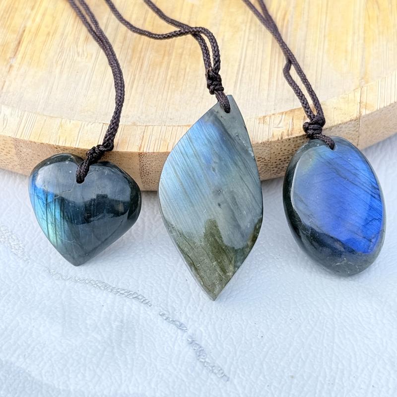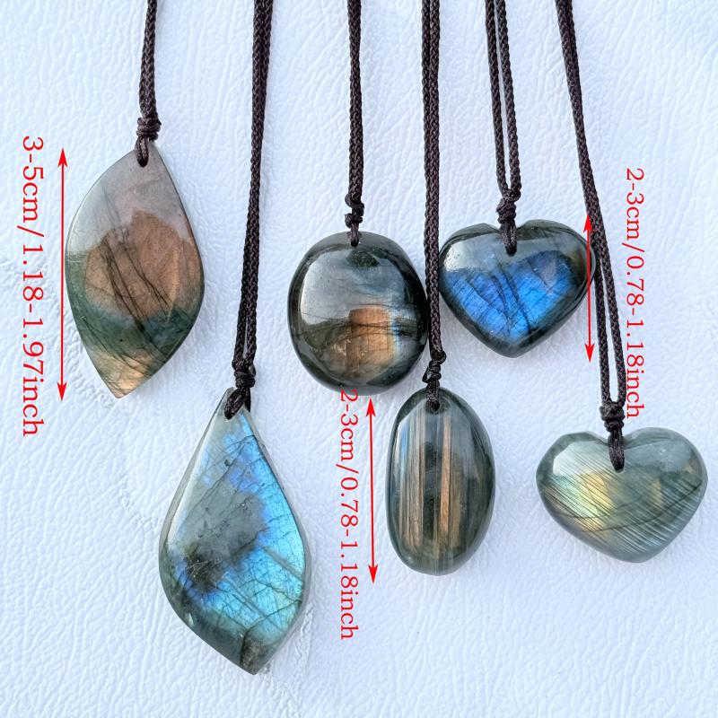 Embrace the mystical beauty of labradorite with this 3-piece set featuring a heart-shaped pendant, palm stone and leaf necklace. This bohemian jewelry is perfect for women seeking spiritual connection.