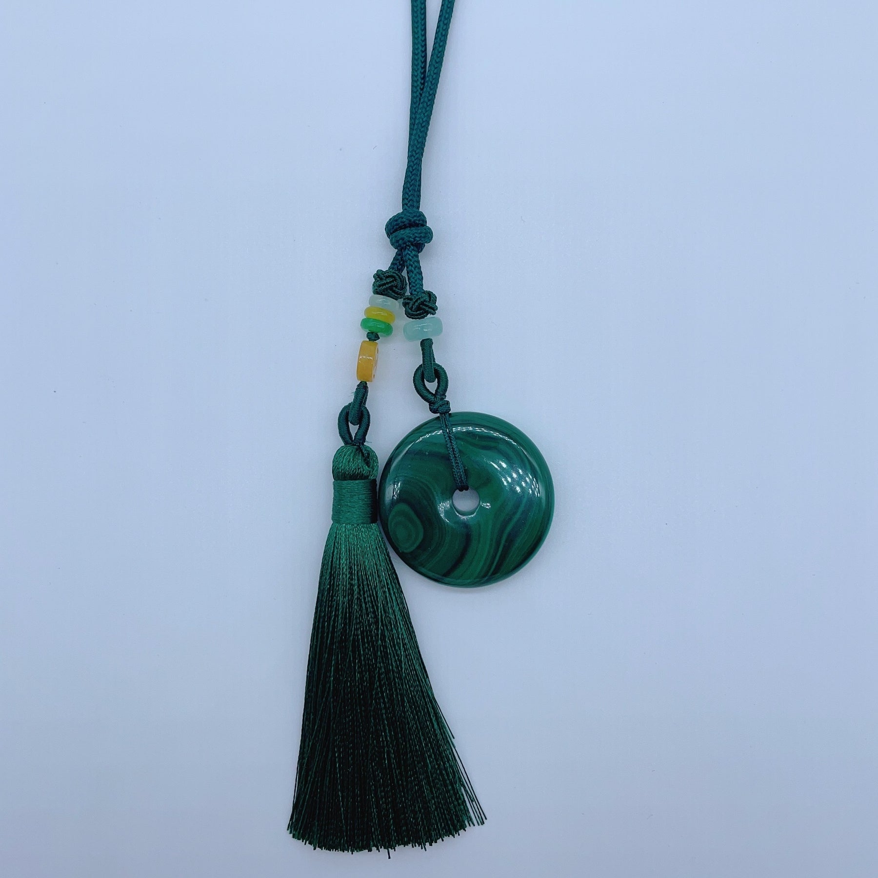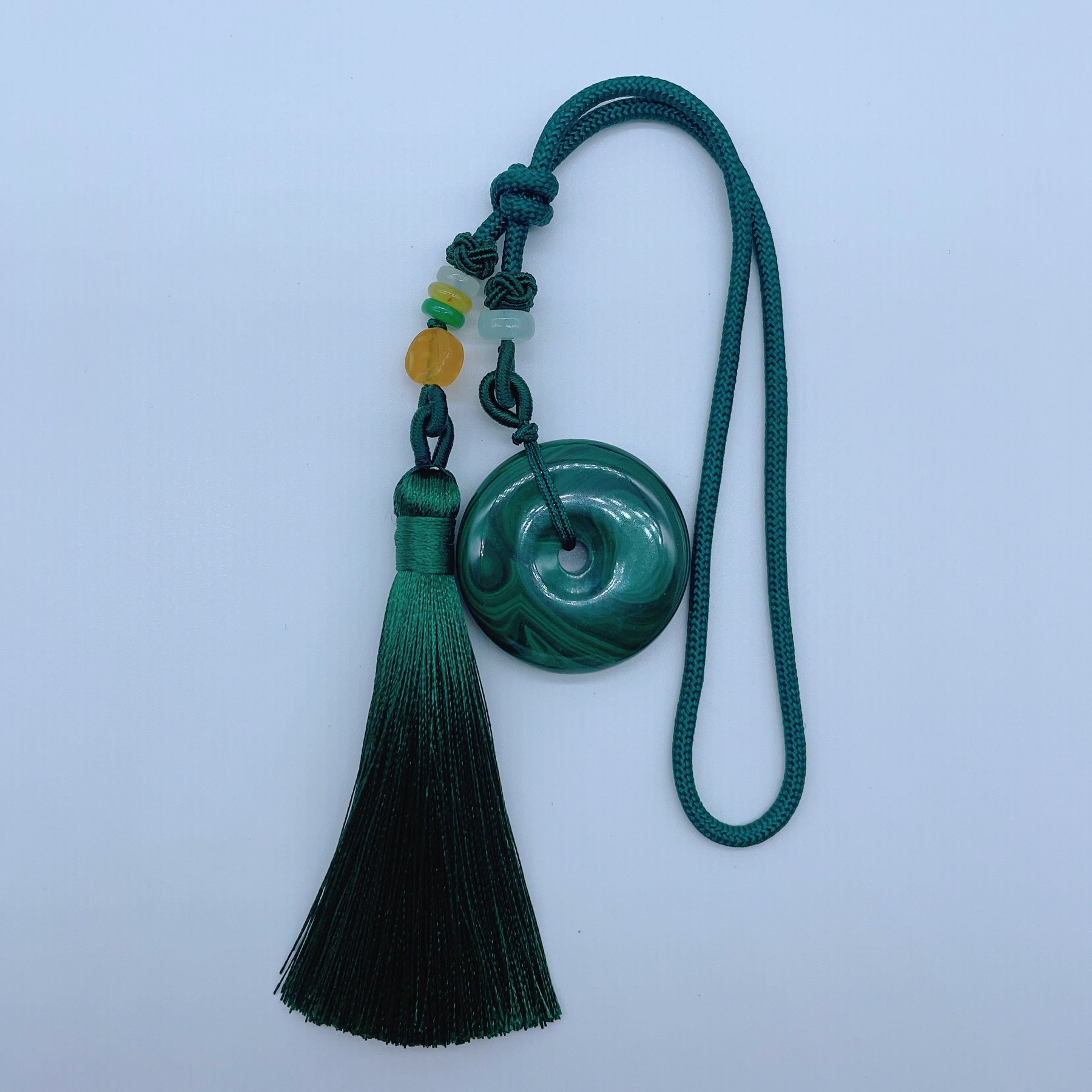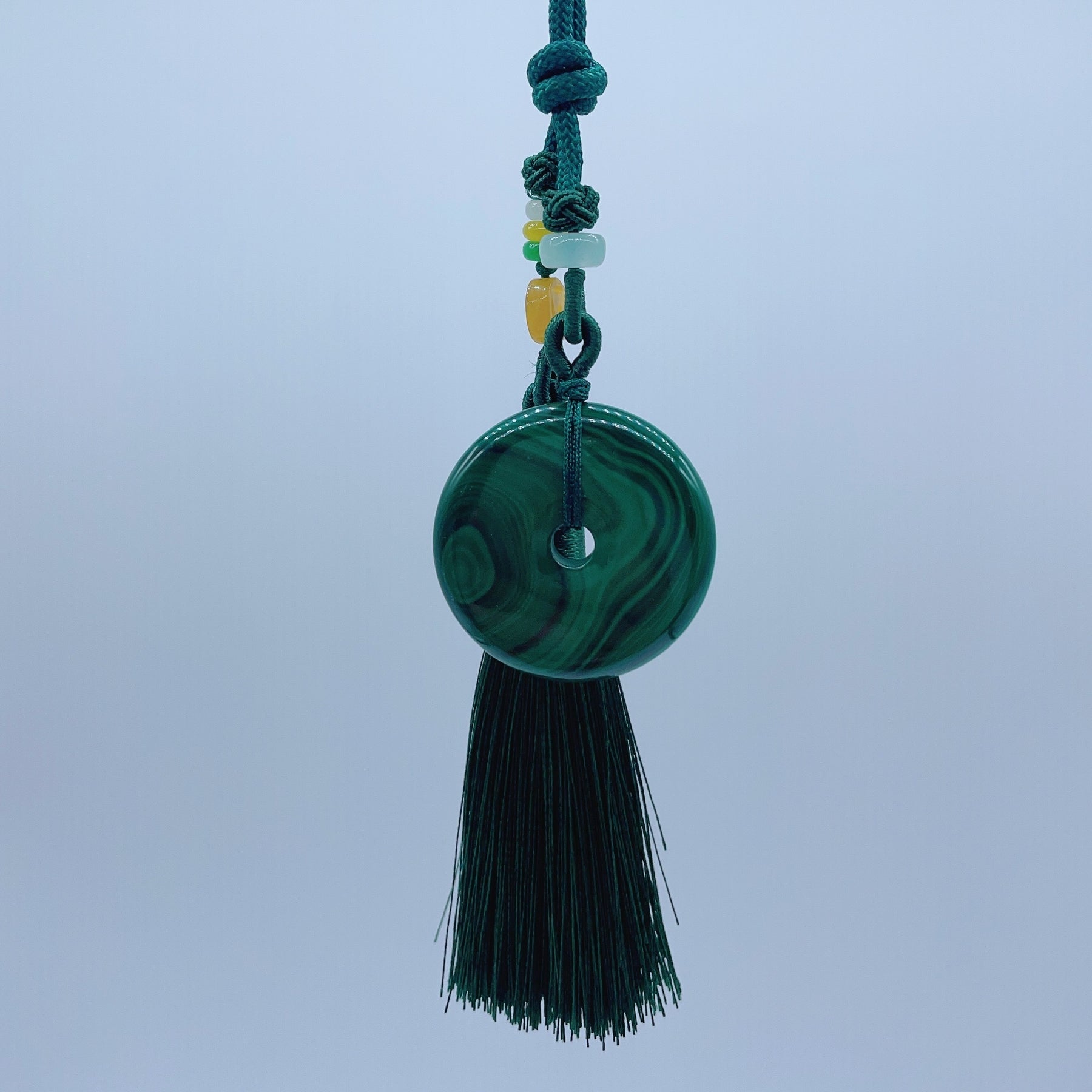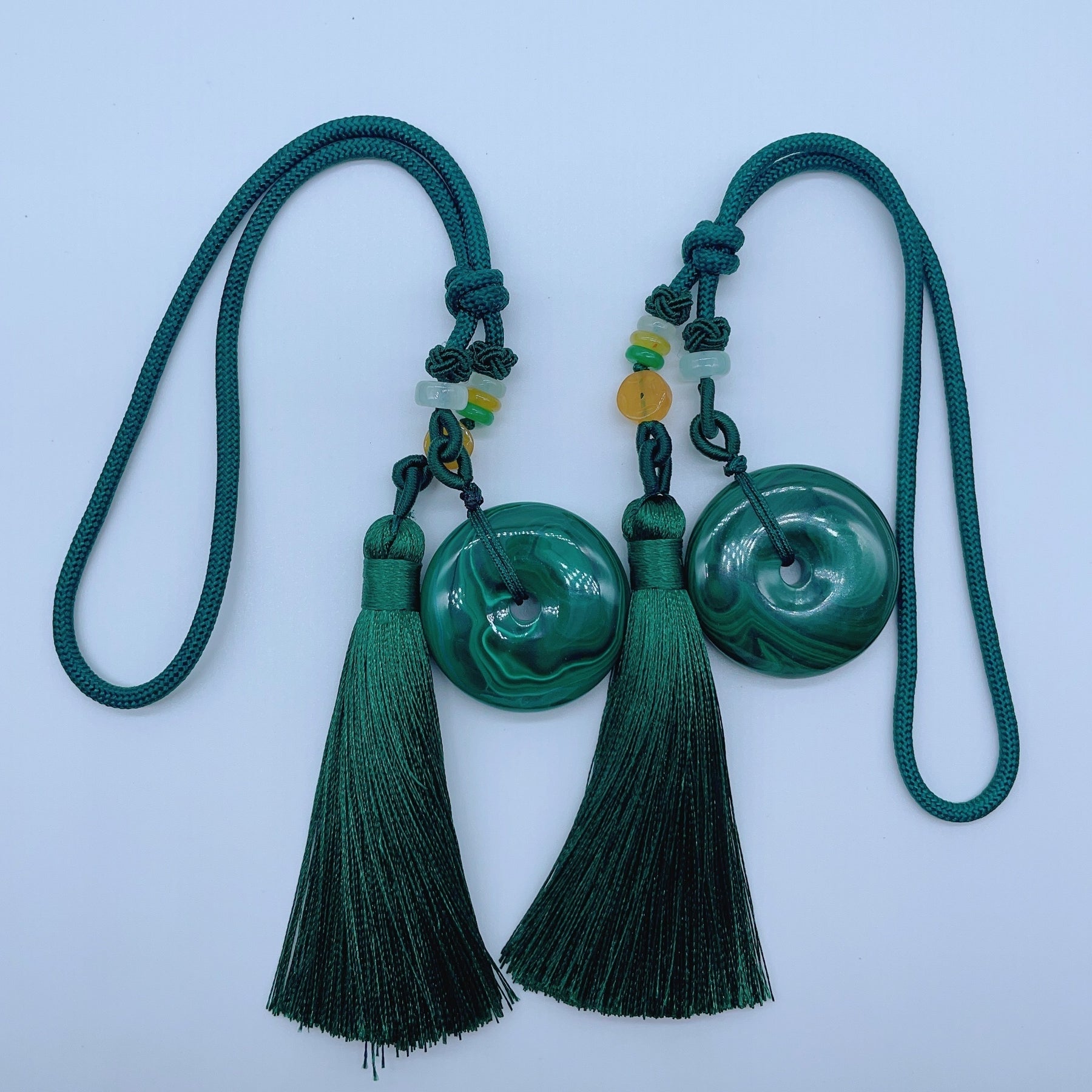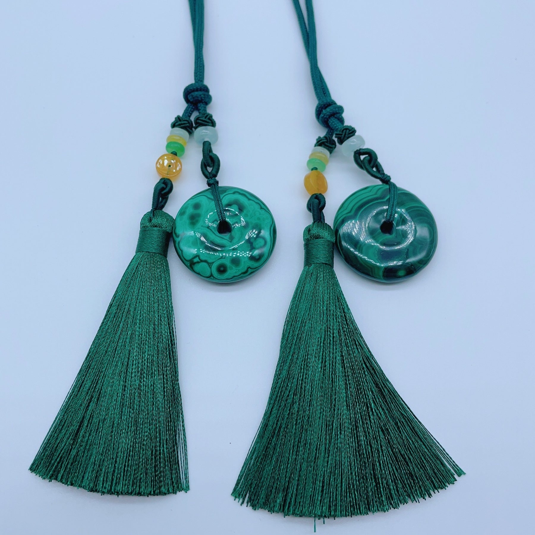 Elevate your space with these natural malachite pendants and tassels that come with a durable cord for hanging. Perfect for home or car mirror decorations.