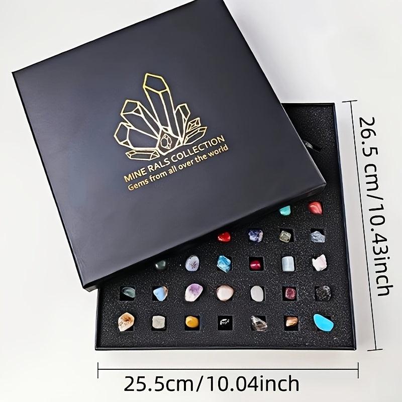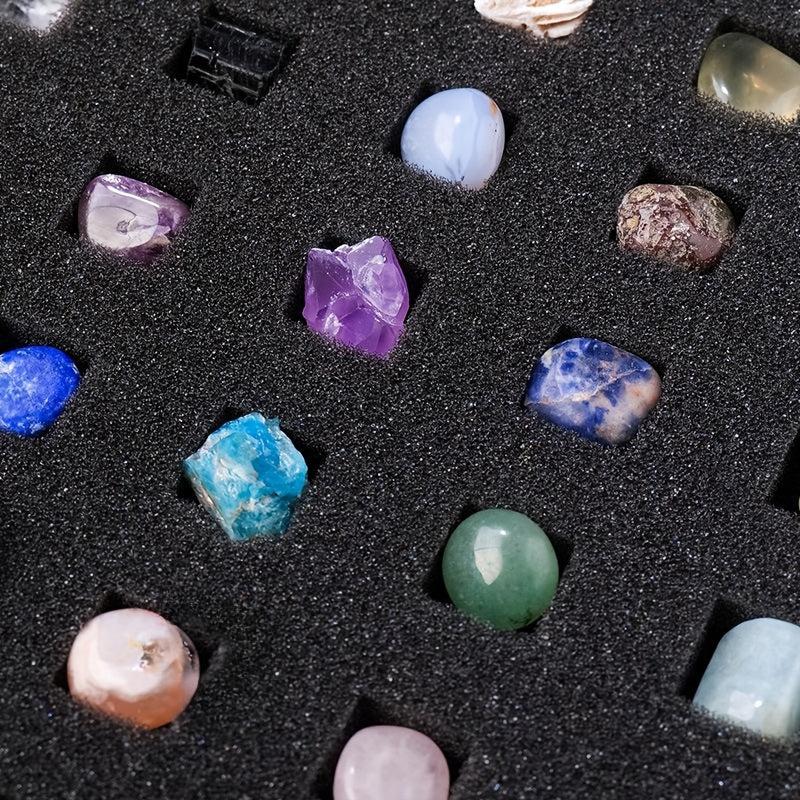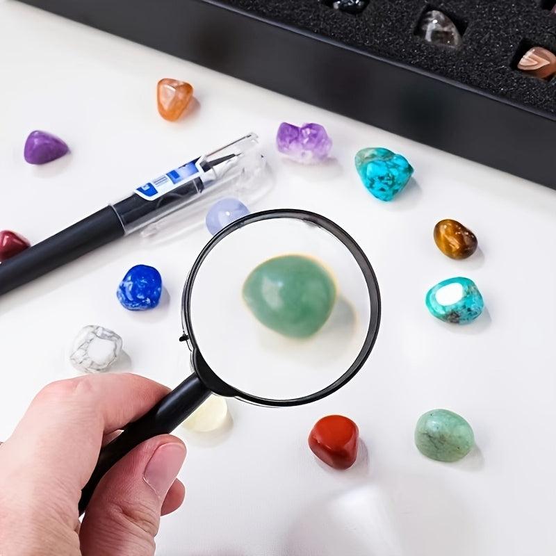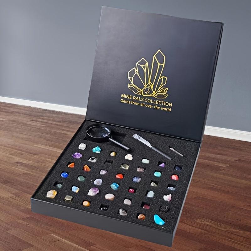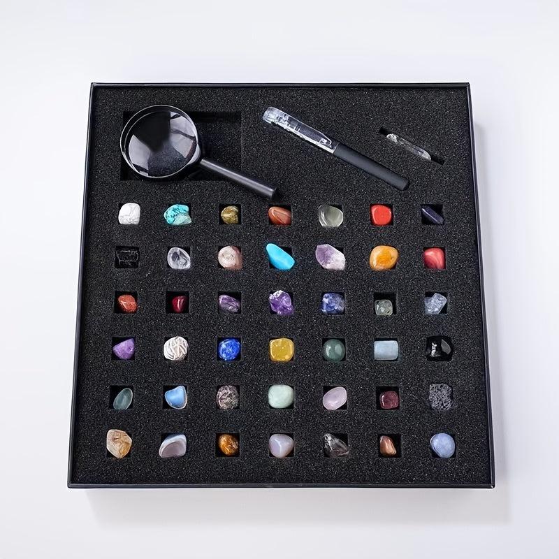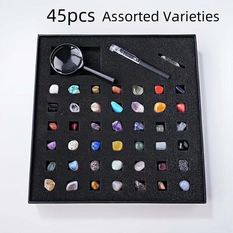 This mineral specimen box set includes 43 different mineral specimens, 2 magnifying glass pens, and is perfect for beginners. Ideal for holidays or as a gift.