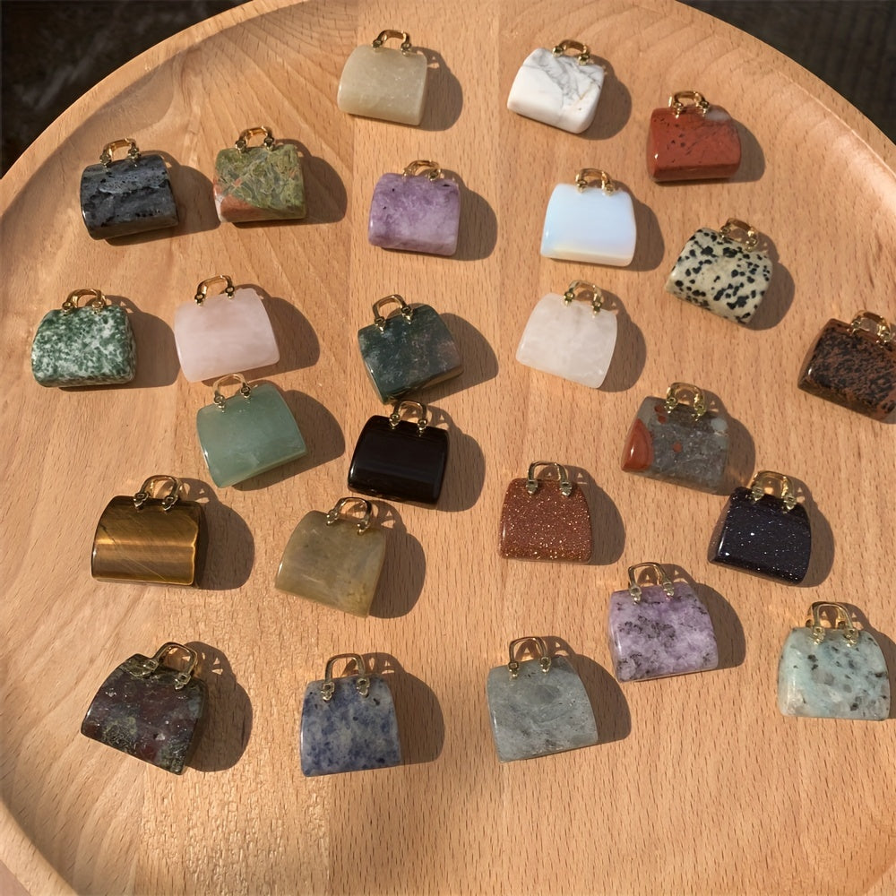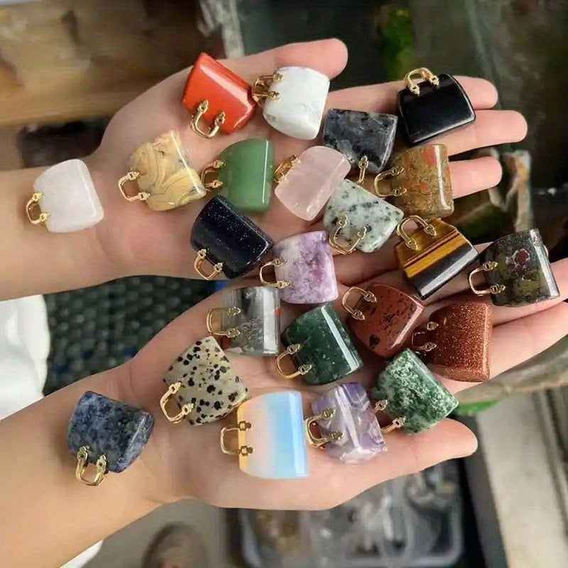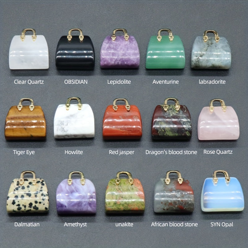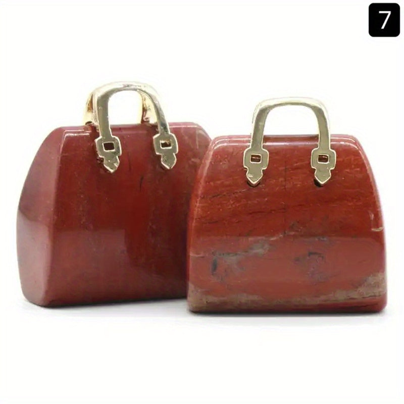 This hand-carved mini bag ornament features natural green crystal stones including amethyst and rose quartz. Perfect as a tabletop decoration or gift for wife, girlfriend, or mom.