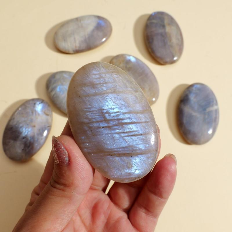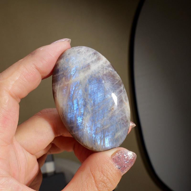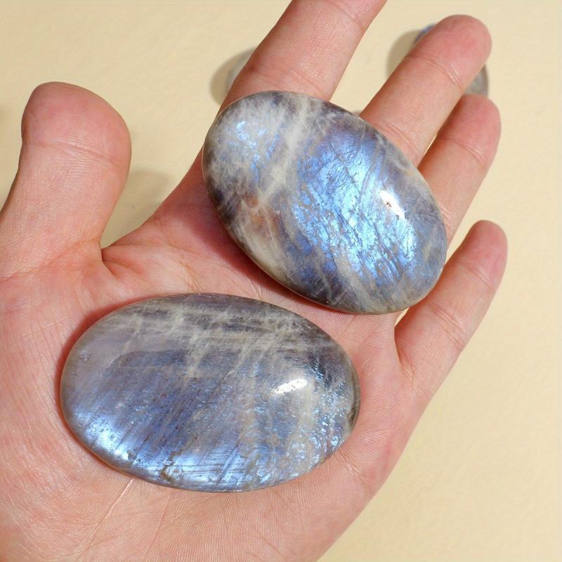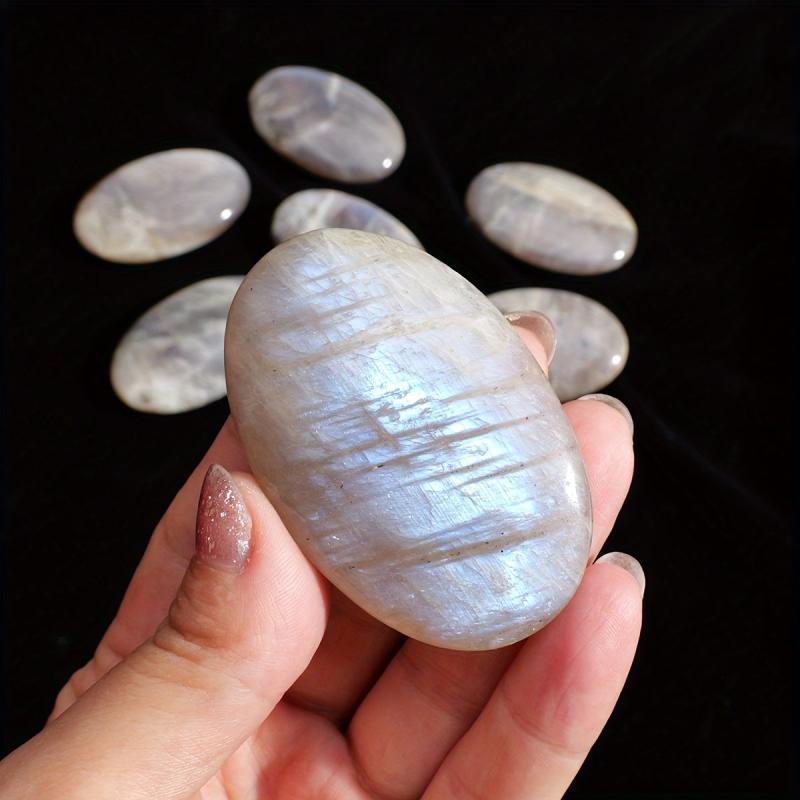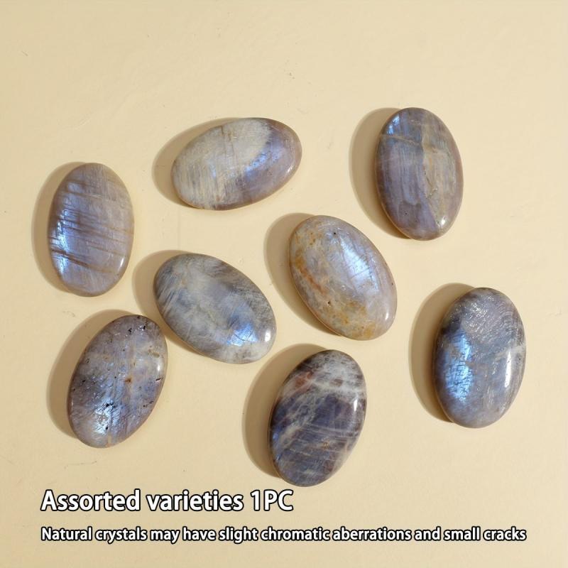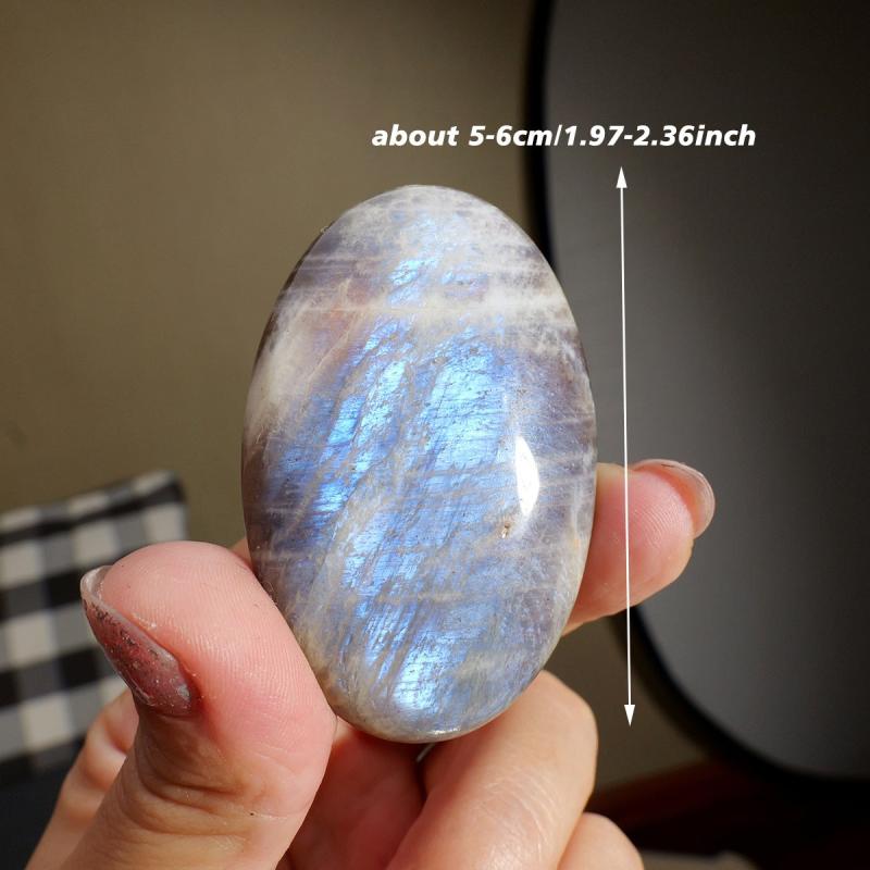 Experience the soothing energy of this vibrant Moonstone play stone. Perfect for home use, this oval-shaped worry stone has a smooth surface for relaxation.