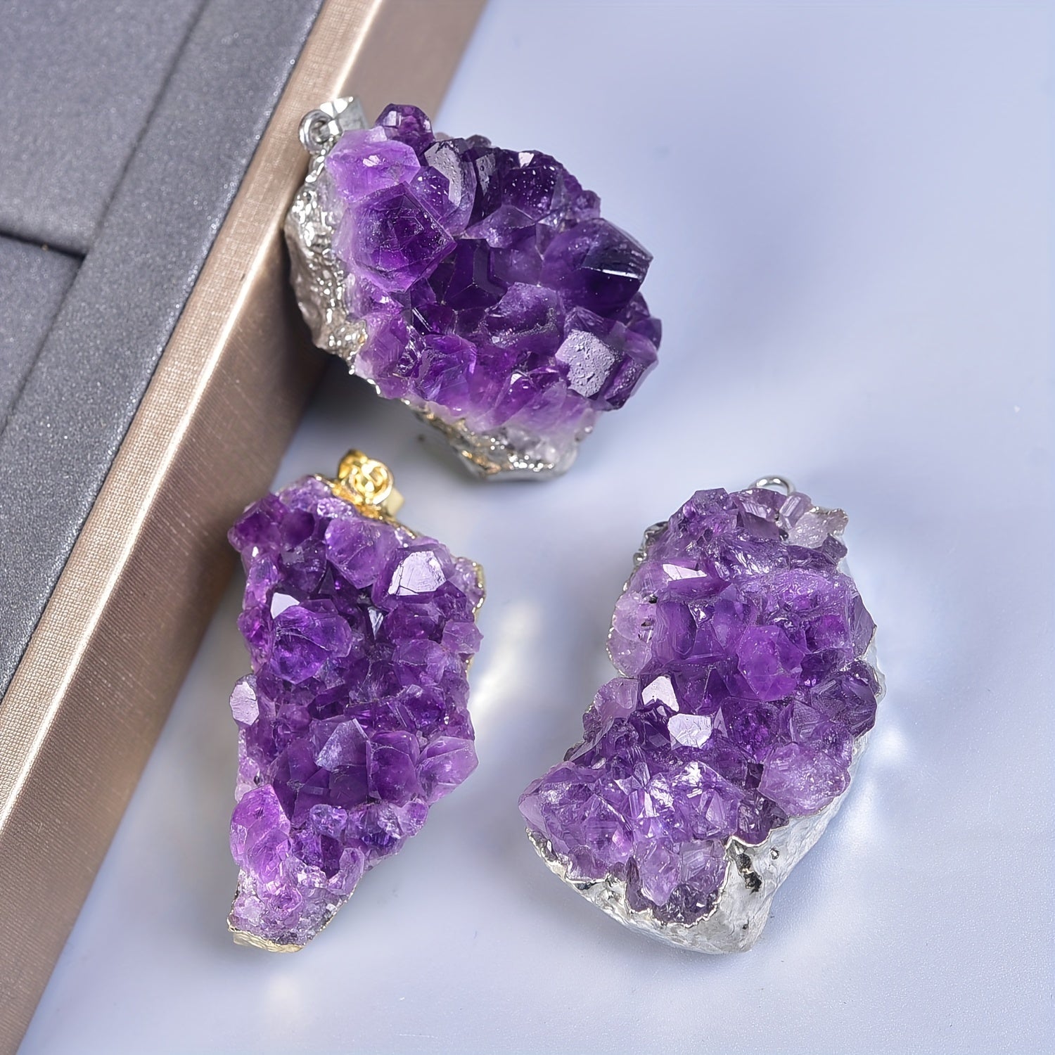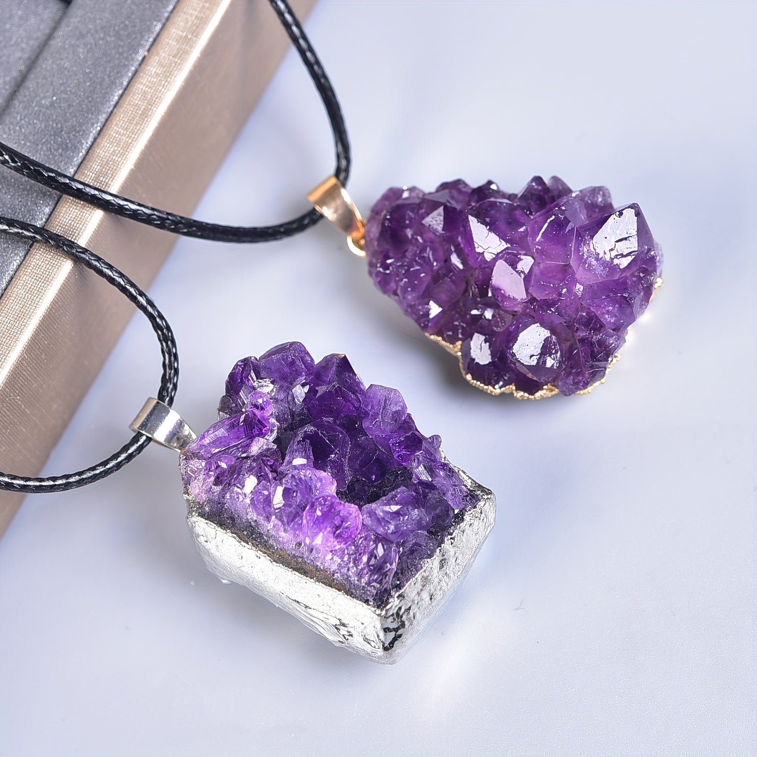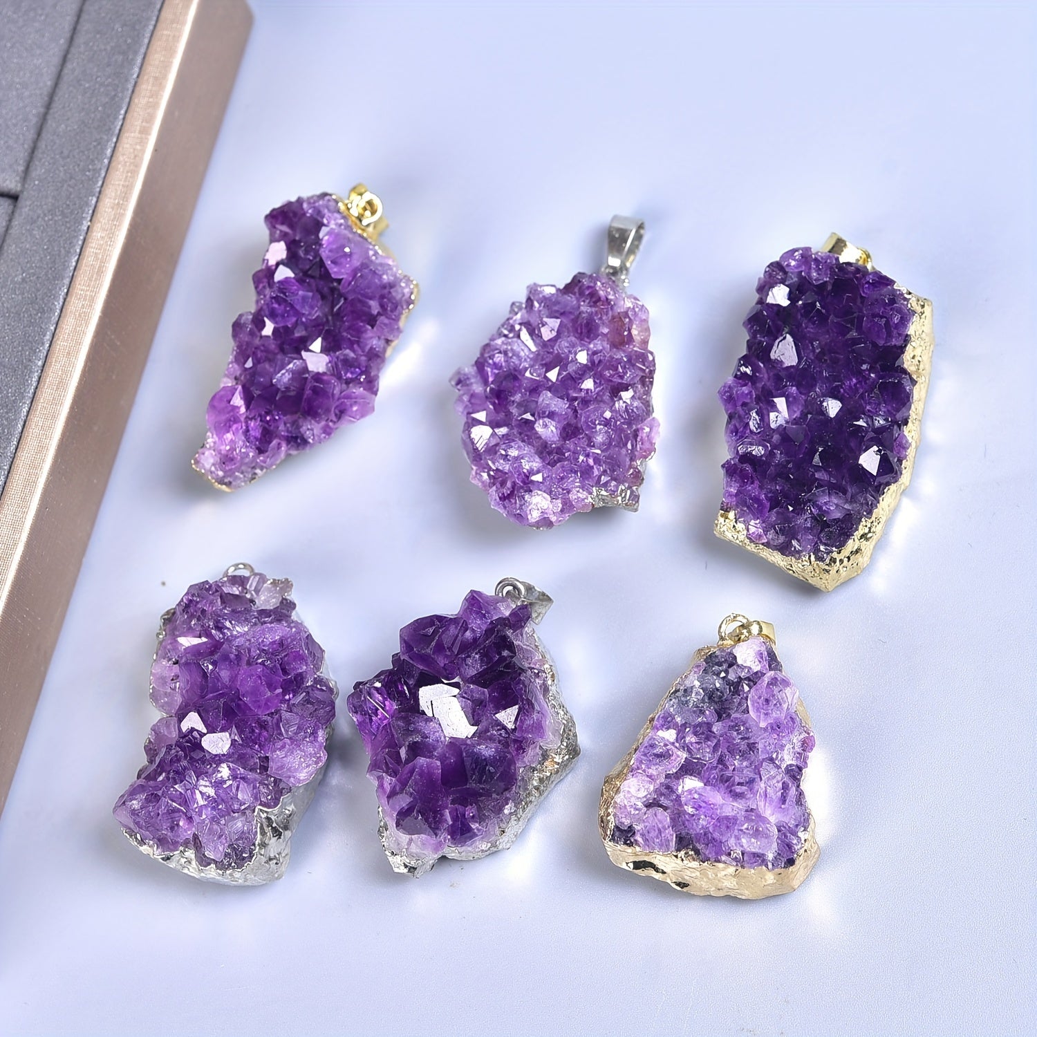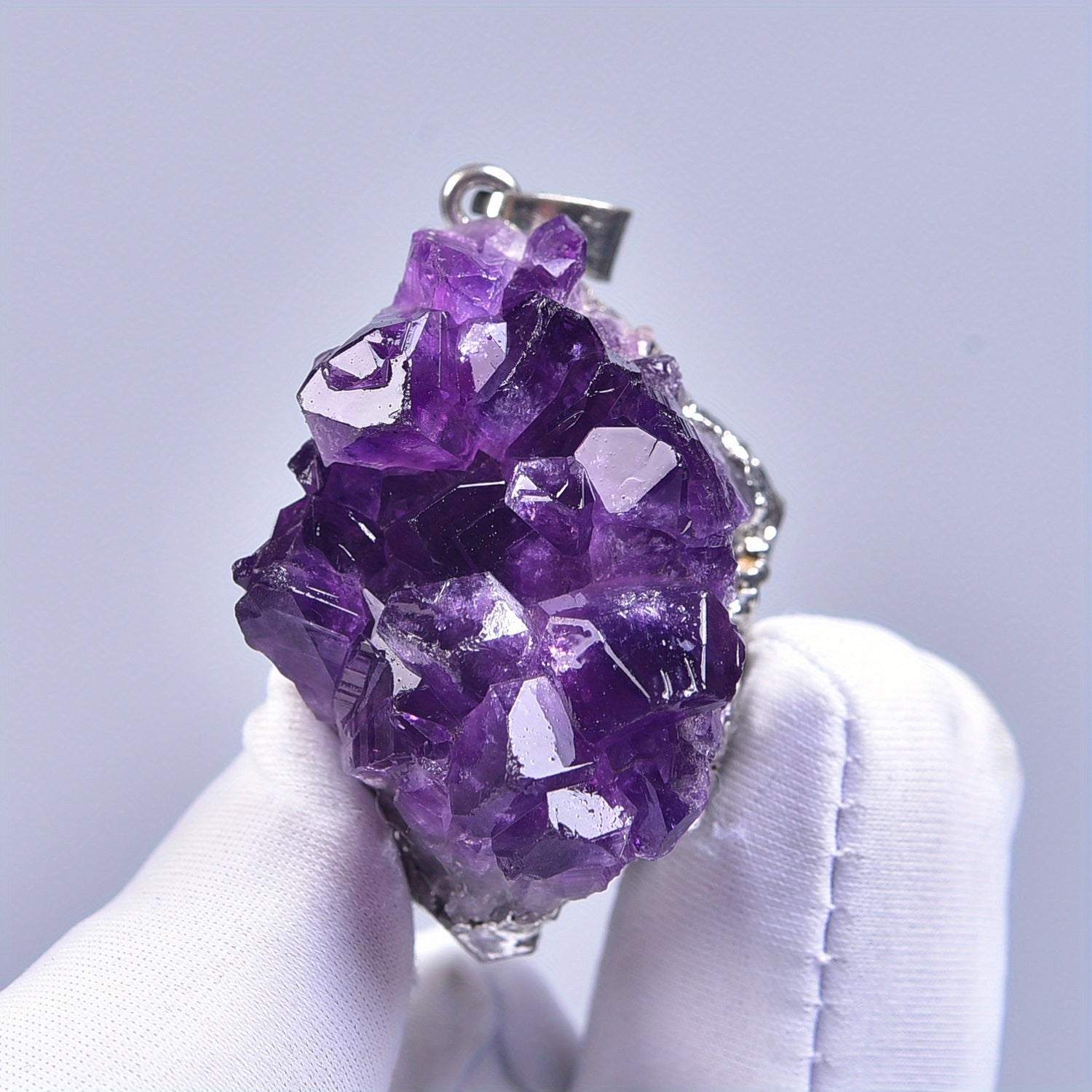 This natural amethyst cluster pendant is perfect for creating unique and elegant jewelry pieces. Each pendant is made from a genuine amethyst cluster, showcasing the natural beauty of the stone.