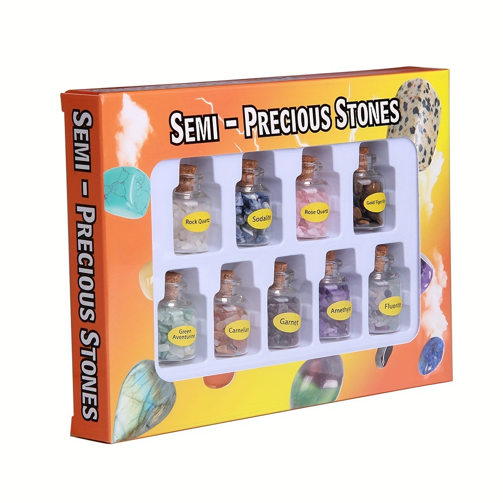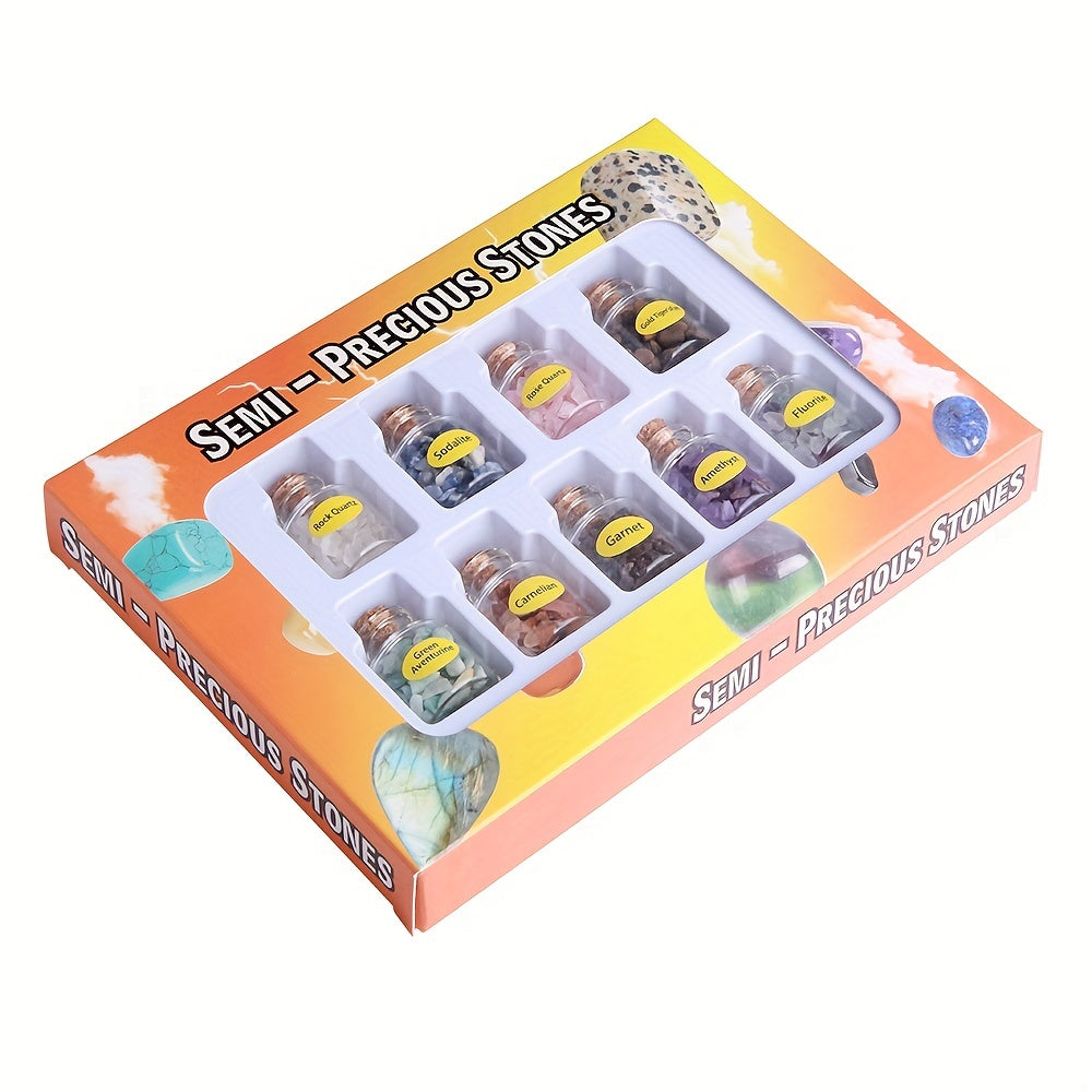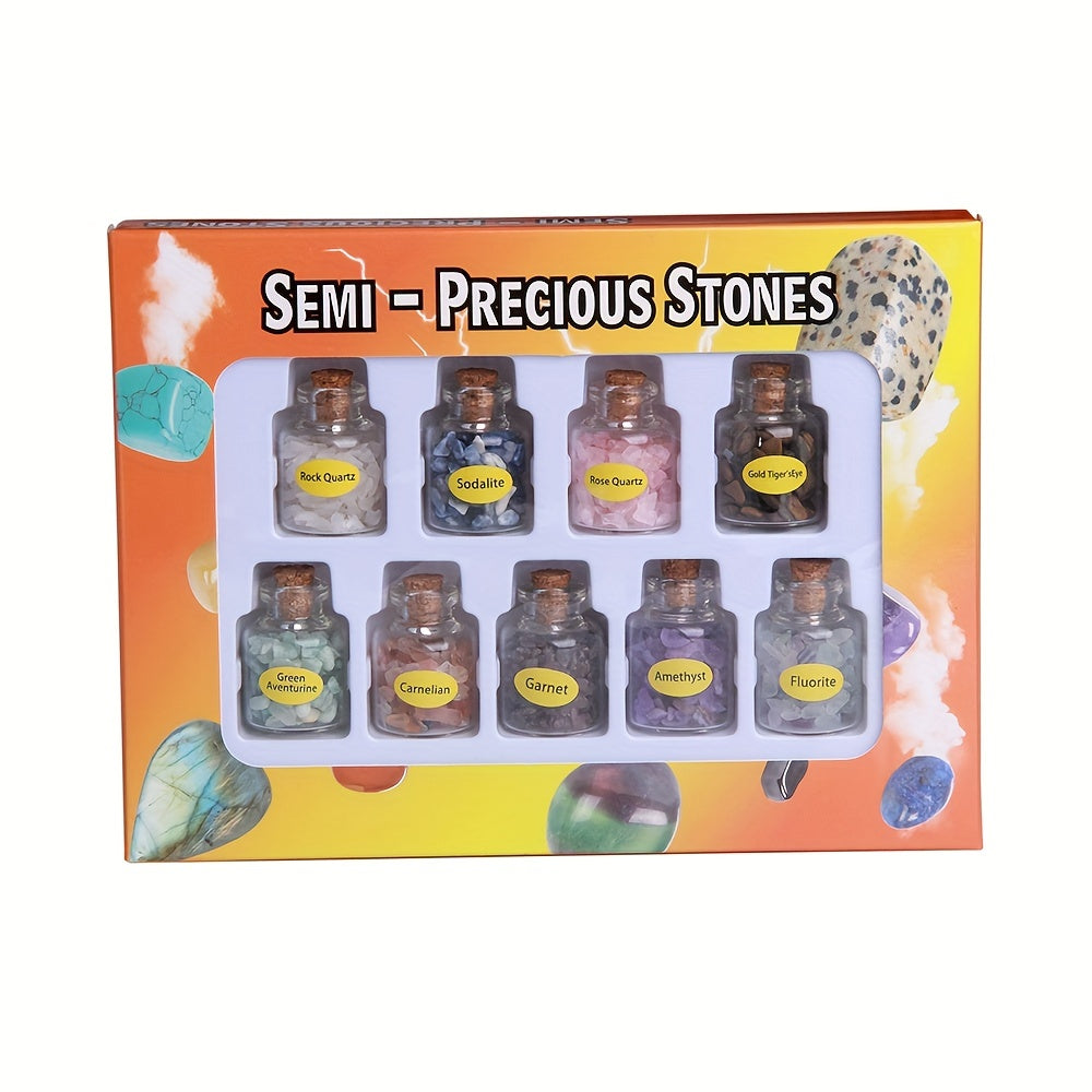 This collection includes 9 bottles of crushed stones perfect for making wishing bottles or drifting bottles. Each bottle contains different natural crystal gem ore specimens ideal for teaching purposes.