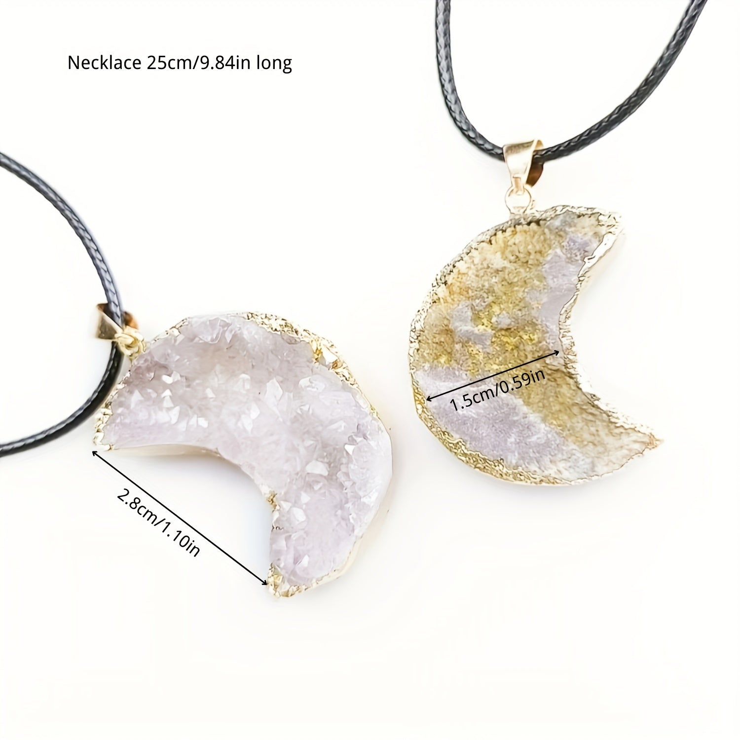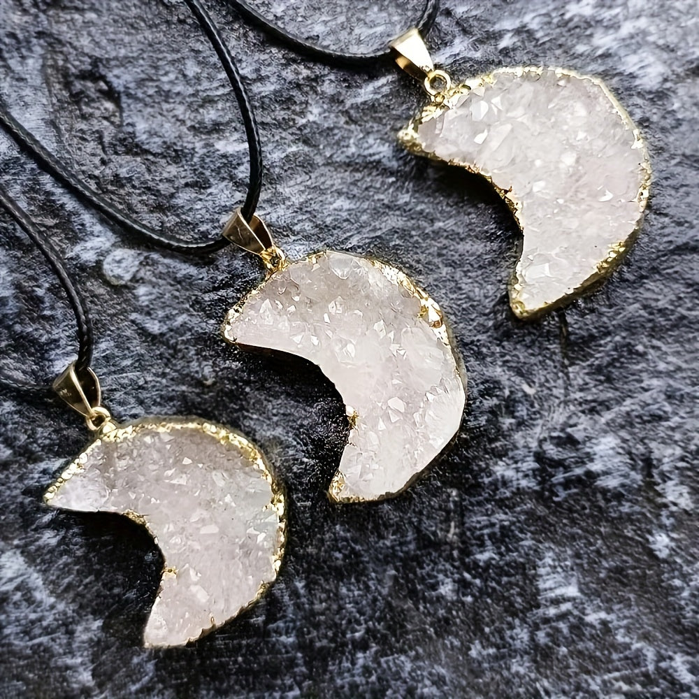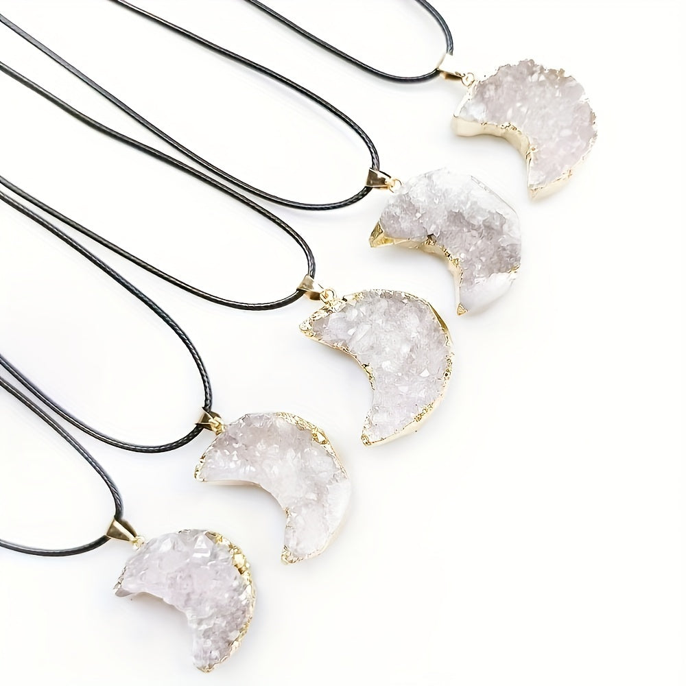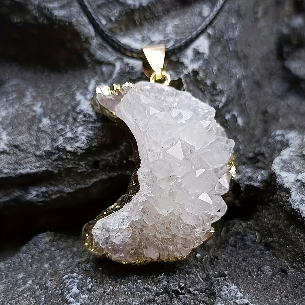 Add a touch of celestial beauty to your outfit with this stunning moon pendant necklace featuring a rough natural crystal stone with electroplated trim. Perfect for any occasion, this unique necklace is sure to make a statement.