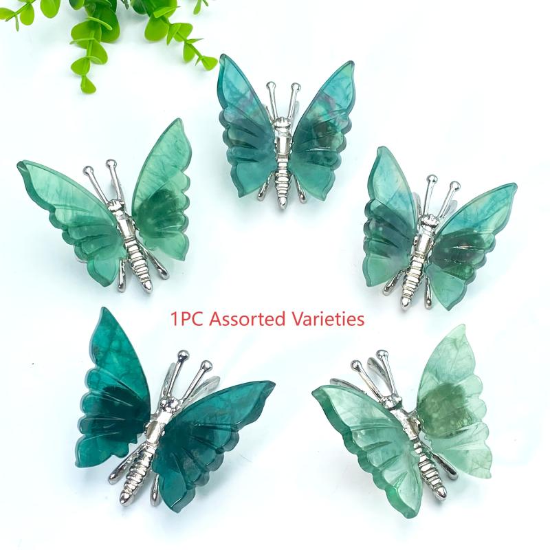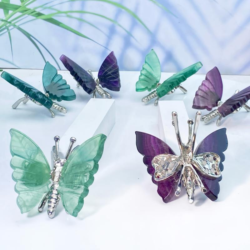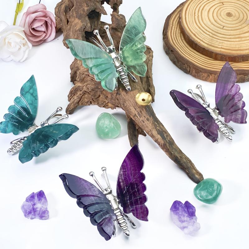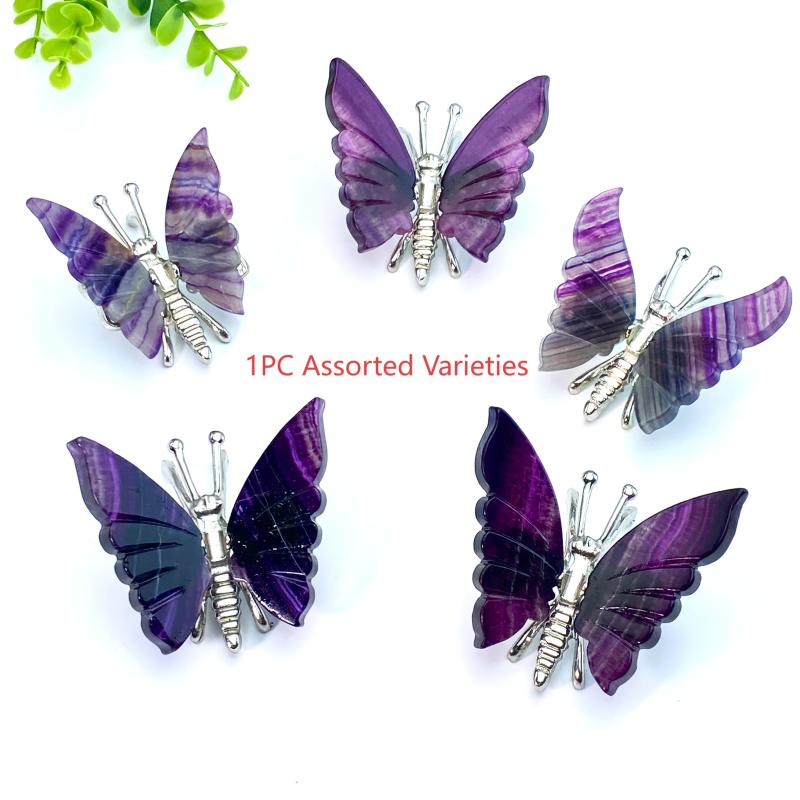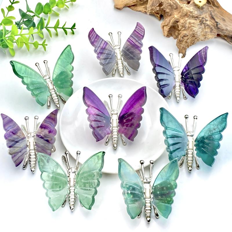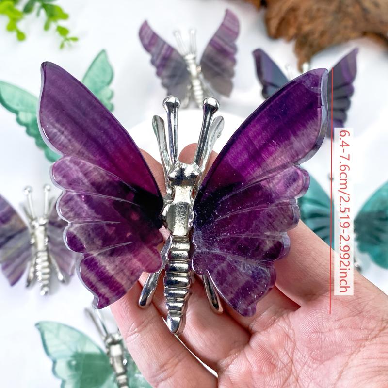 This exquisite natural fluorite butterfly stone carving features pastel purple, green, turquoise colors with metallic-like accents. Perfect for home decor, office display, or jewelry making.