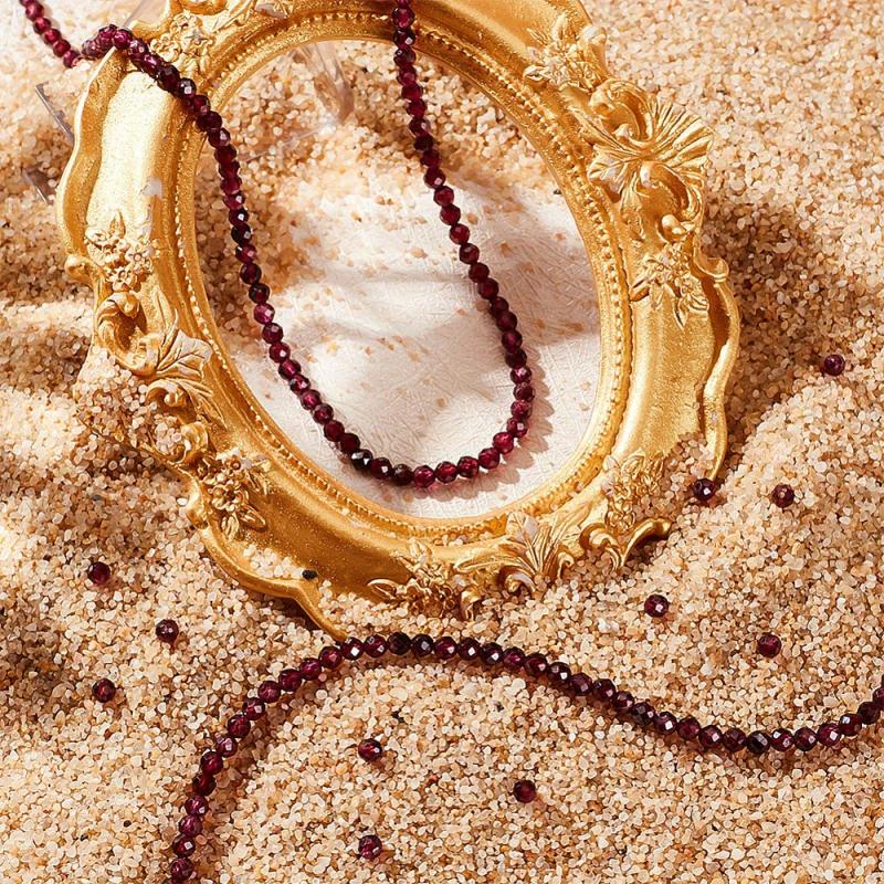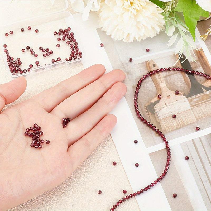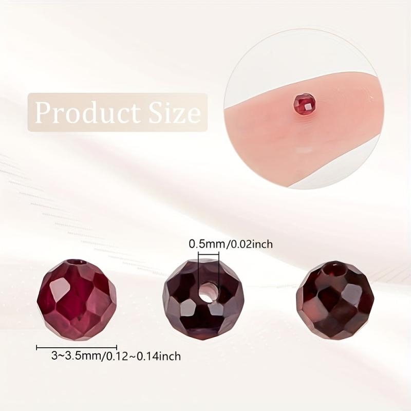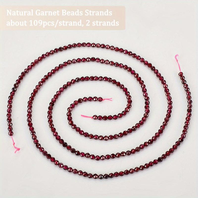 Get two strands of approximately 218pcs natural garnet beads with AB round faceted design. Each strand contains about 109pcs of beads with a hole size of 0.5mm. The beads are 3-5mm in size and the strands are 15 inches long.
