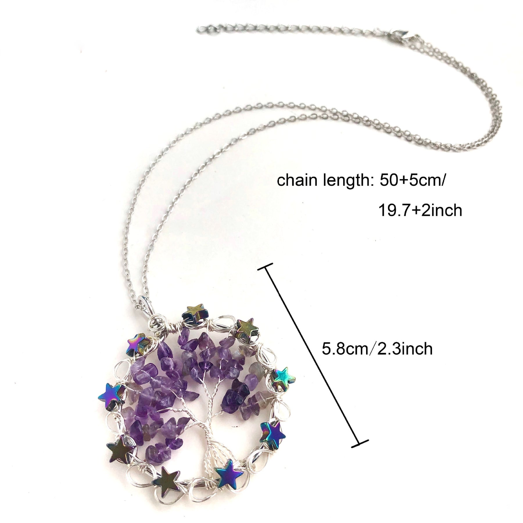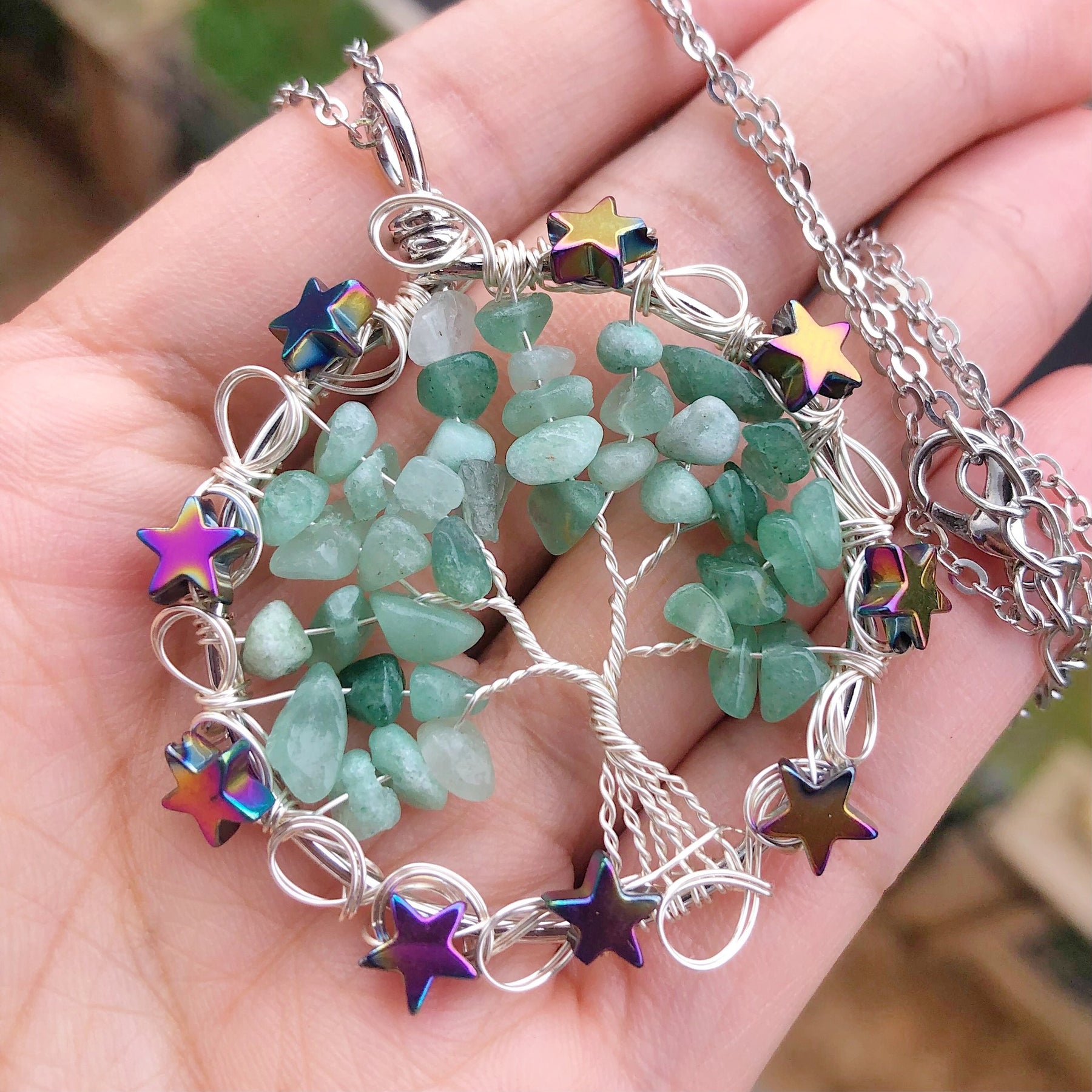 This beautiful pendant necklace features a natural gemstone Tree of Life design with a Moon and Star. It serves as a Reiki healing amulet and a stunning piece of jewelry.