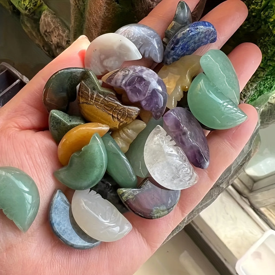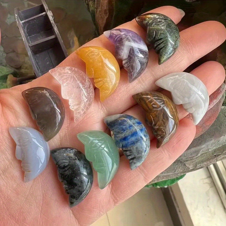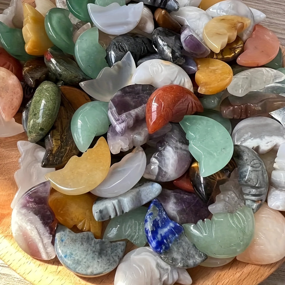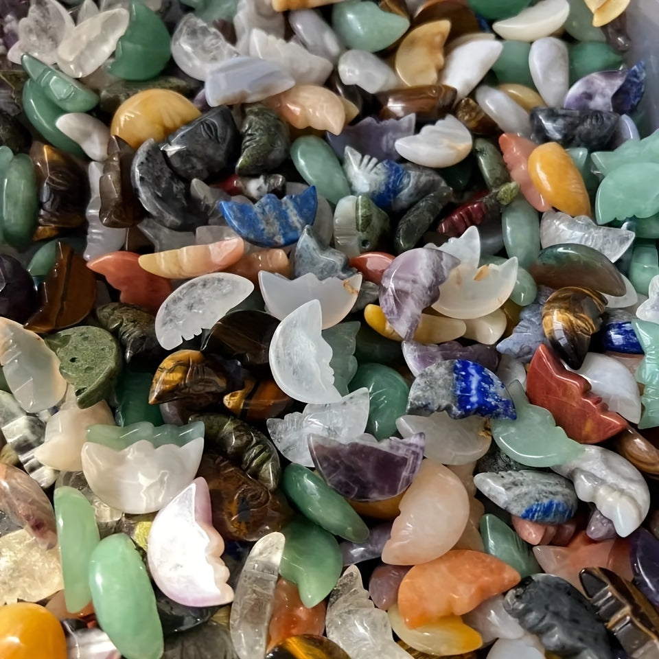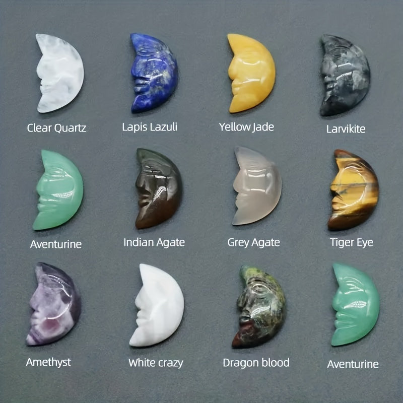 This bag contains 5, 10, 20, or 50 pieces of 26x15mm natural healing crystals in the shape of a human face moon. These gemstones are perfect for jewelry making and as decorative ornaments.