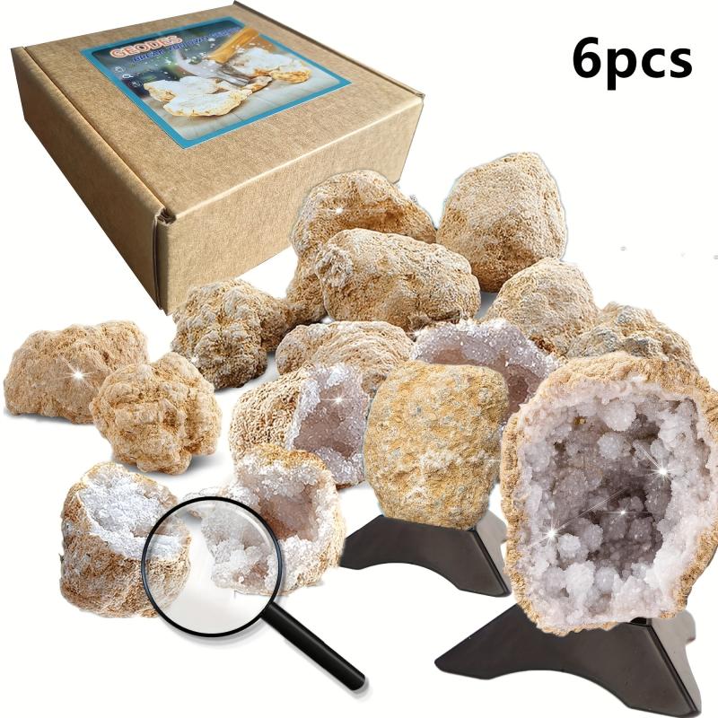 Explore the beauty of natural quartz geode specimens with this DIY kit that includes a magnifying glass and stand. Perfect for rock and crystal enthusiasts.
