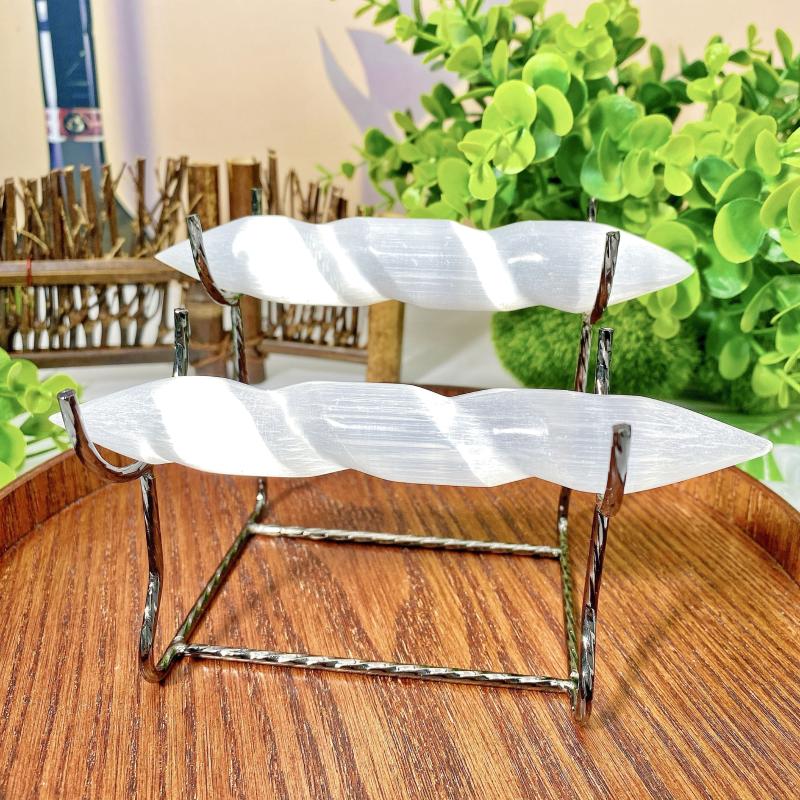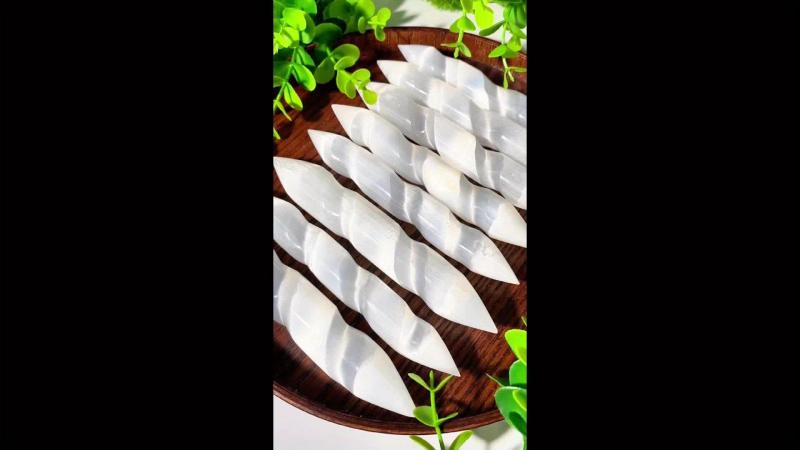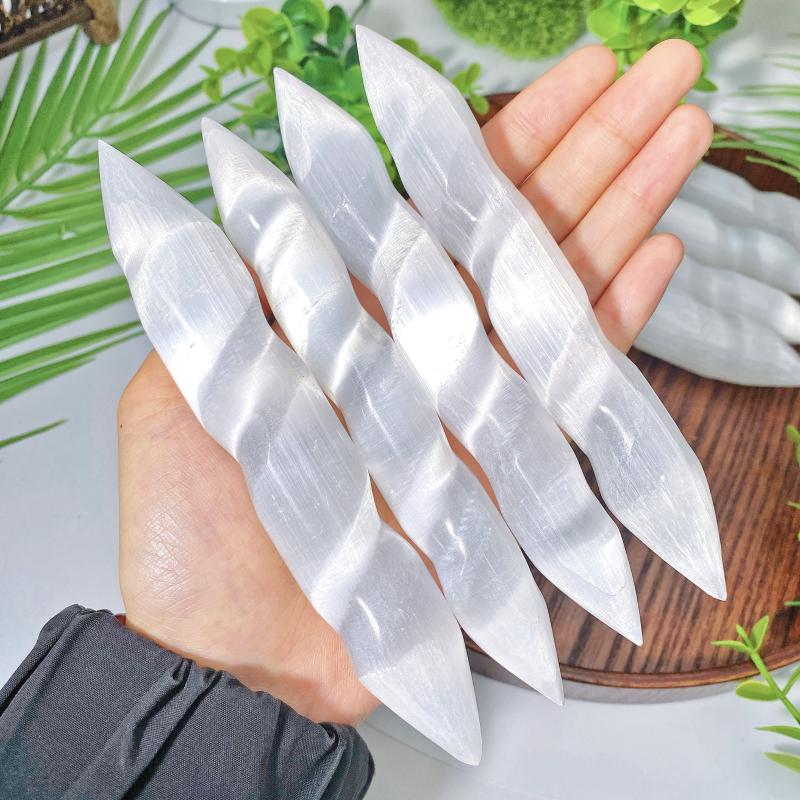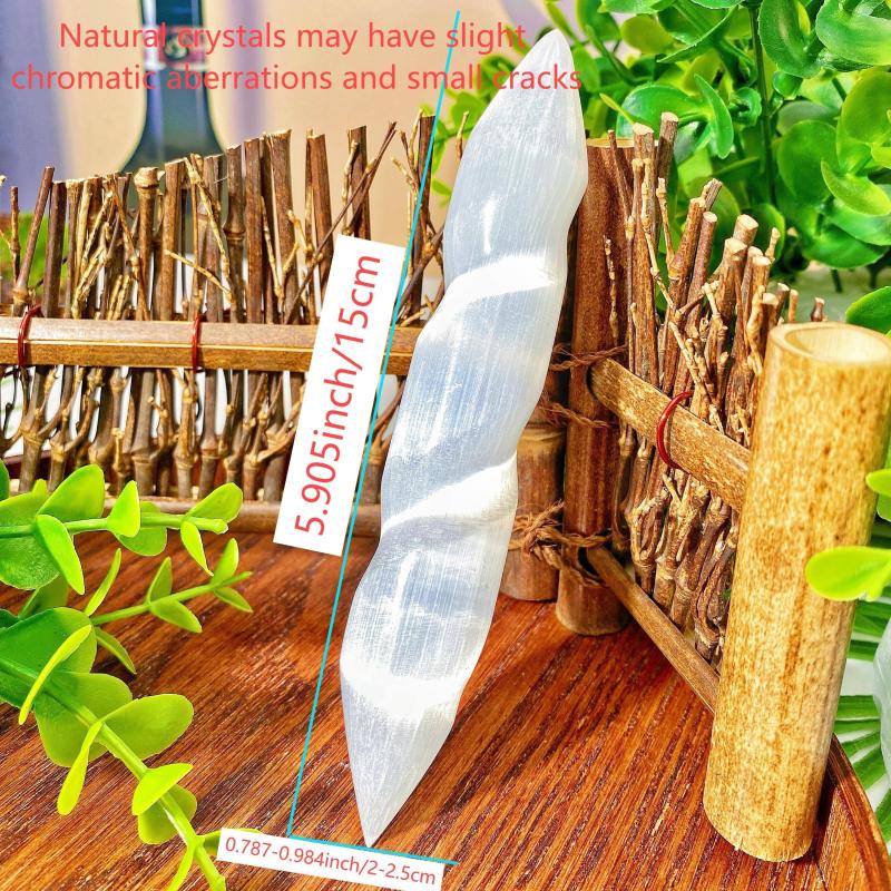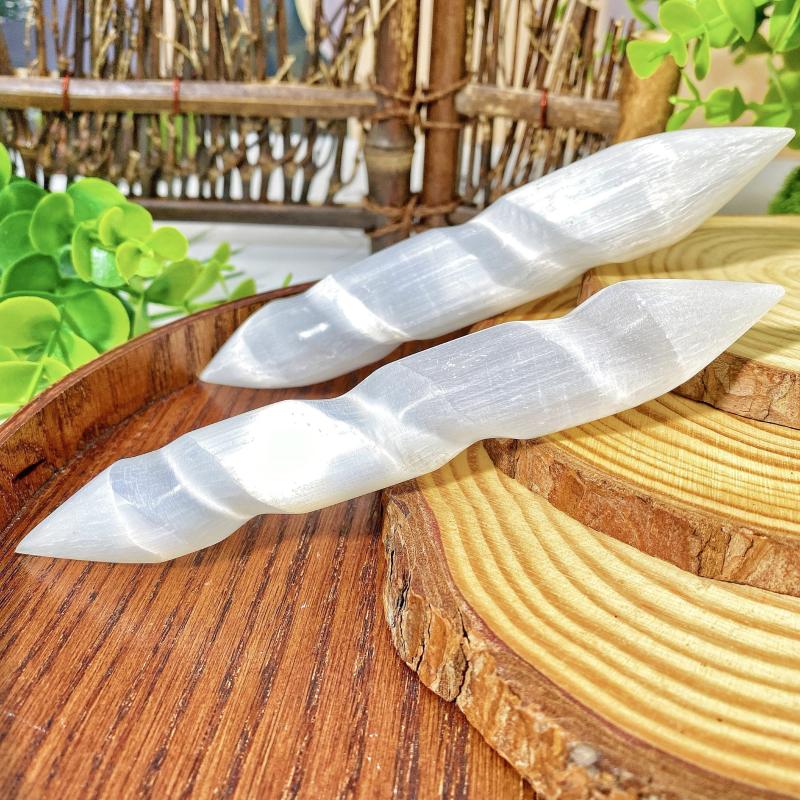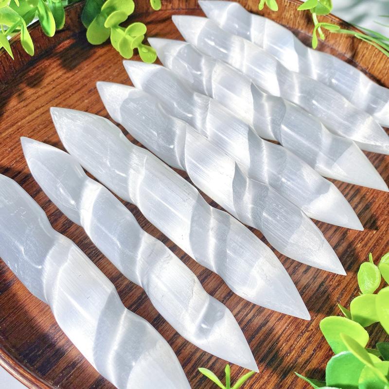 This raw selenite crystal double tipped spiral point is perfect for DIY projects. It has a natural rivet style appearance.