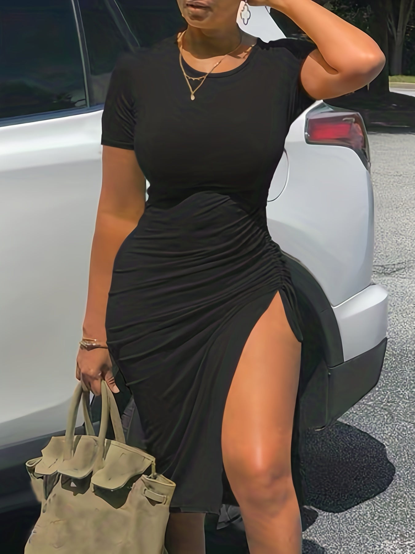 This Ombre print dress is perfect for summer and spring with its ruched design, side slit, short sleeves, and crew neck. Stay stylish and comfortable with this casual dress.
