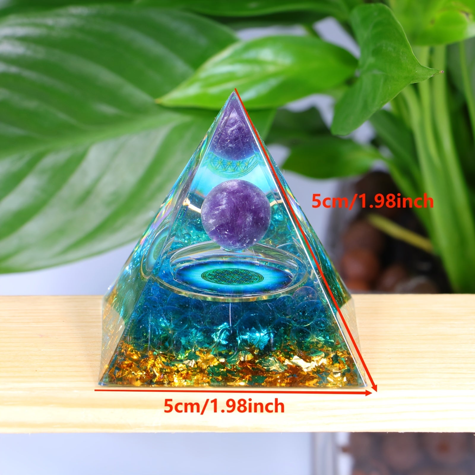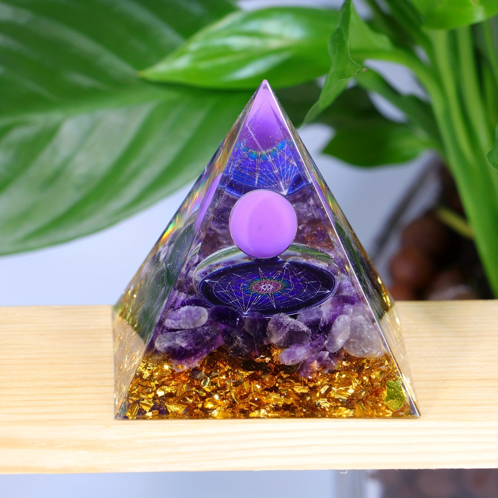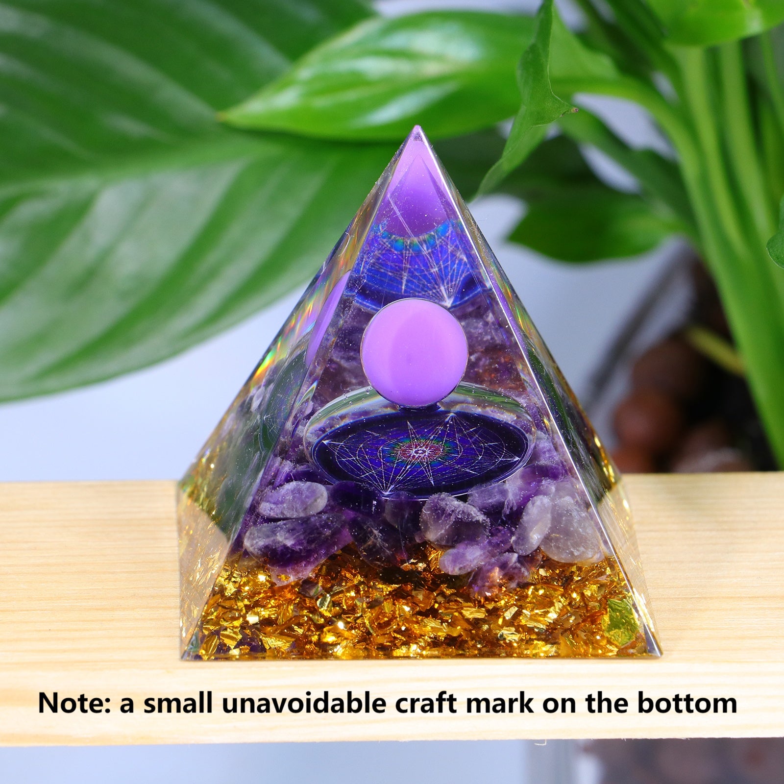 Enhance positivity and protection with this orgone pyramid featuring an amethyst crystal ball. Ideal for stress reduction, healing, meditation, and overall well-being.