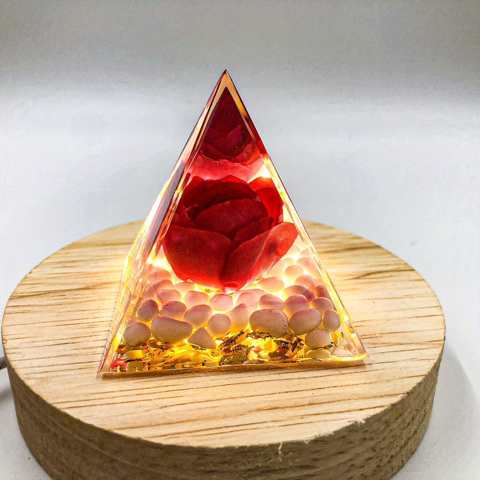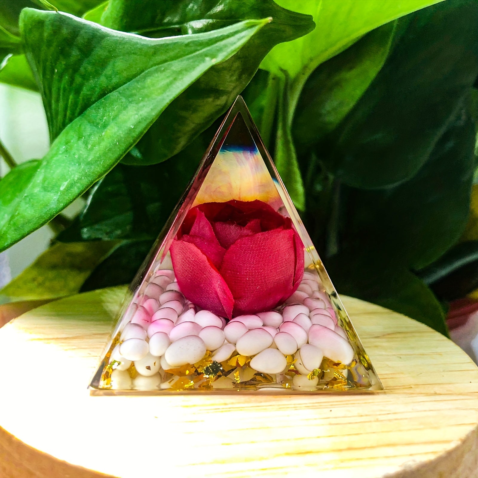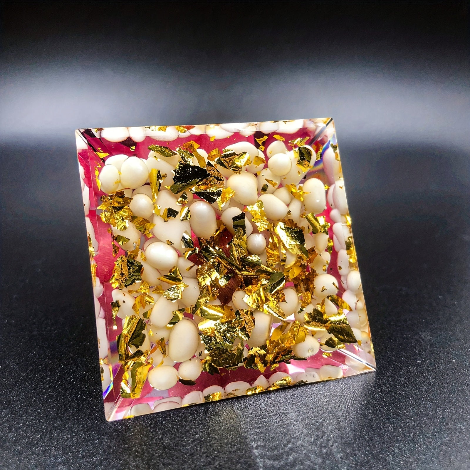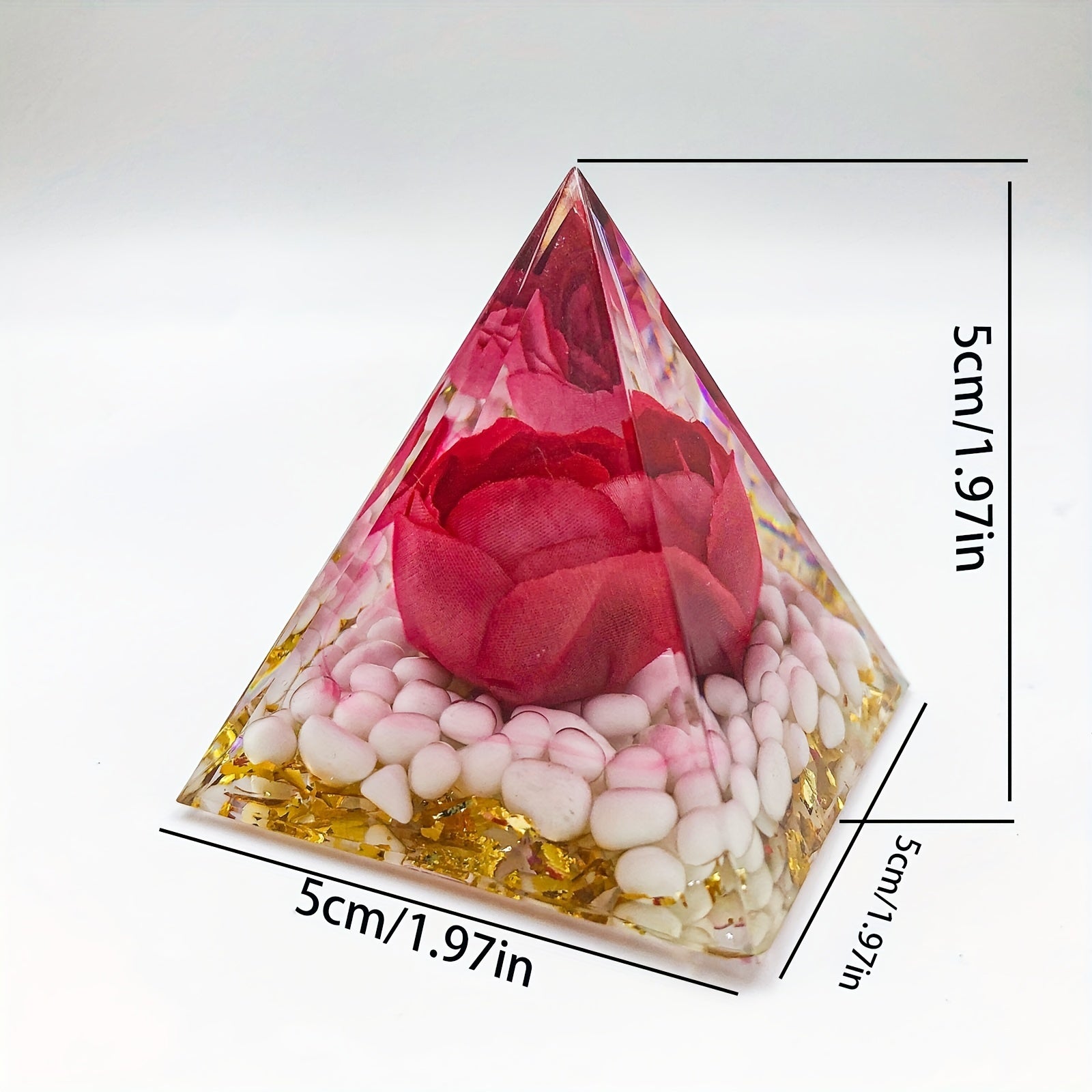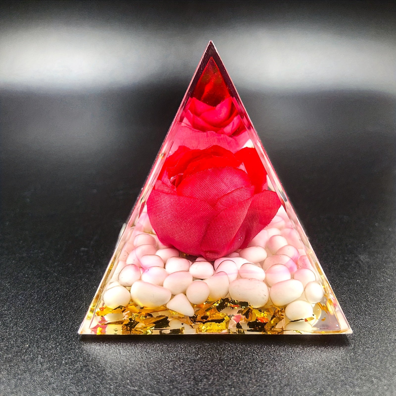 This orgone pyramid is crafted with crystal energy for positive energy, protection, stress relief, healing, and attracting wealth. It is ideal for meditation and creating a harmonious environment.