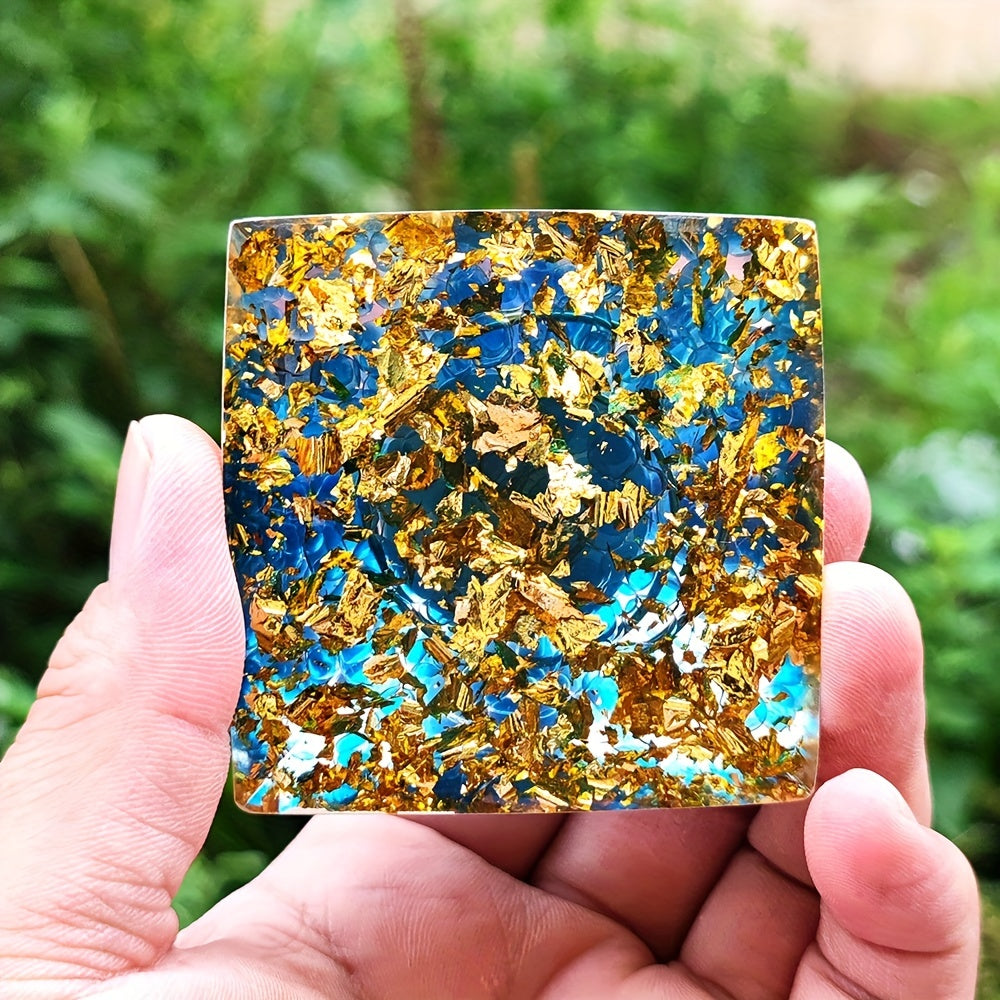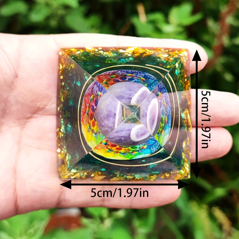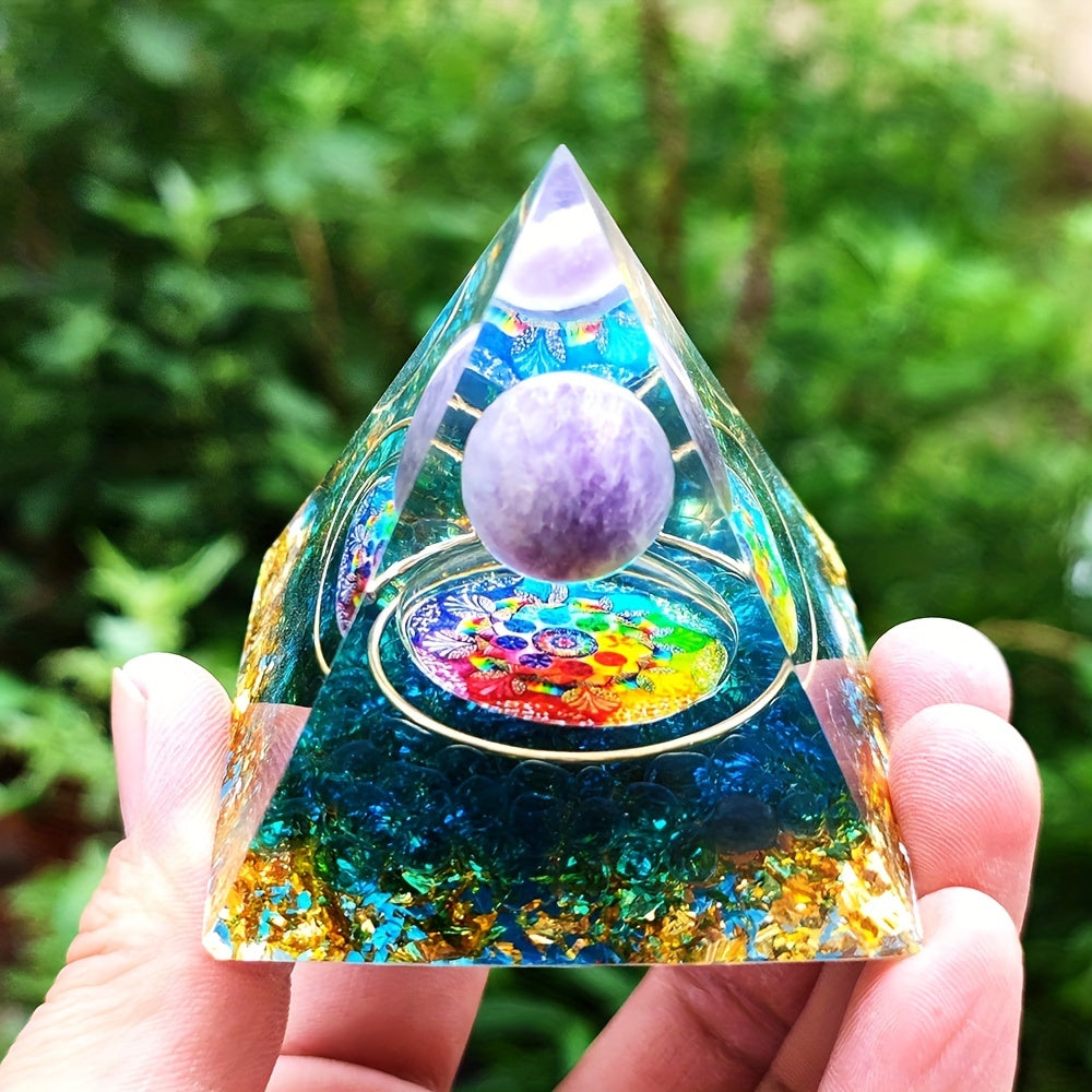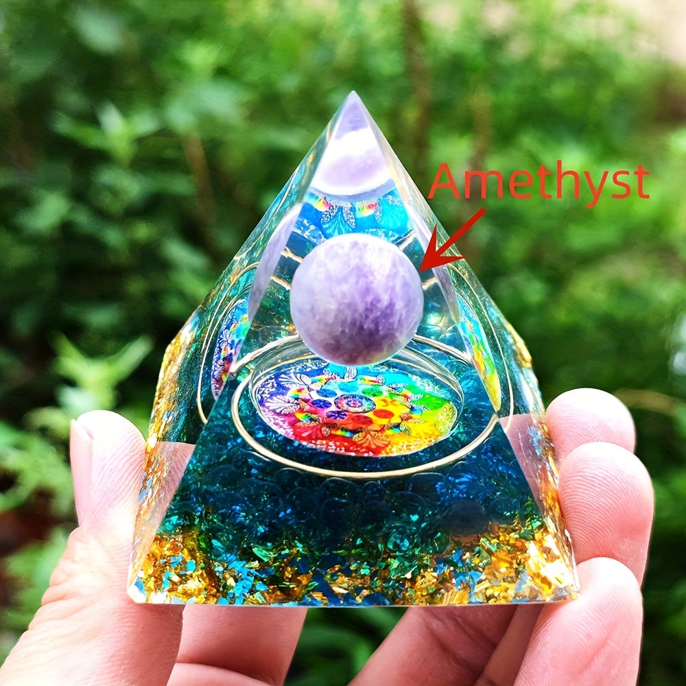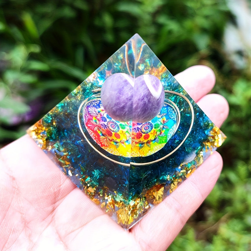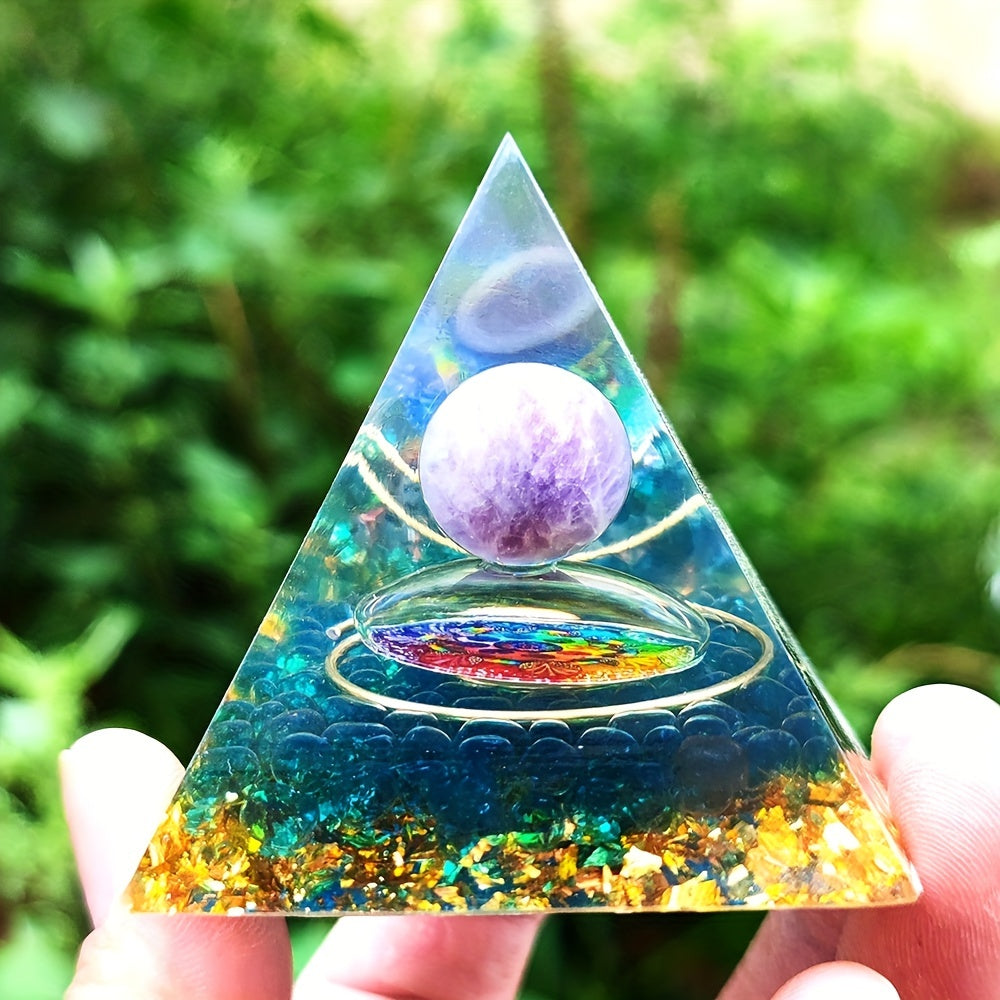 This orgonite pyramid features amethyst crystals that promote healing, balance energy, and enhance meditation. It is crafted with care to support chakra alignment and spiritual growth.
