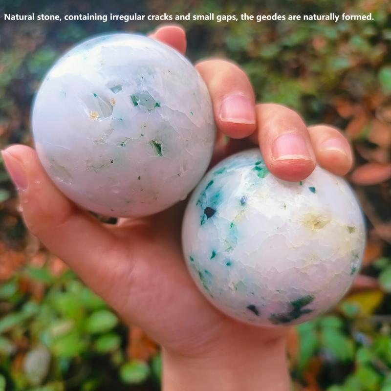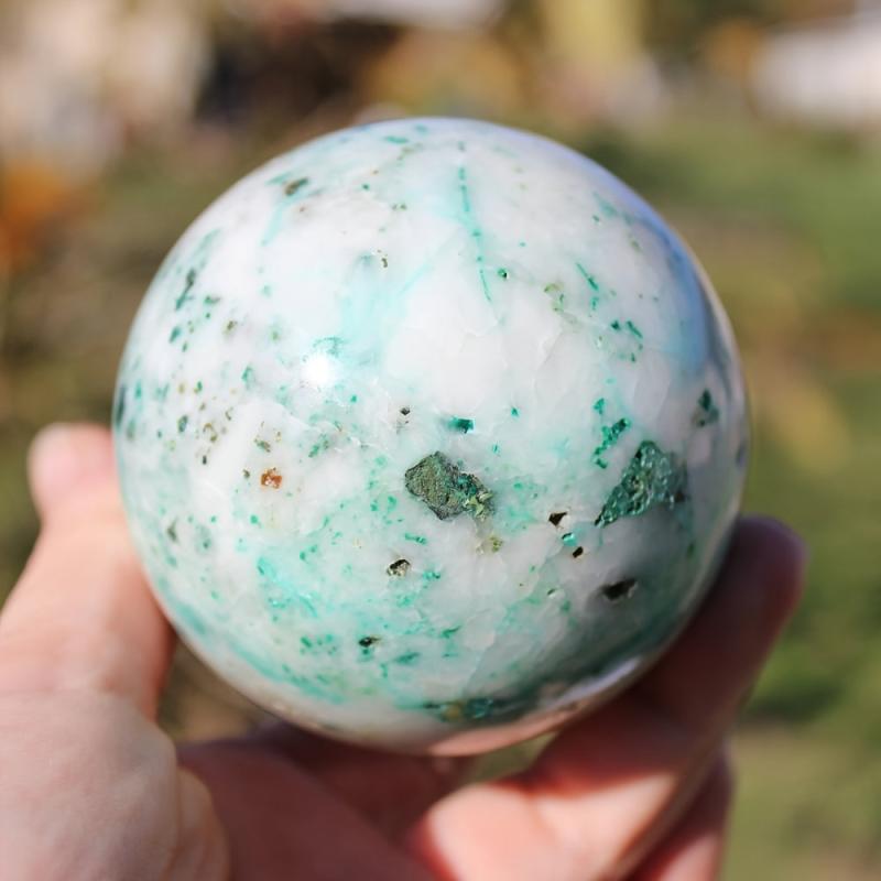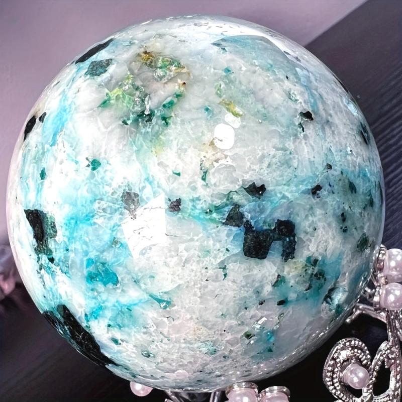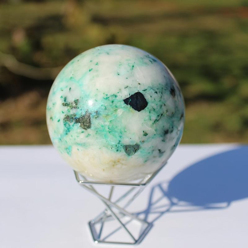 Experience the soothing energy of this Phoenix Stone Sphere with a combination of Chrysocolla, Malachite, and Turquoise. Perfect for healing and balancing energies.