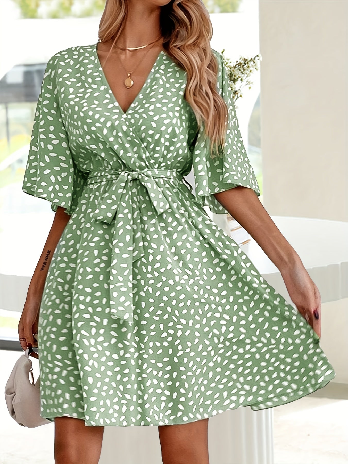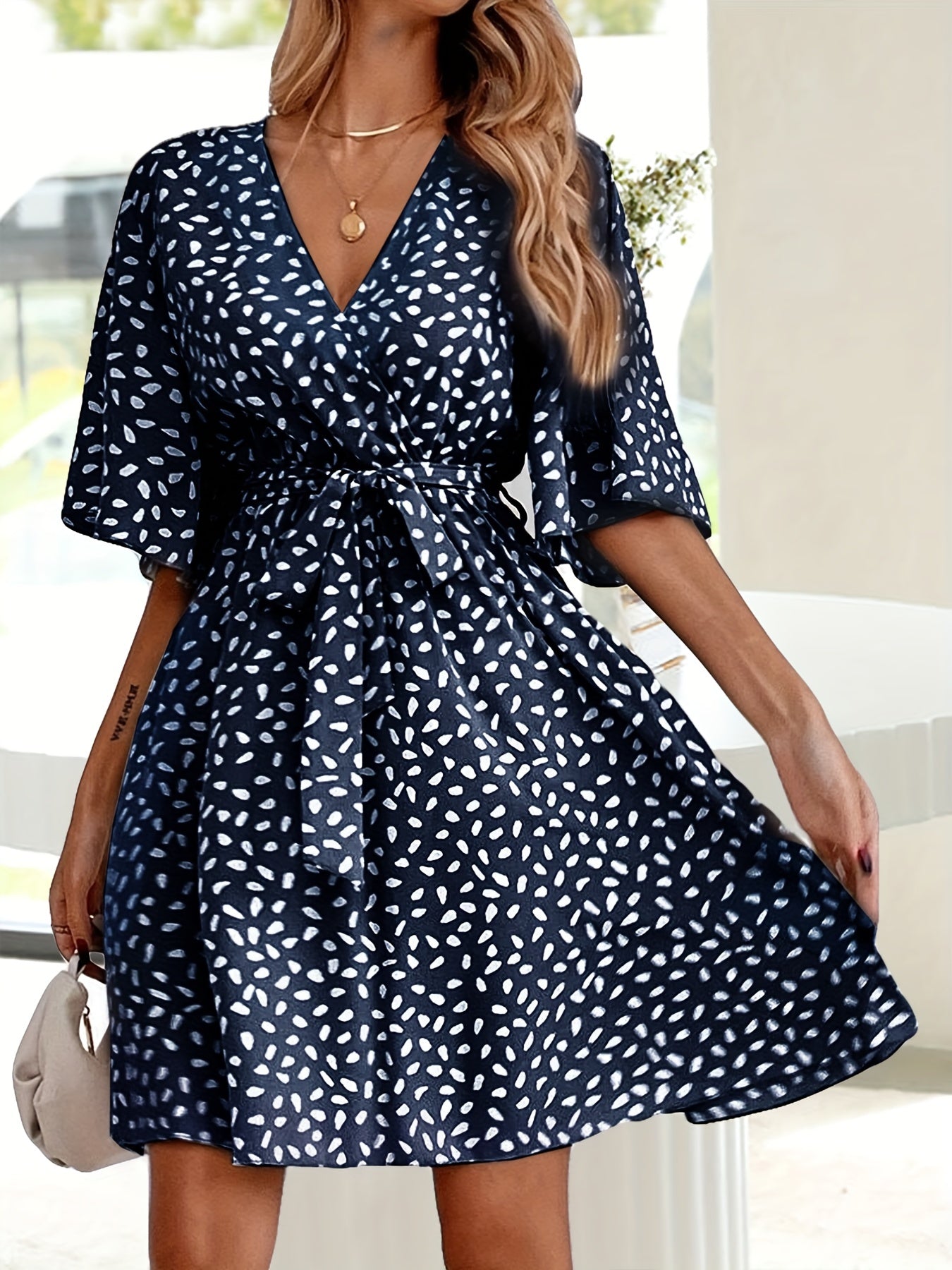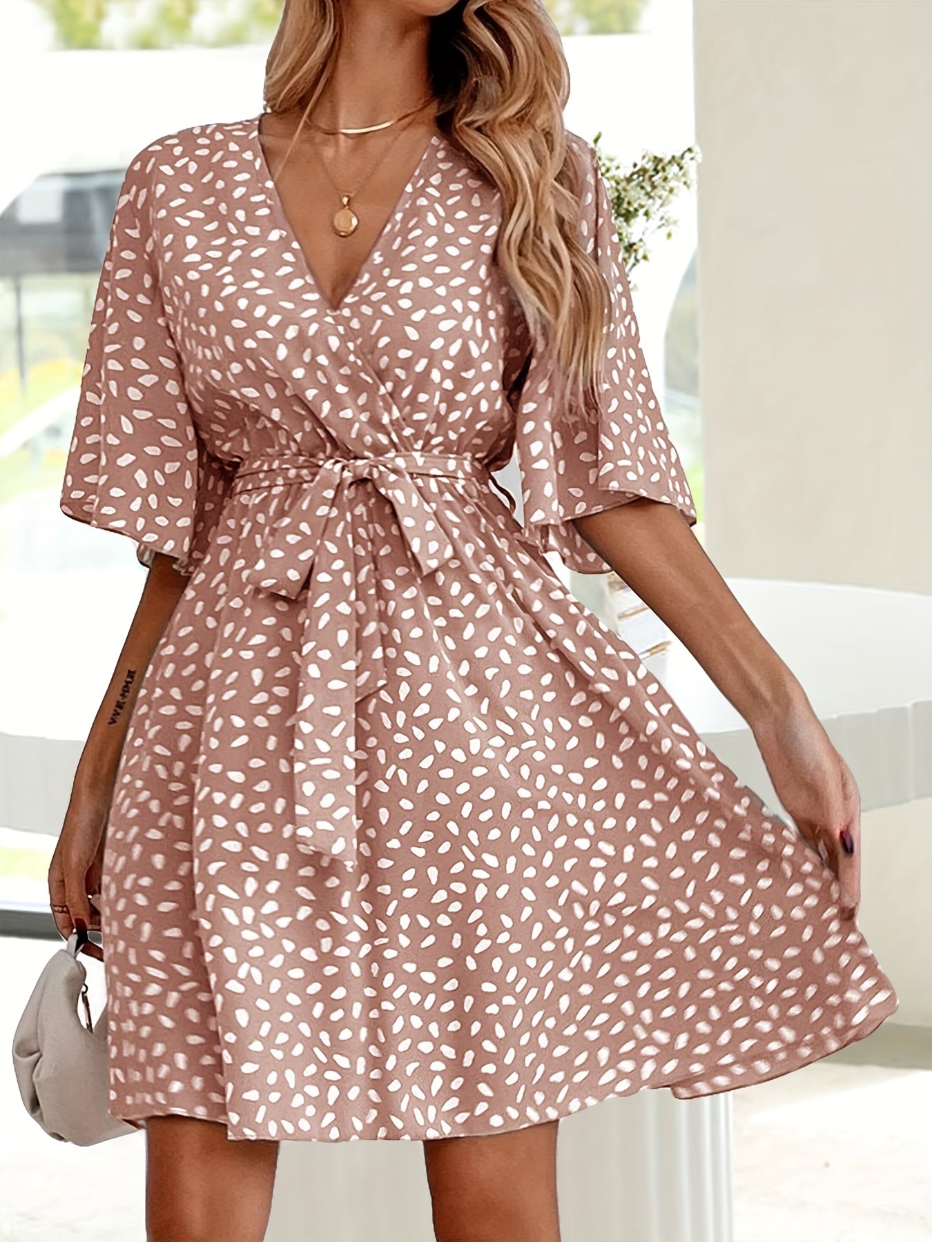 Stay stylish and comfortable this spring and summer with this allover print belted V neck dress. This short sleeve dress is perfect for any casual occasion.