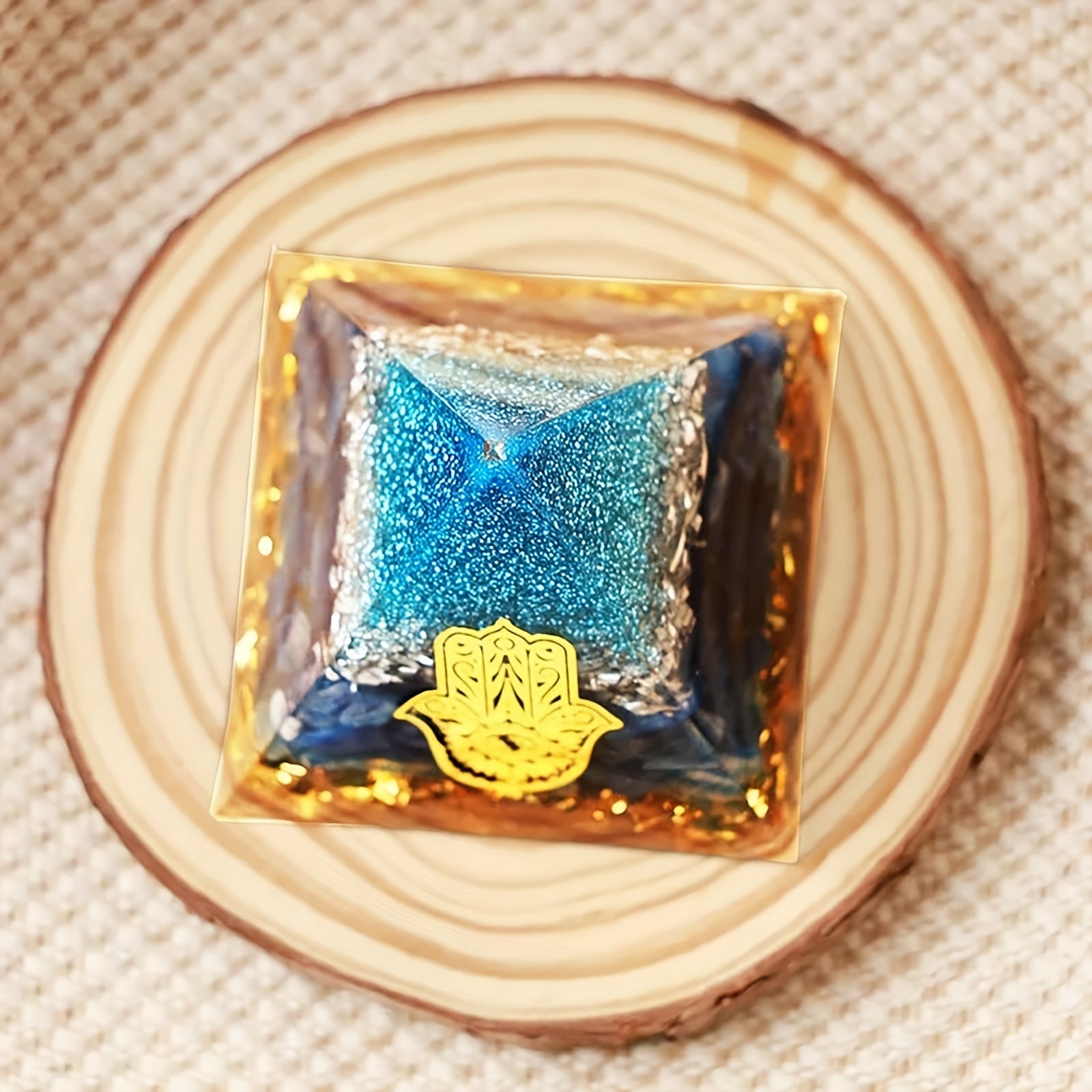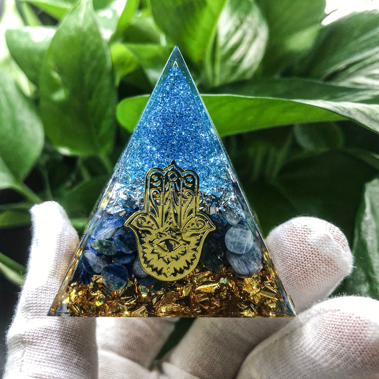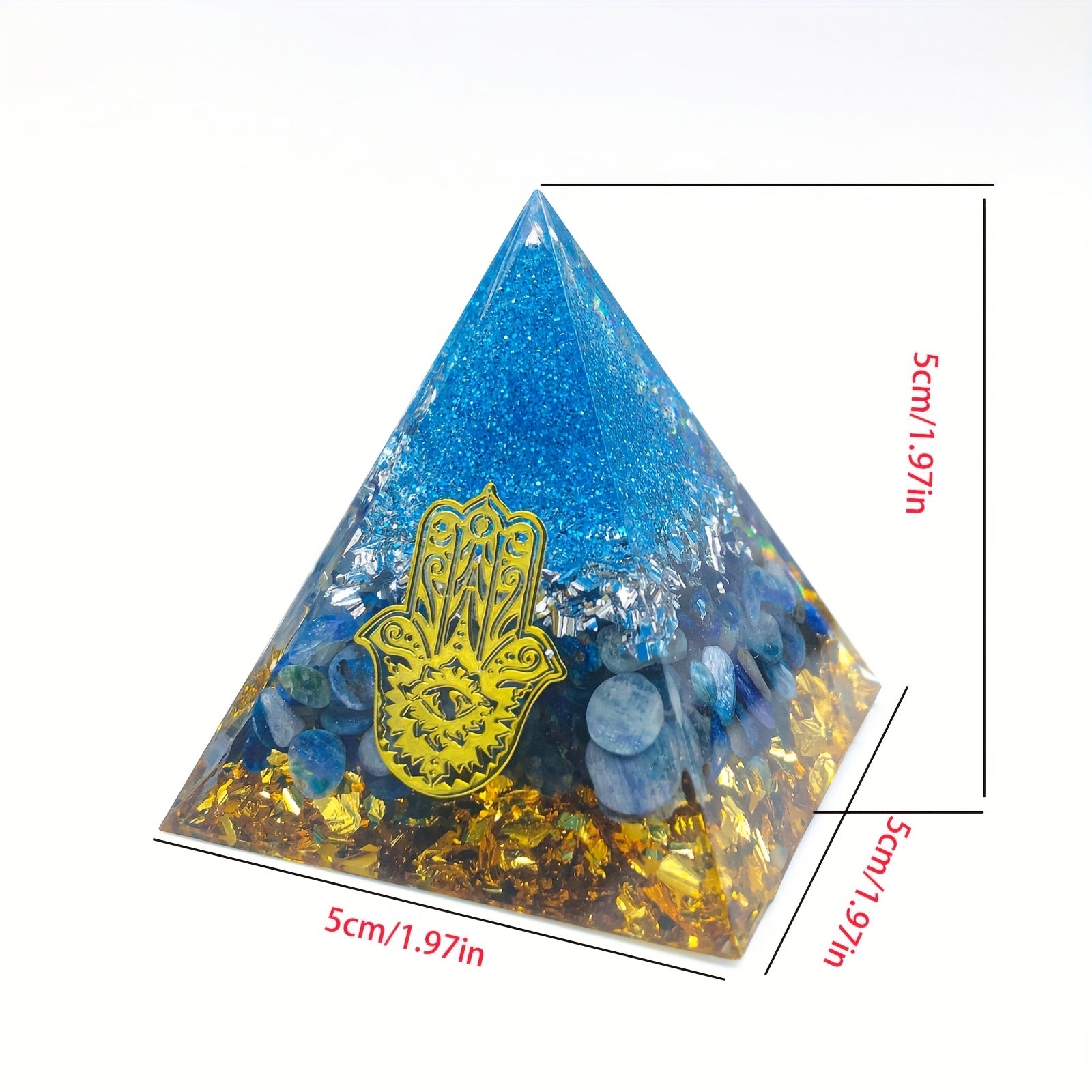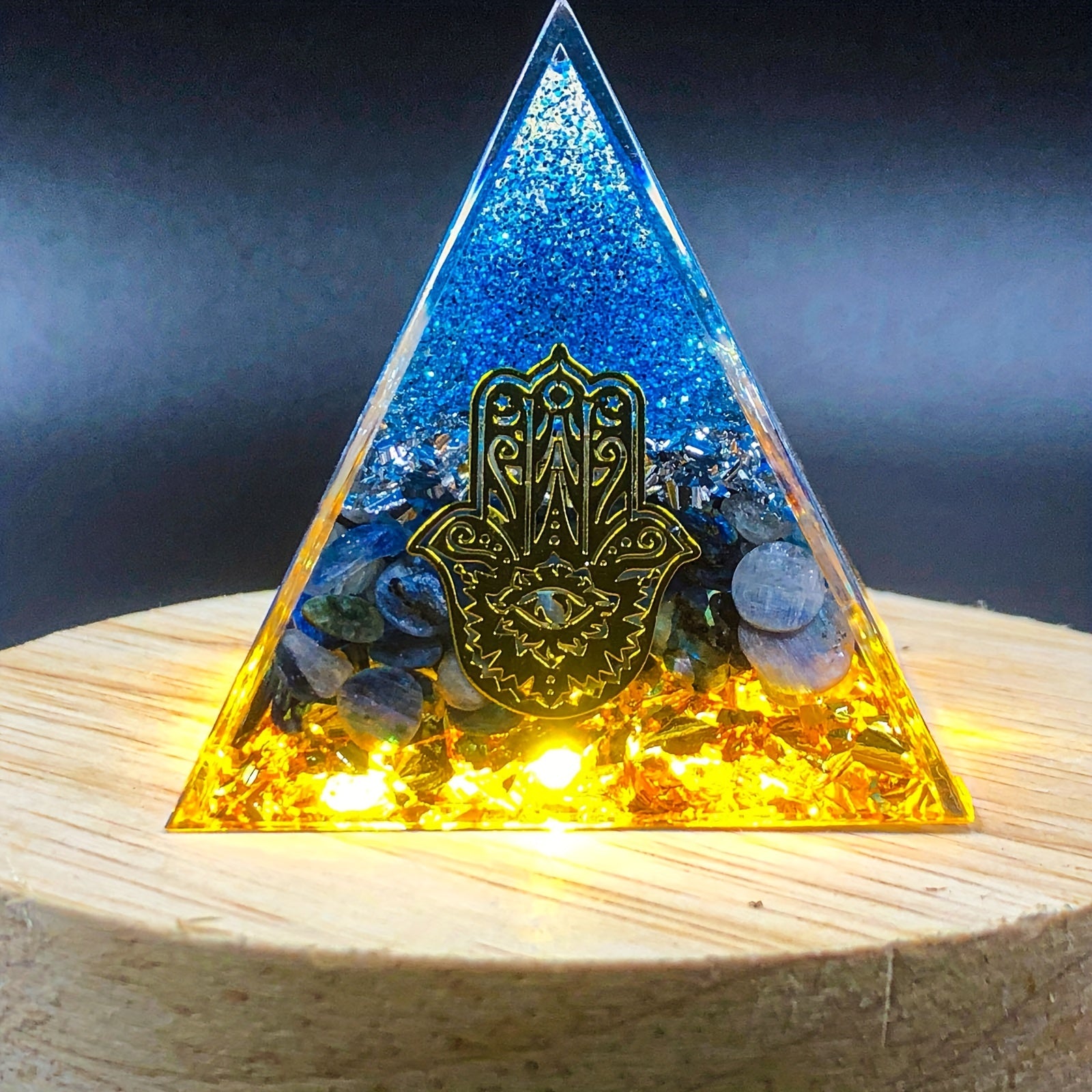 Enhance your well-being with this unique pyramid crystal accessory featuring Kyanite crystal and Hamsa symbol. Promotes protection and positive energy.