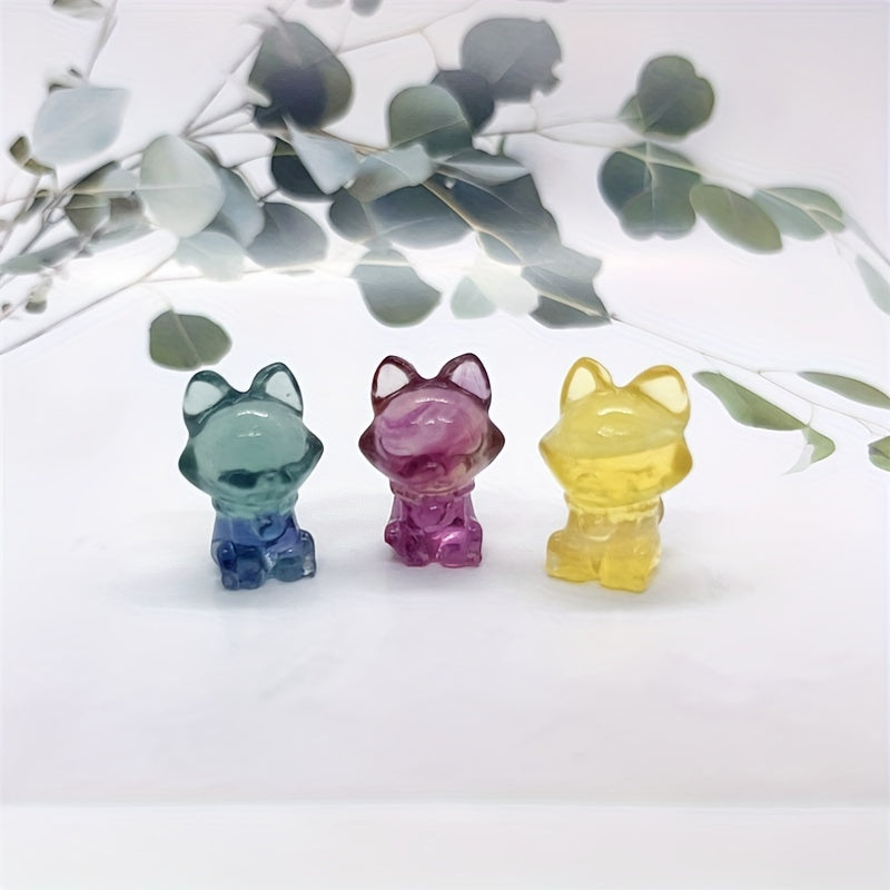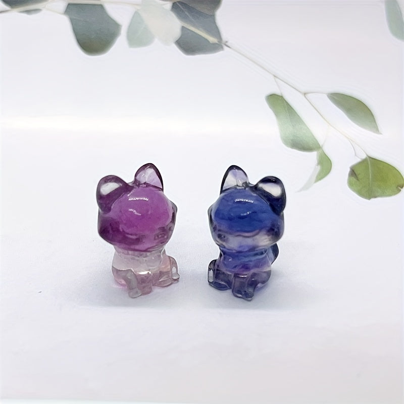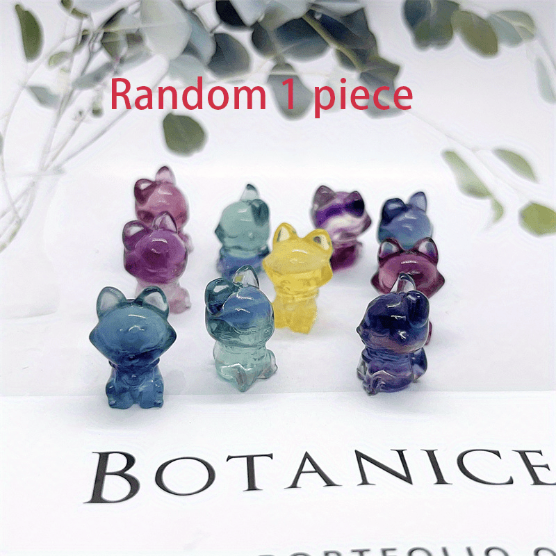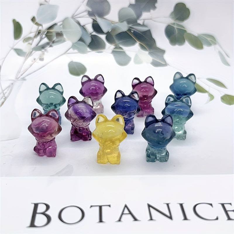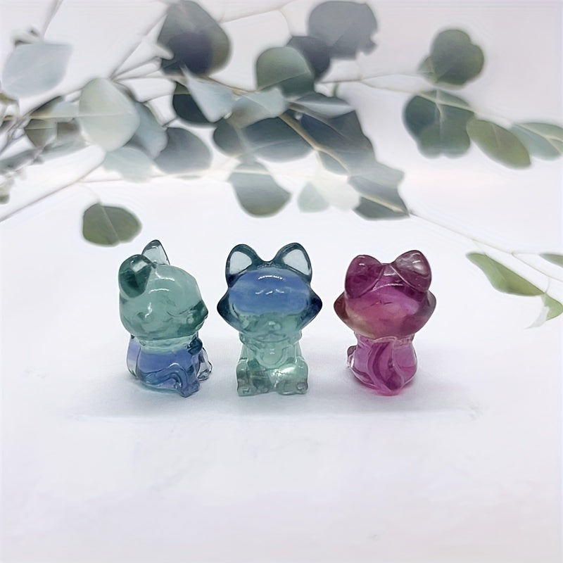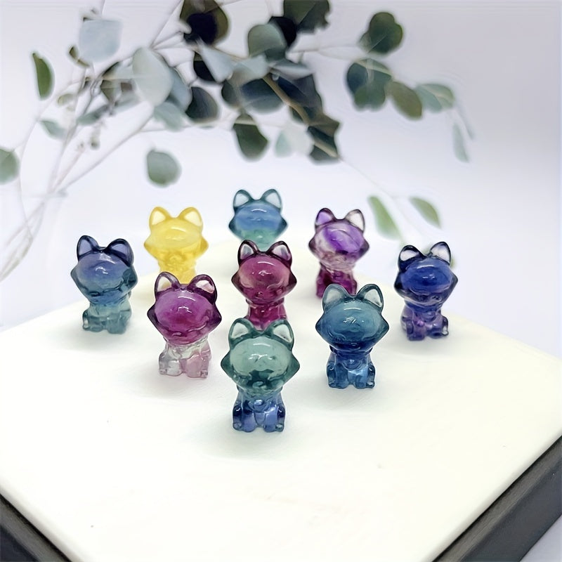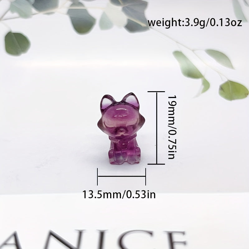 Adorn your space with this lovely rainbow fluorite fox carving, a natural stone ornament that radiates healing energy.
