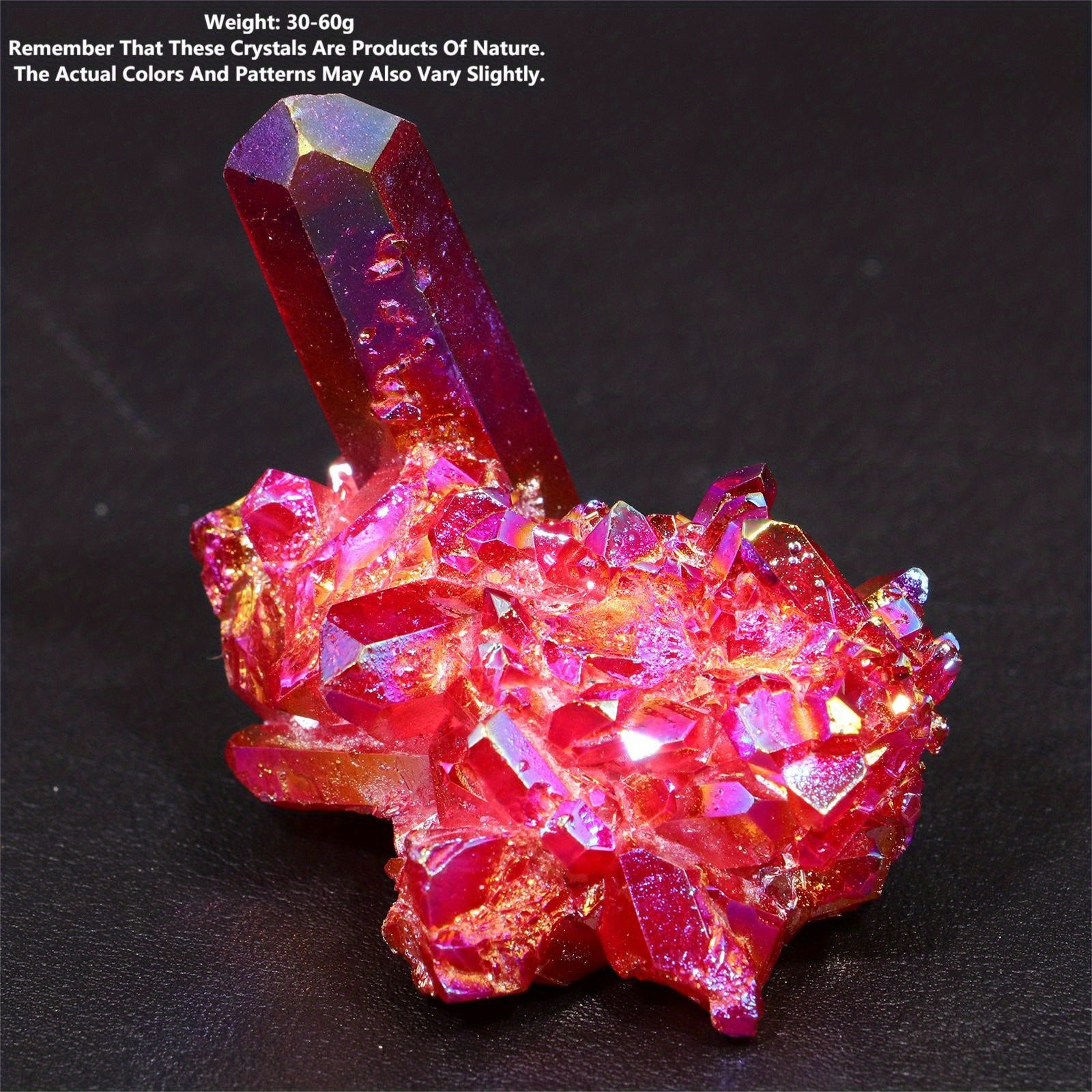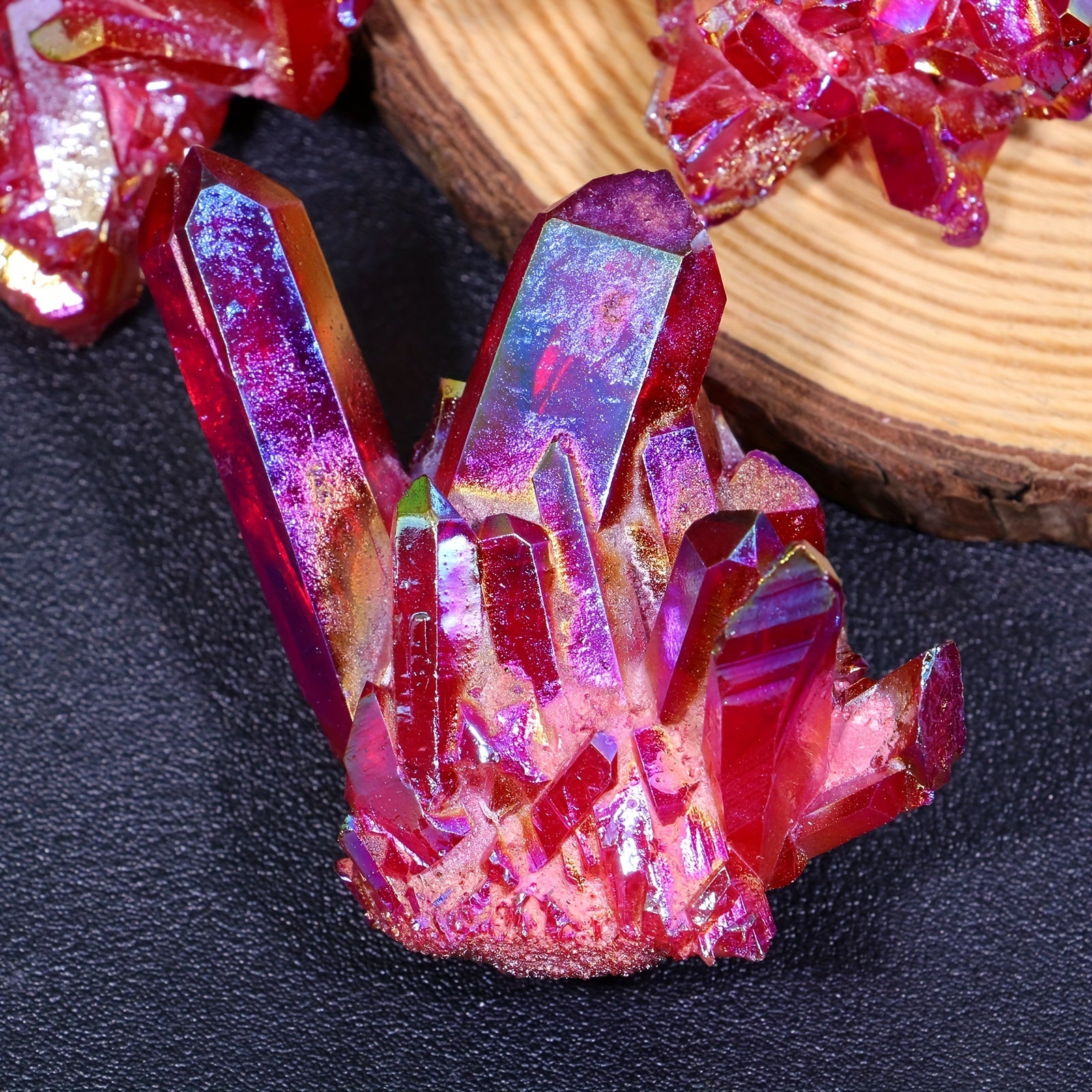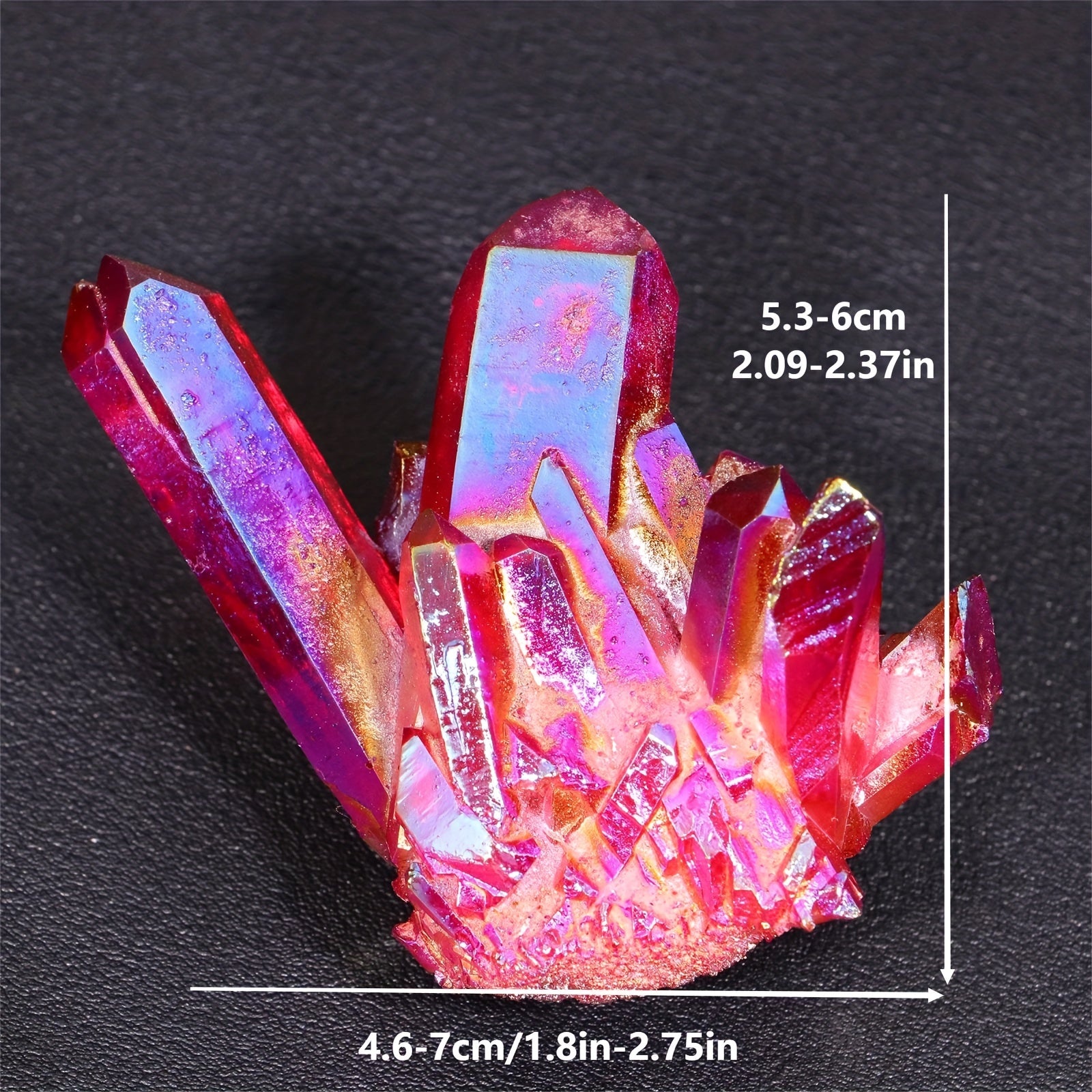 This stunning crystal cluster features a red titanium rainbow aura Lemurian Quartz point, perfect for healing and decoration. Add a touch of elegance to your space with this unique piece.
