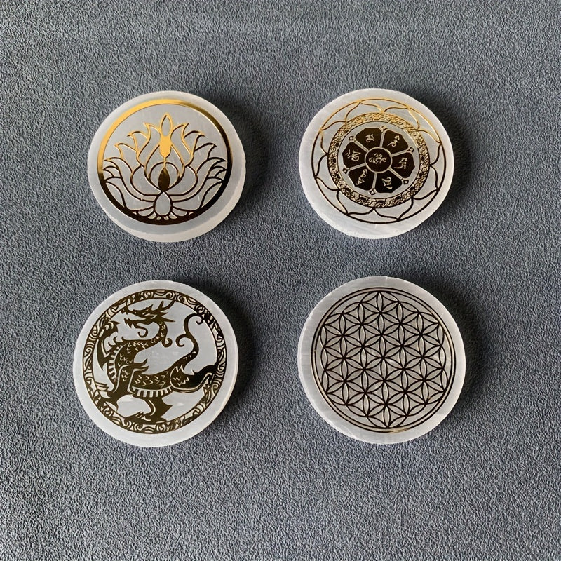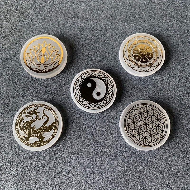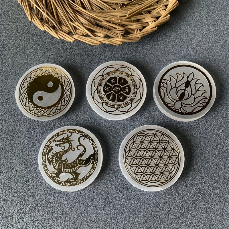 Enhance your space with this 52mm selenite round shaped plate featuring unique patterns. Perfect for decoration and healing purposes.