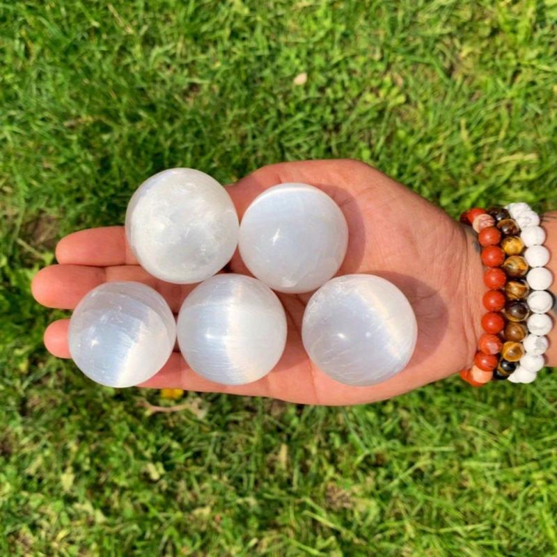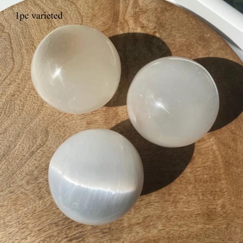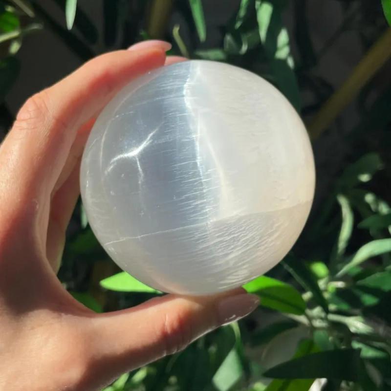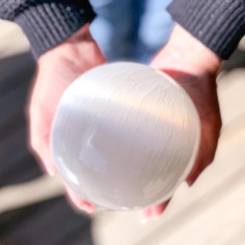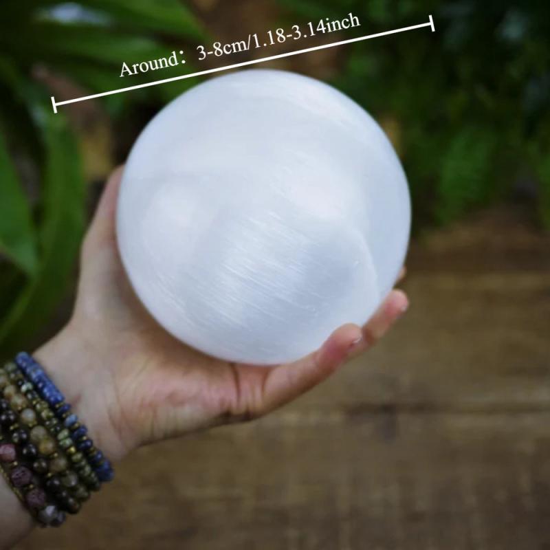 This unique Selenite Sphere Crystal Ball is adorned with intricate patterns, perfect for enhancing your home or office decor.
