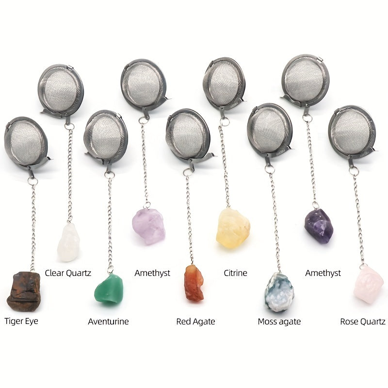 This 304 stainless steel tea infuser ball strainer features natural crystals healing stones, including clear rose quartz. Perfect for brewing your favorite loose leaf tea.