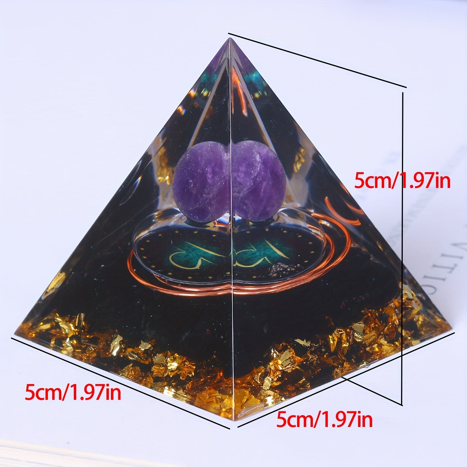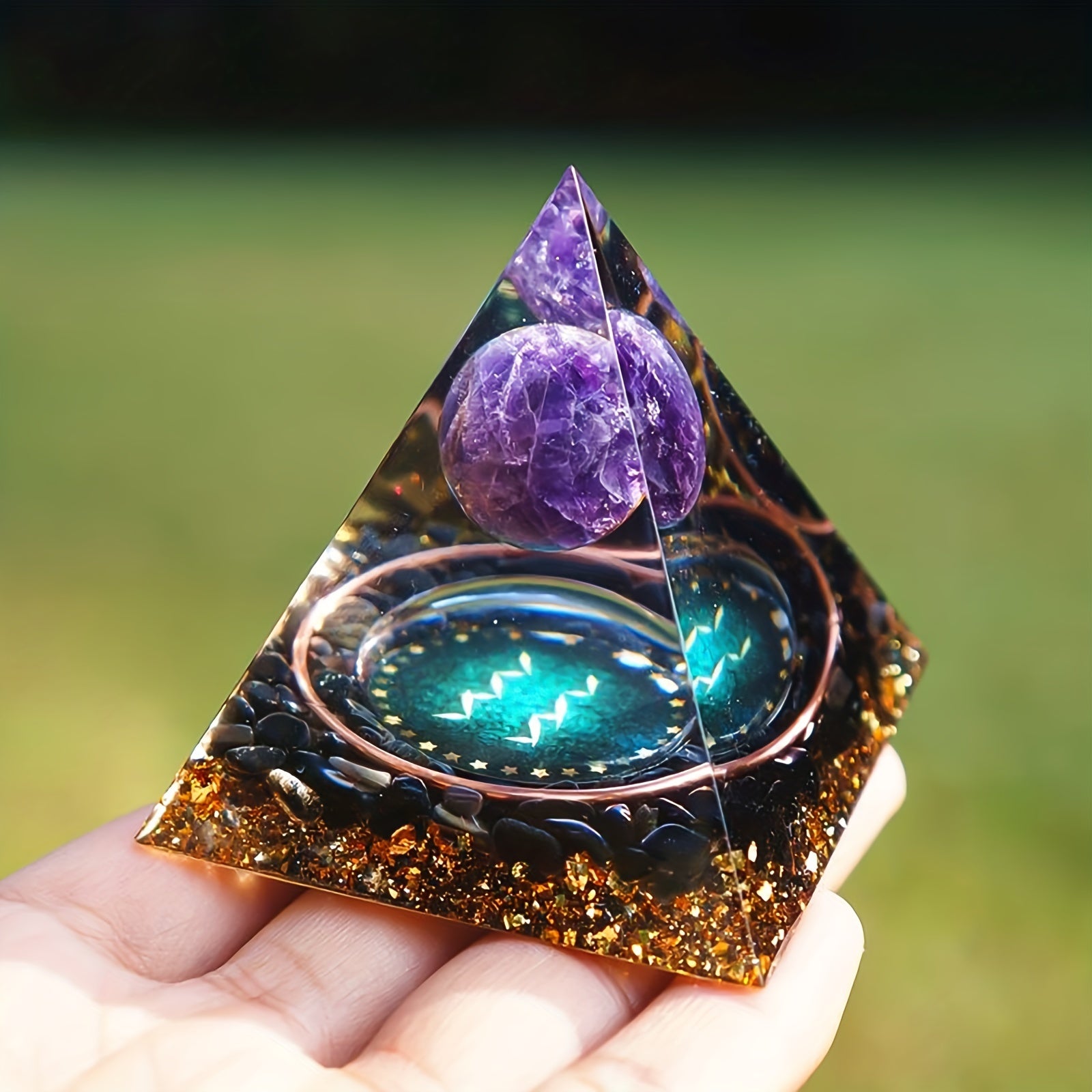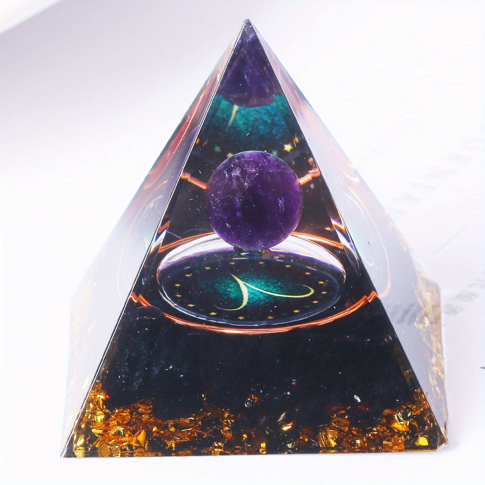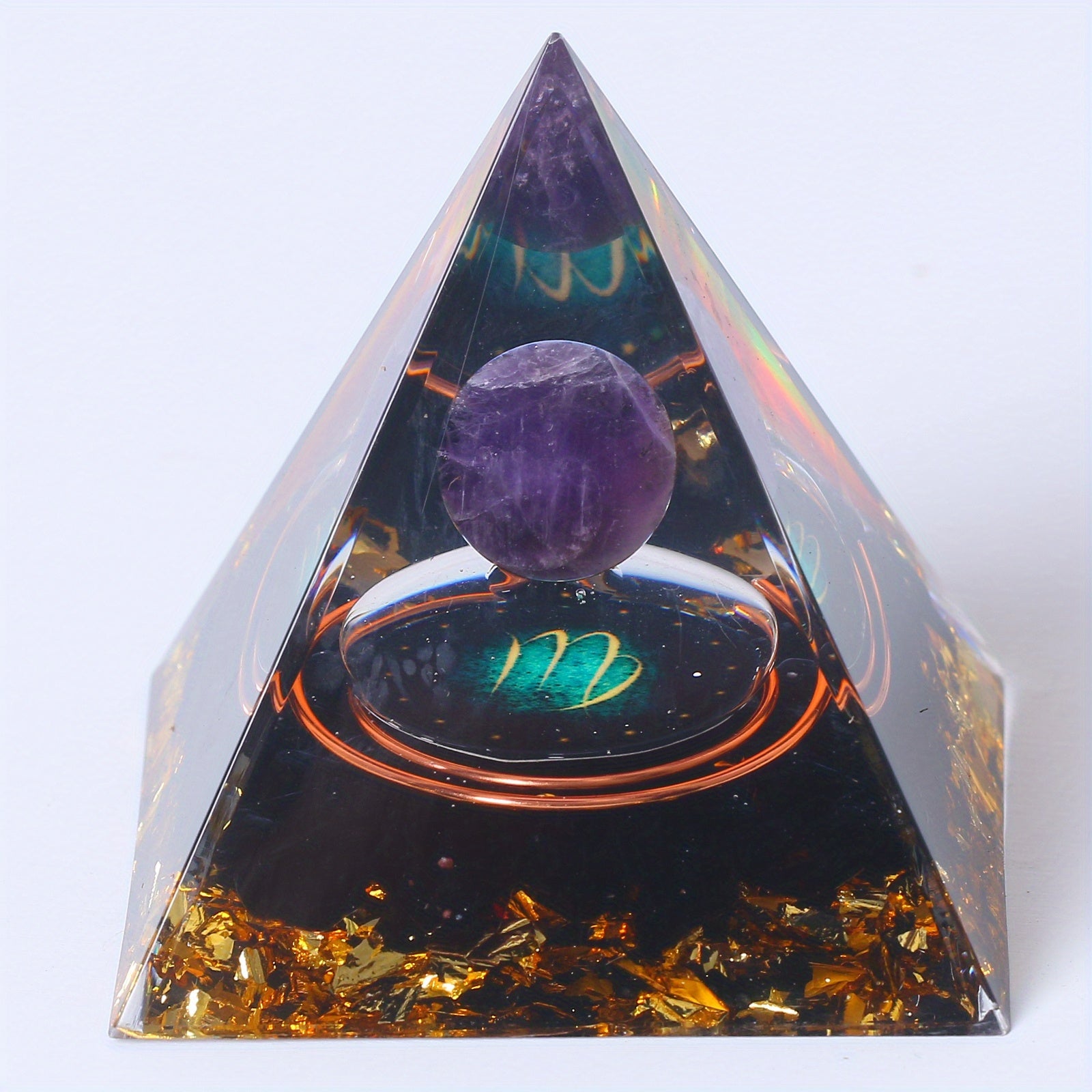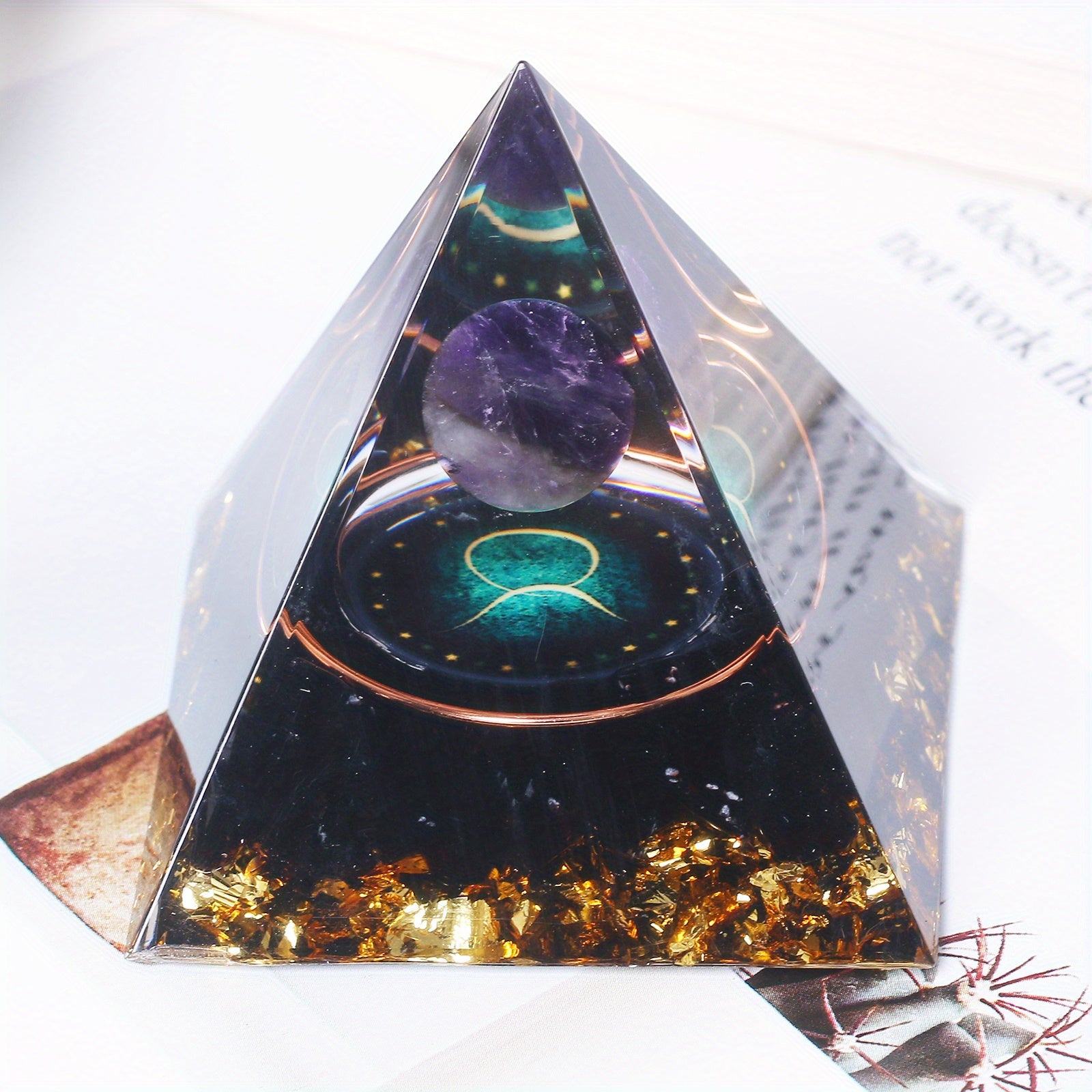This orgone pyramid features the 12 constellations including Taurus, Scorpio, Leo, Pisces, Cancer, Virgo, and Libra. Handcrafted for positive energy and balance.