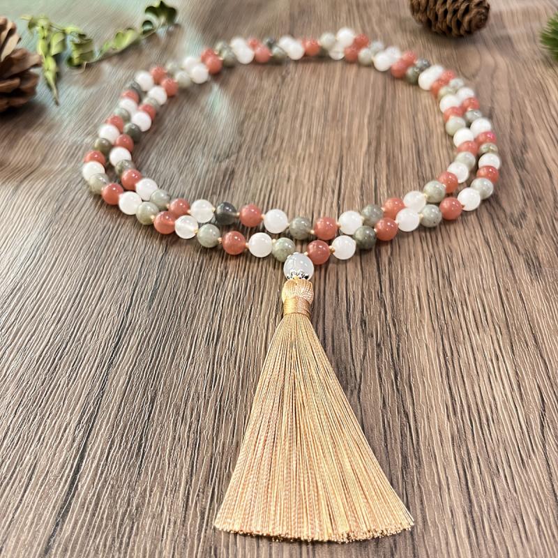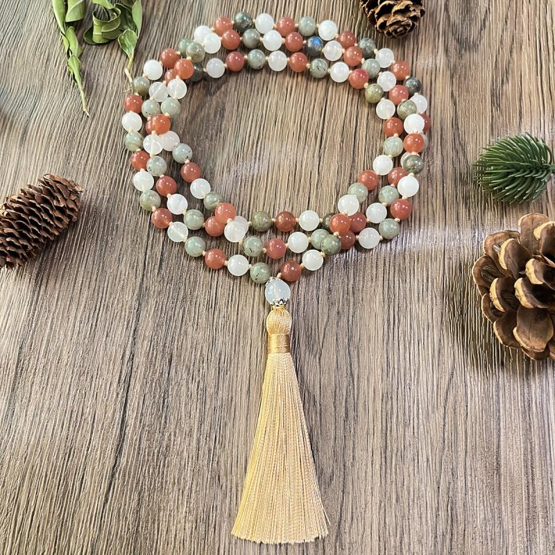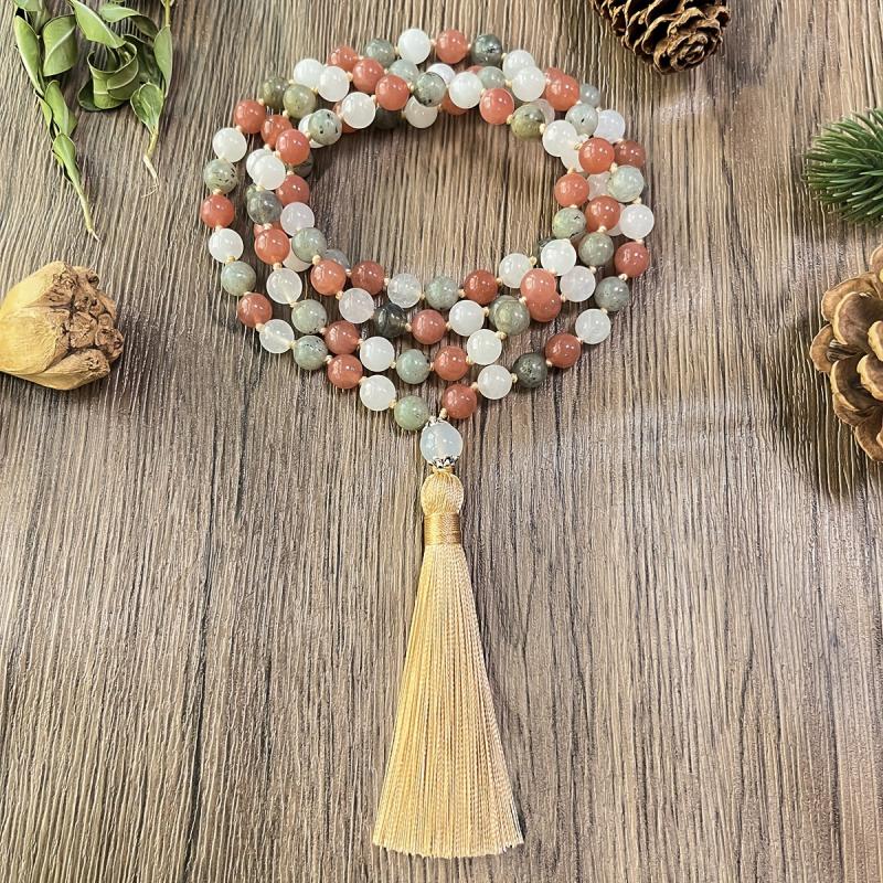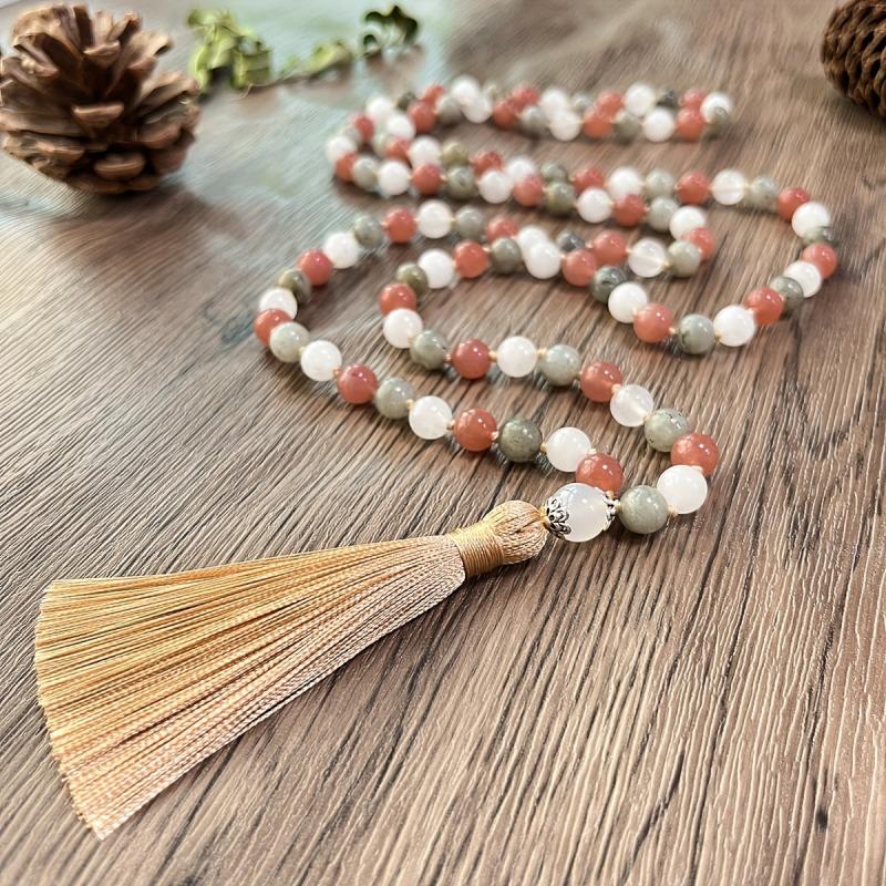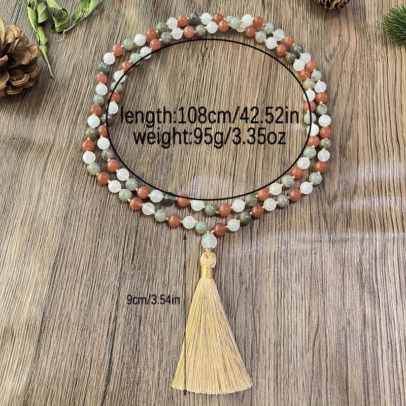 Add a touch of vintage-inspired charm to your daily look with this hand-woven natural stone rosary necklace featuring a tassel pendant. The bohemian style adds a unique texture to your outfit.
