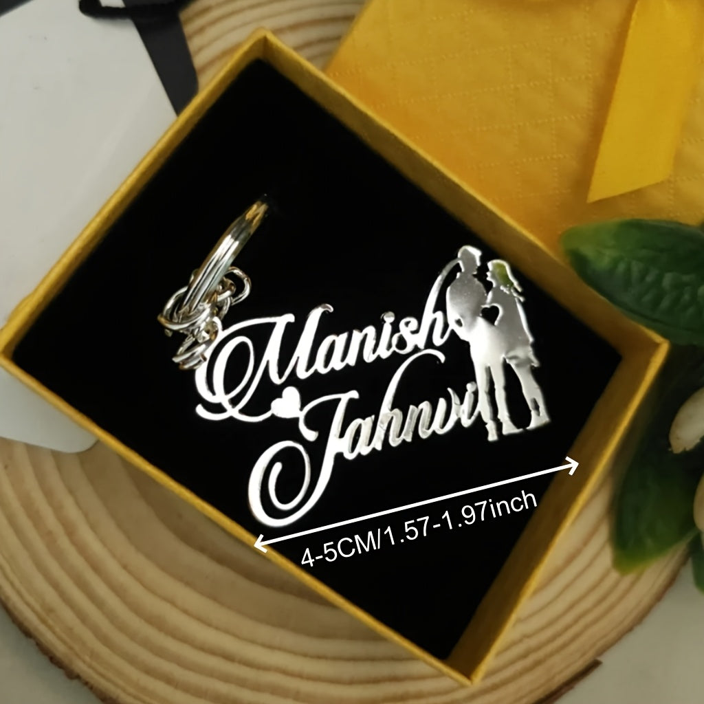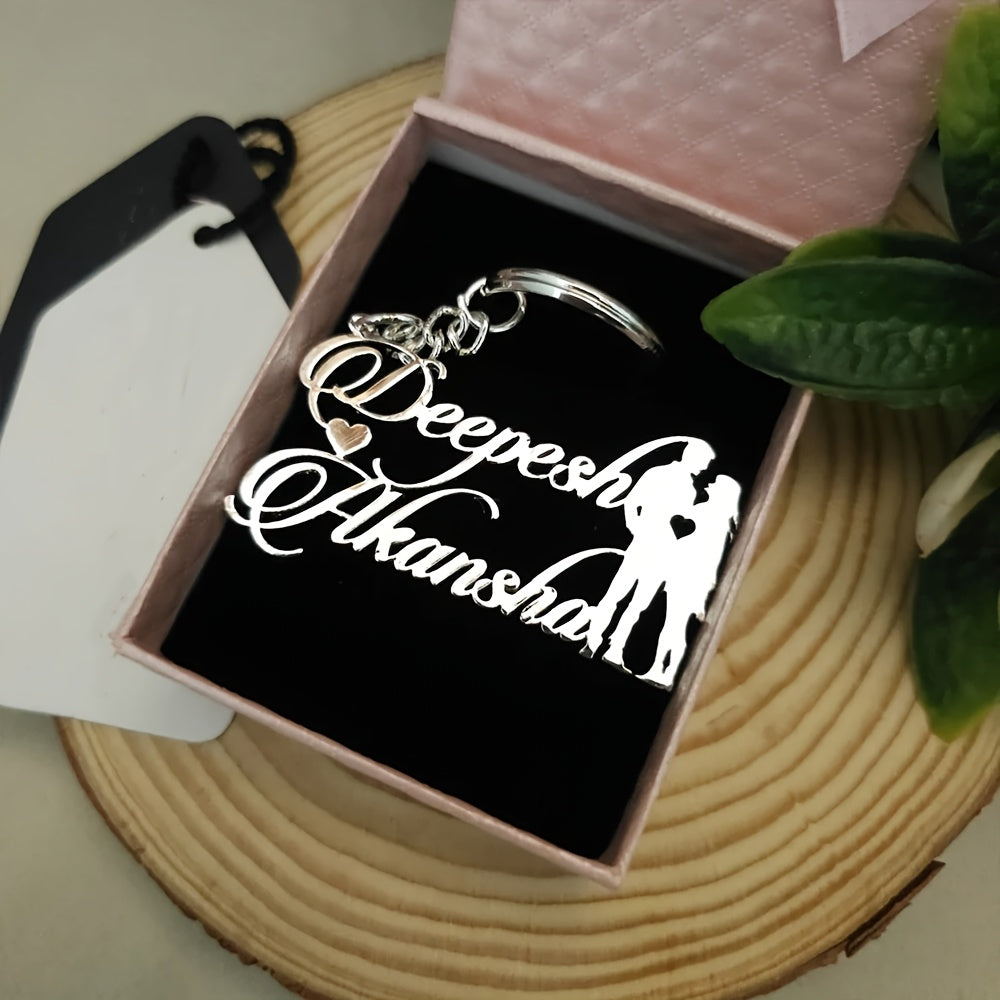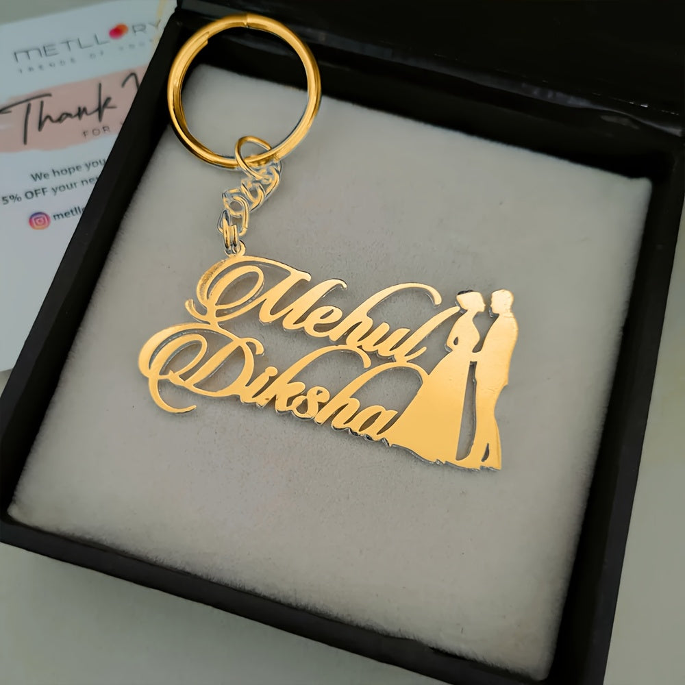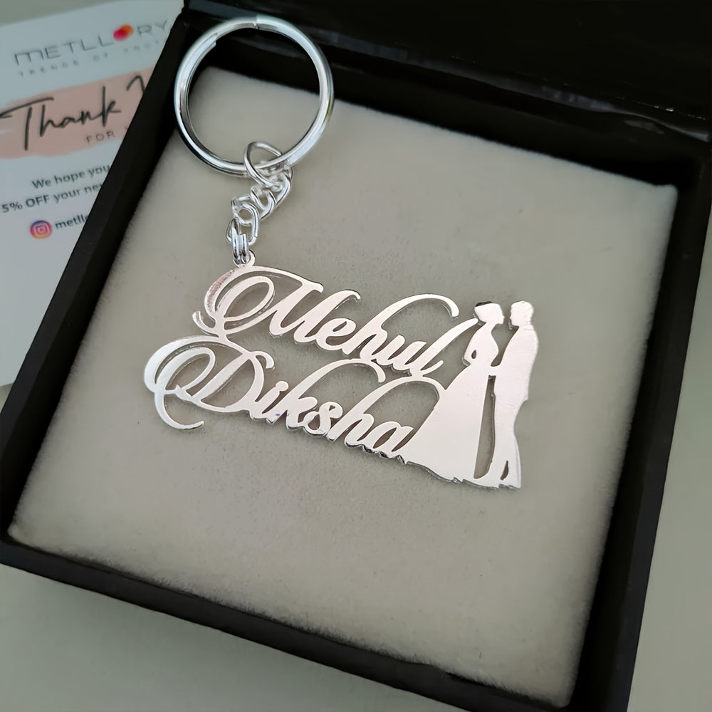 This stainless steel keychain features personalized couple names, a love heart, and an alphabet pendant. It's a perfect accessory for weddings and a great Valentine's Day gift.