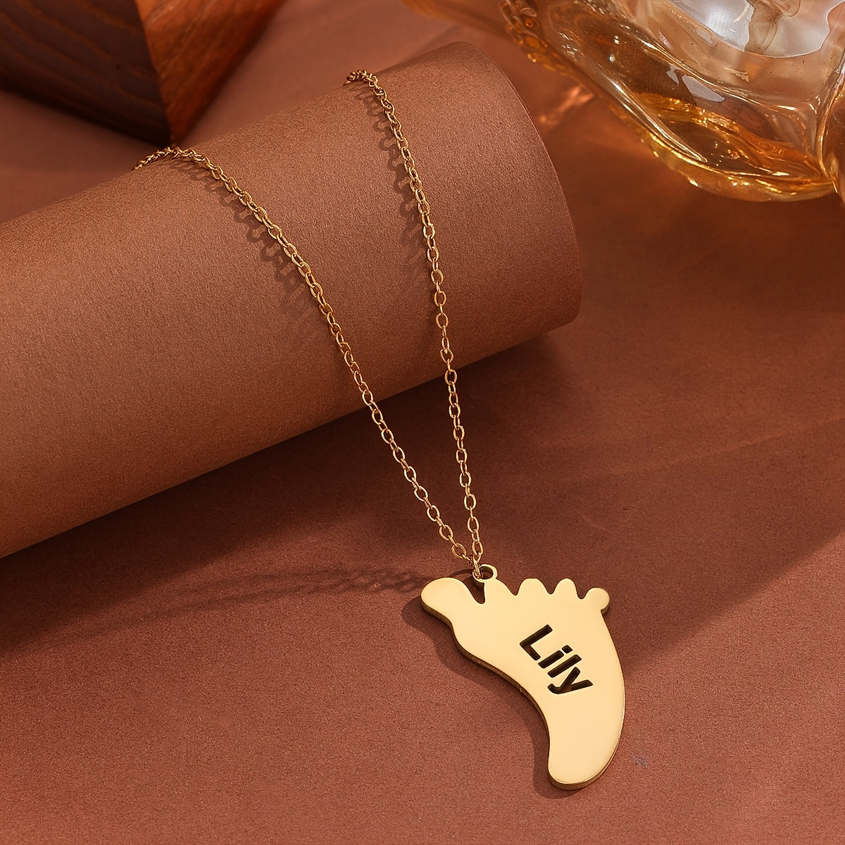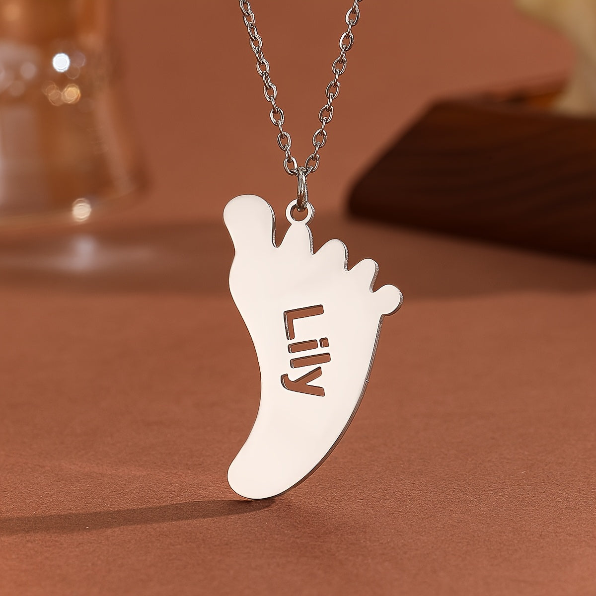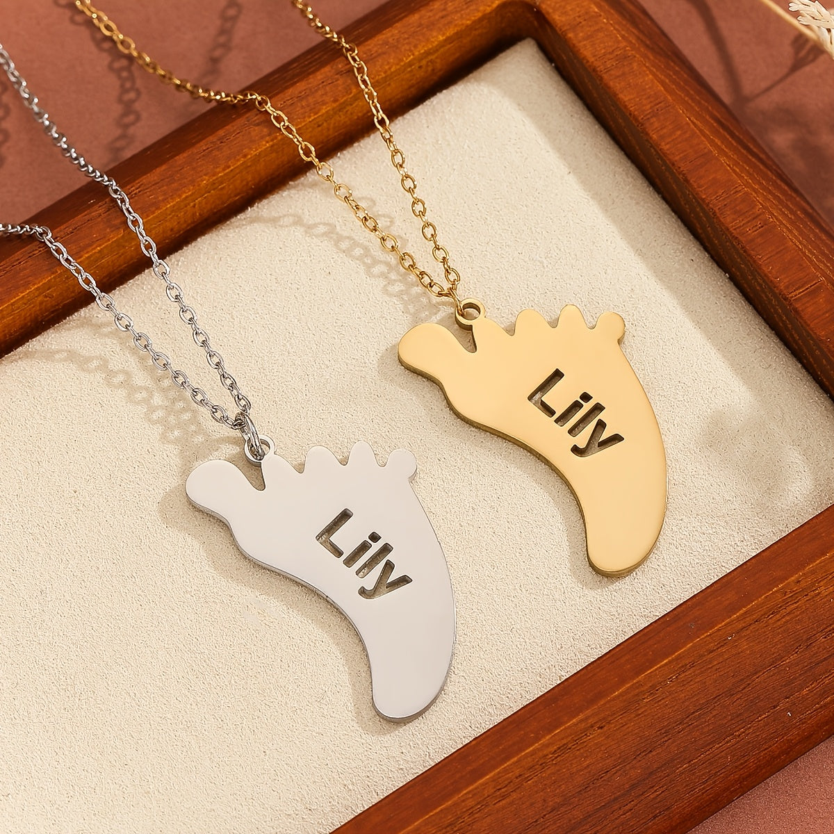 This personalized necklace features baby footprints and can be customized with a name. Made of high-quality stainless steel, this couples necklace is a stylish and meaningful piece of jewelry. The text engraving allows for unique personalization.