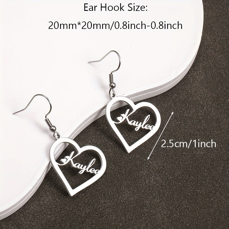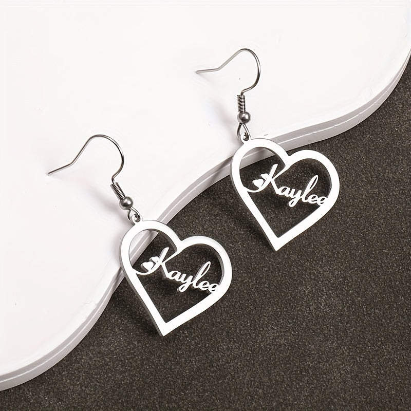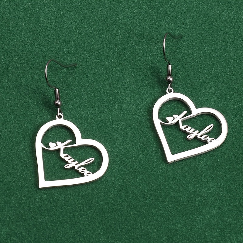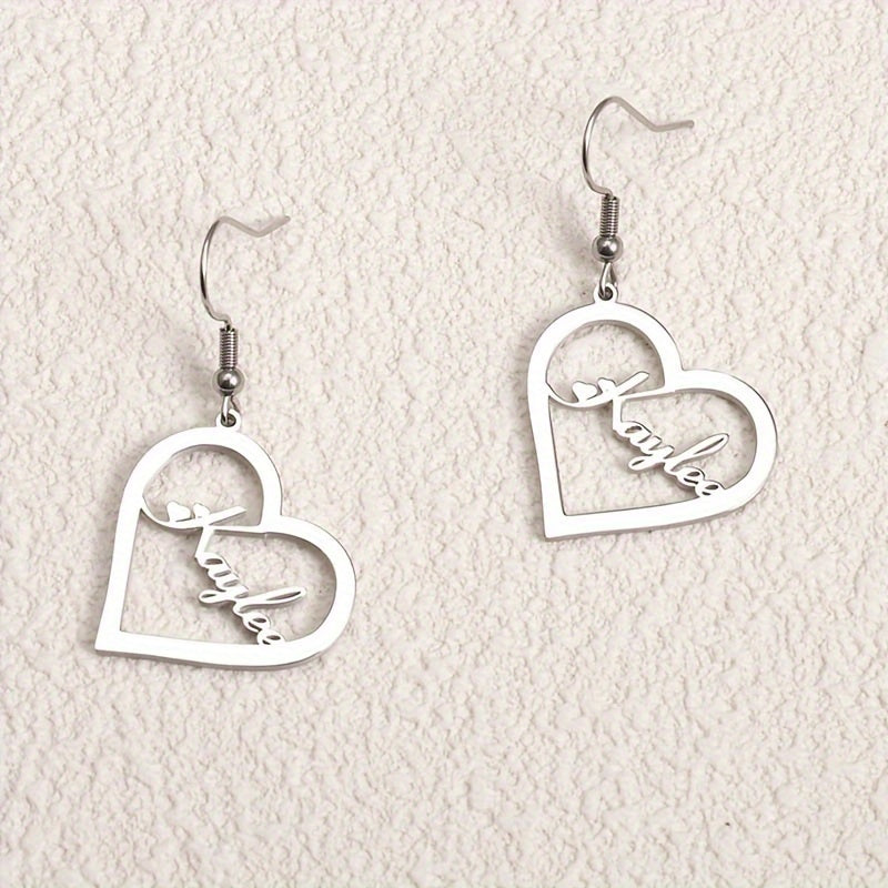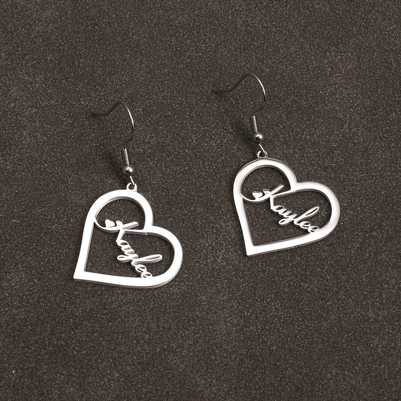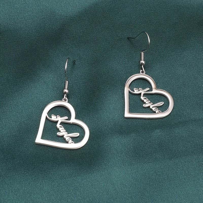 Get your own customized drop earrings made of 304L stainless steel in a heart shape. Simply send us the content up to 15 letters and receive your unique personalized jewelry.
