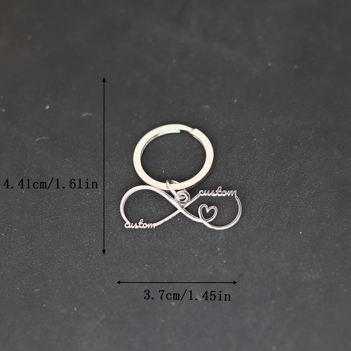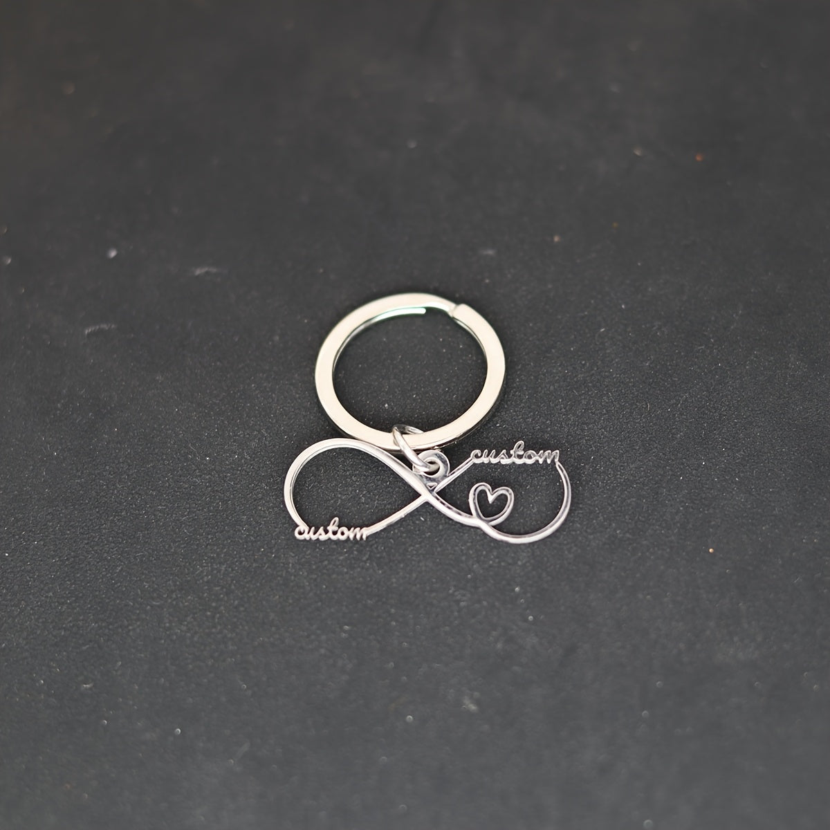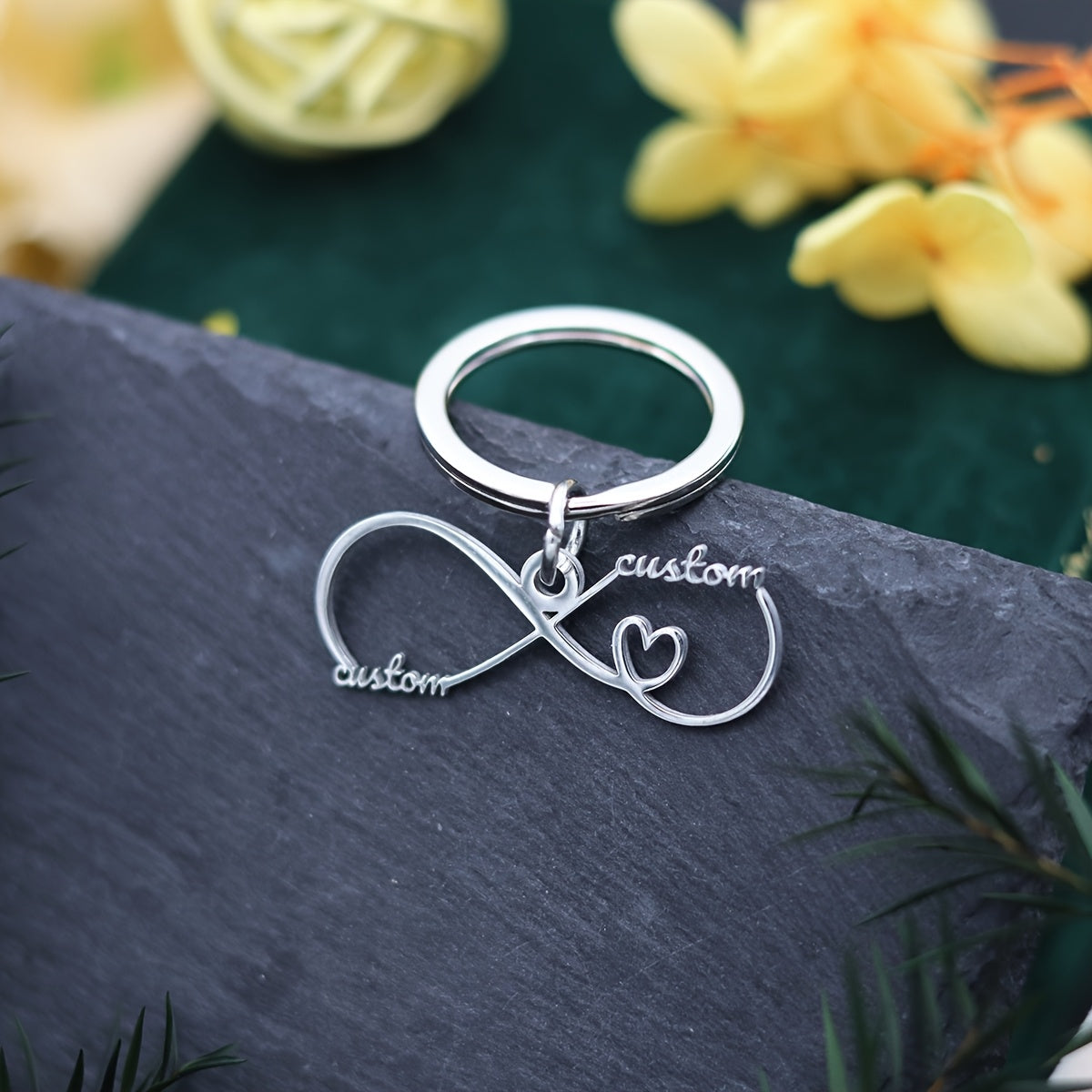 This personalized infinity keychain features two names within a heart design. Made of durable stainless steel, it's a great gift for couples. Customize with your names for a special touch.