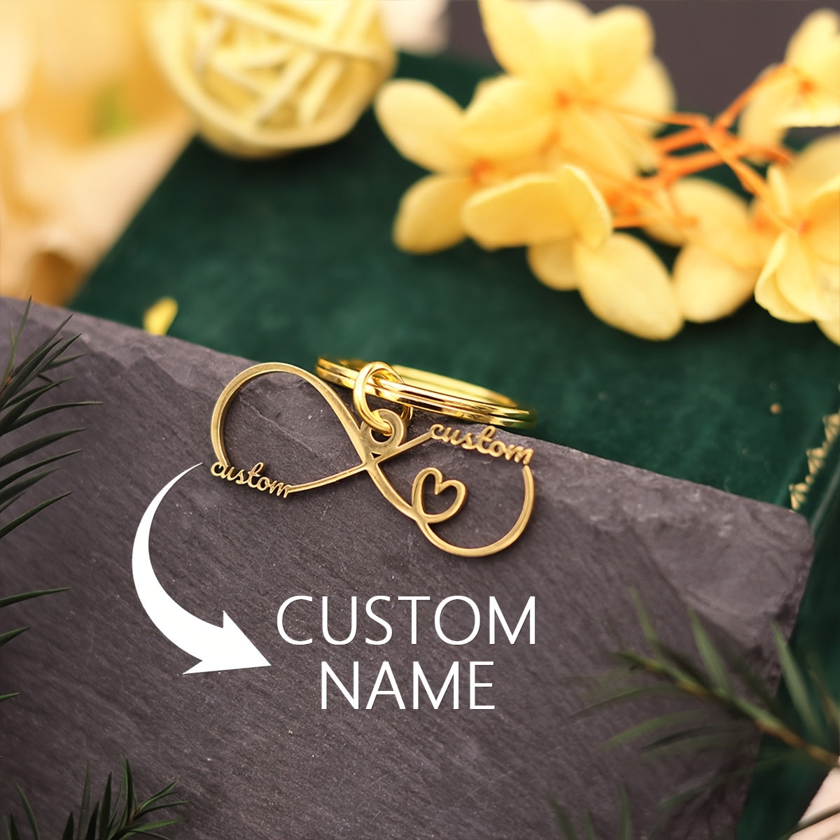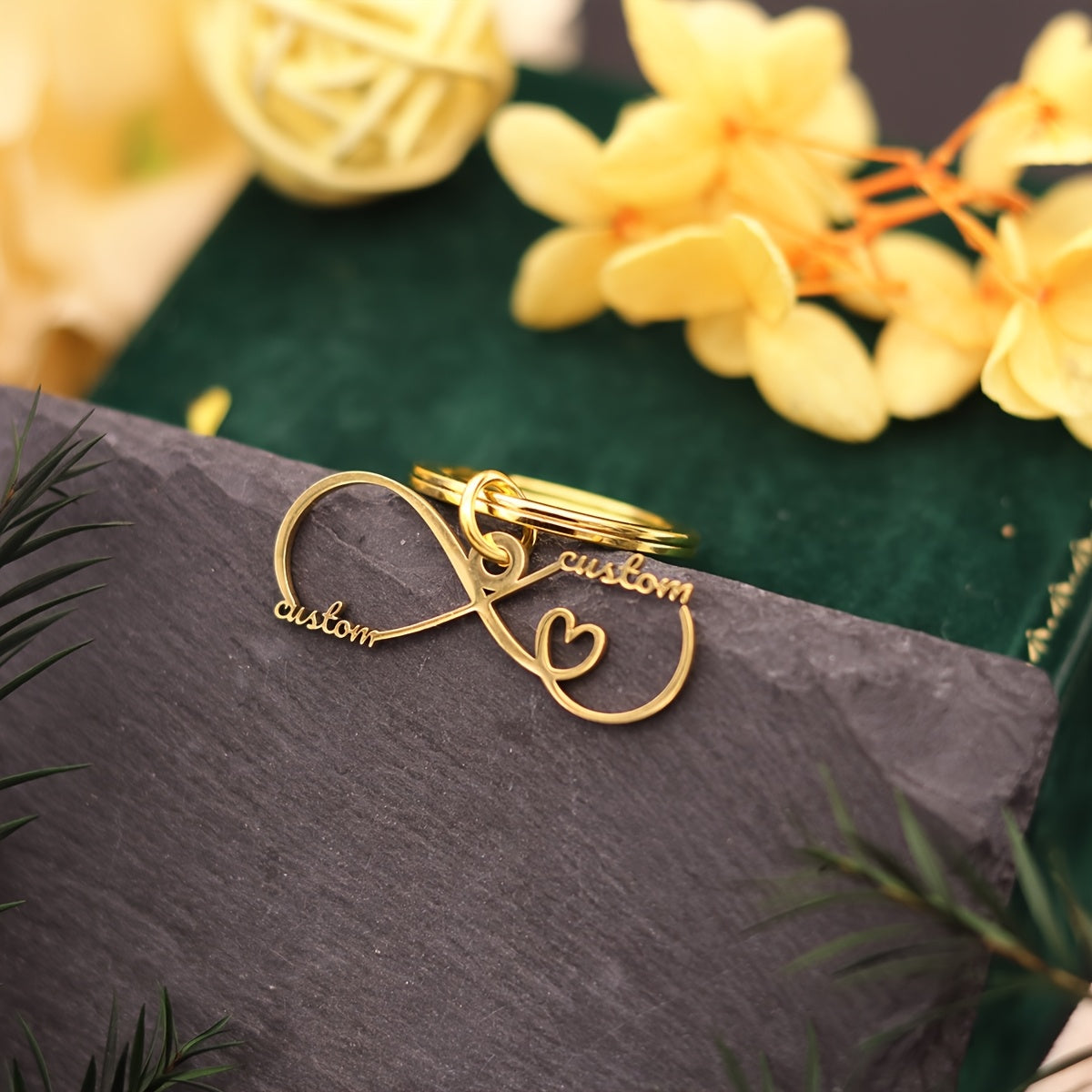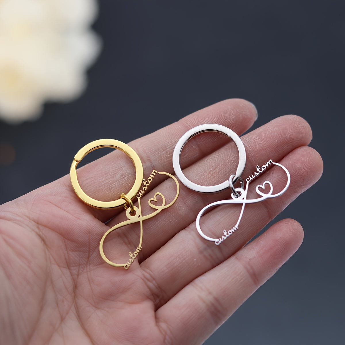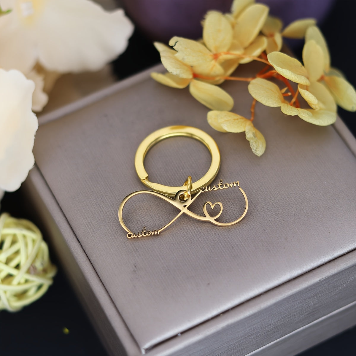 This personalized infinity keychain features two names within a heart design. Made of durable stainless steel, it's a great gift for couples. Customize with your names for a special touch.
