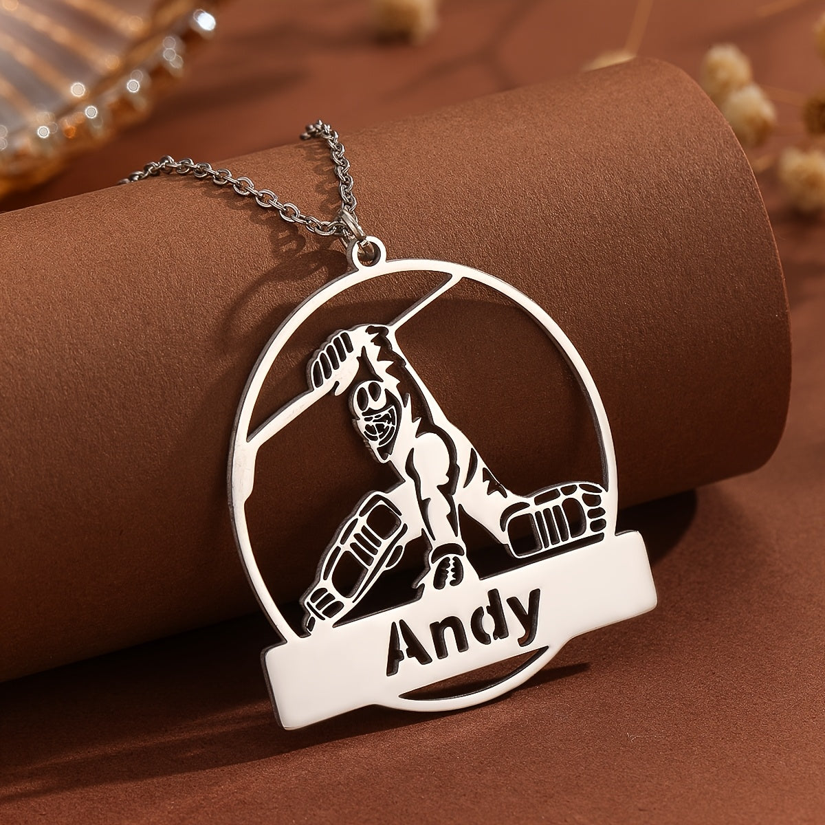 This customizable ice hockey player pendant necklace is made of durable stainless steel. Personalize it with a name or message to make it the perfect gift for any hockey enthusiast.