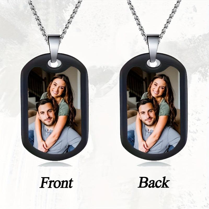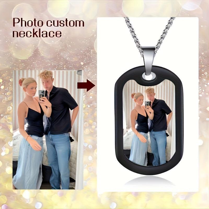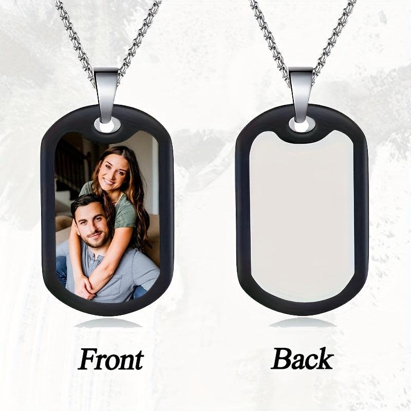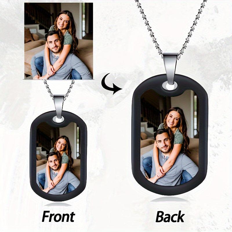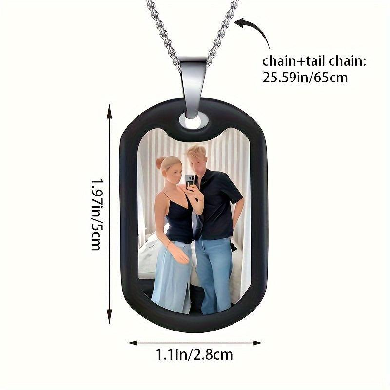 Create a unique gift with this personalized photo necklace featuring a stainless steel silvery dog tag pendant. Add your own picture and receive a one-of-a-kind accessory. Comes with a silicone ring.