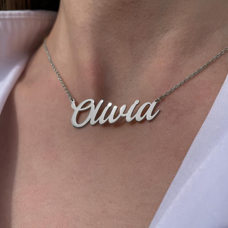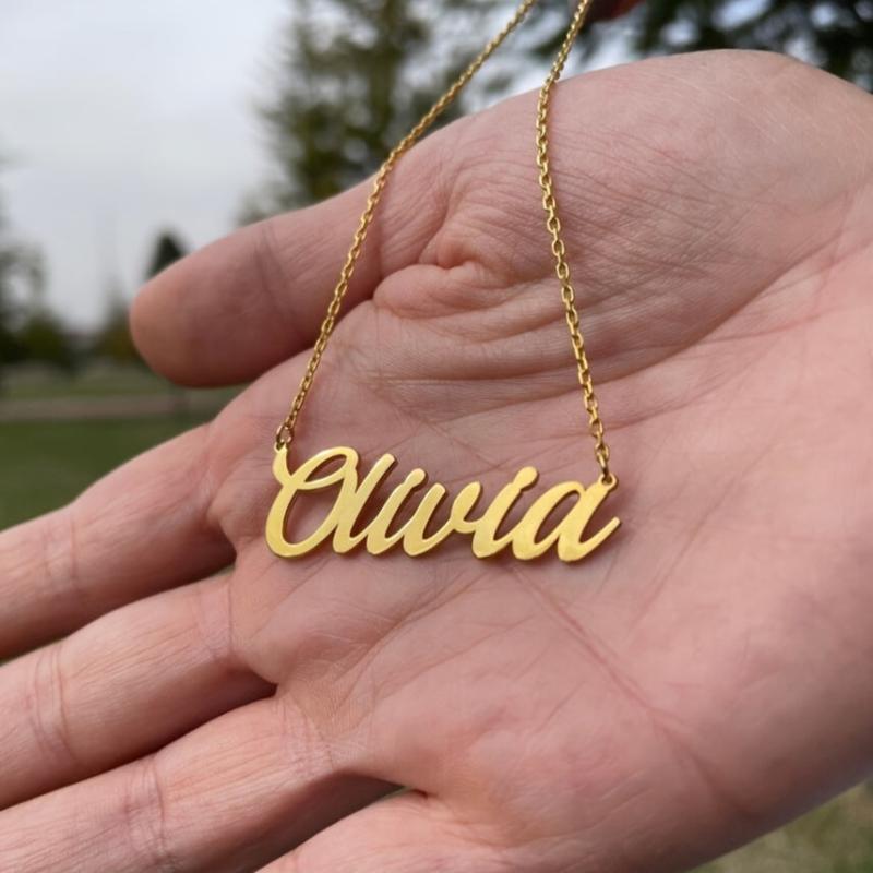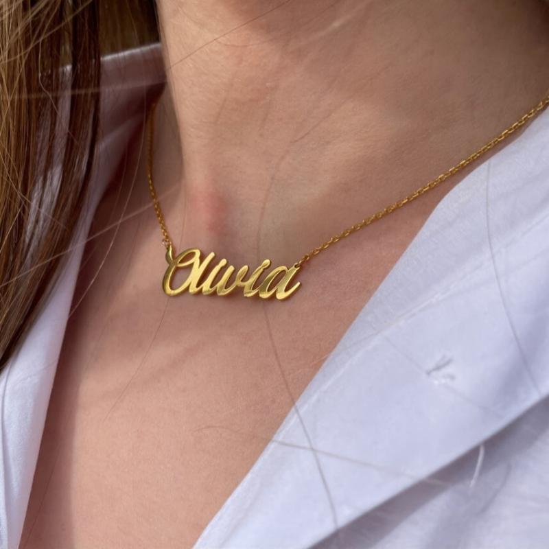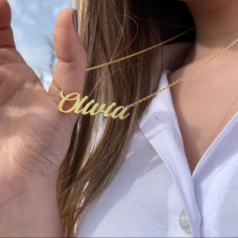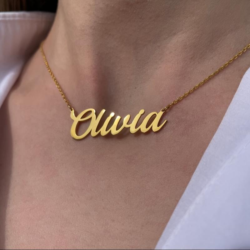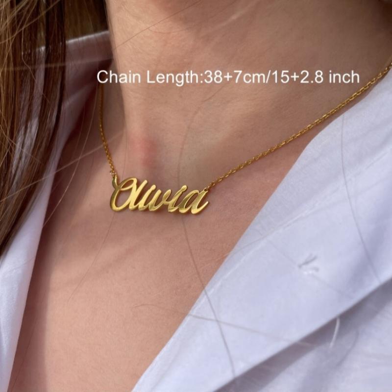 This custom name necklace is crafted from stainless steel and plated with 18K gold. It is suitable for daily wear or to add a touch of elegance to your party outfit.