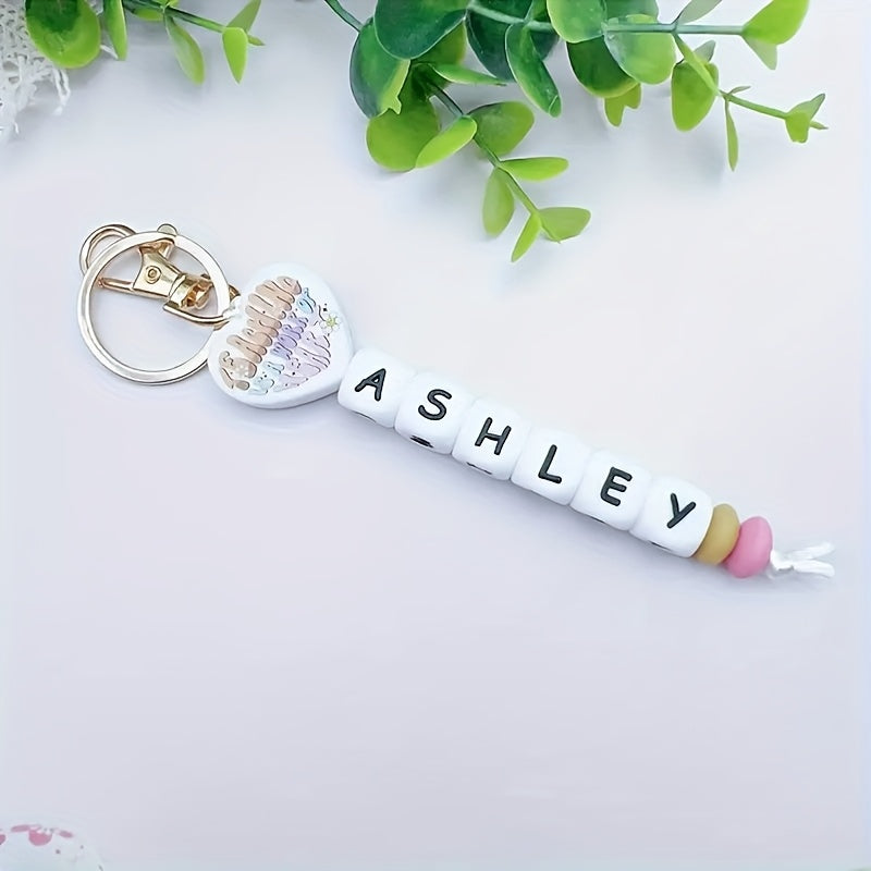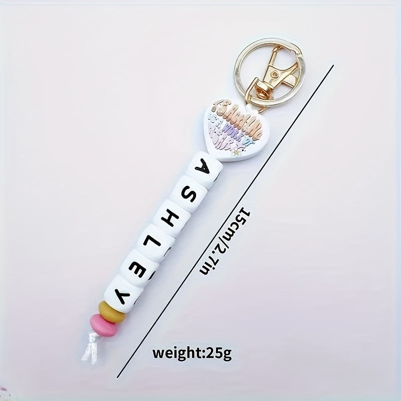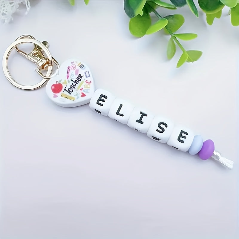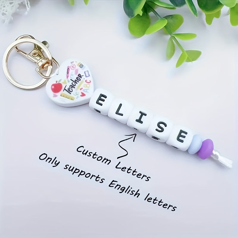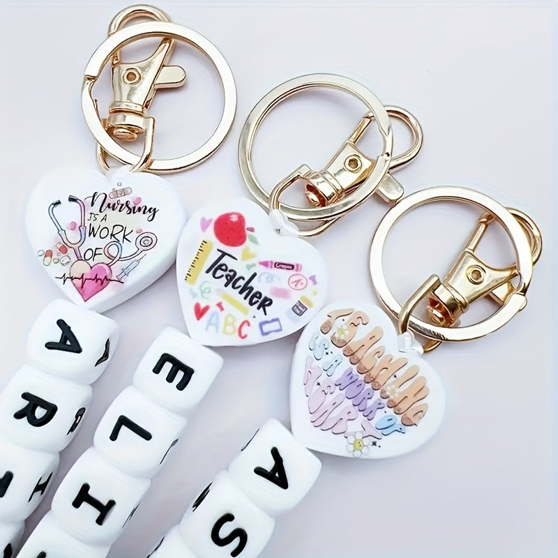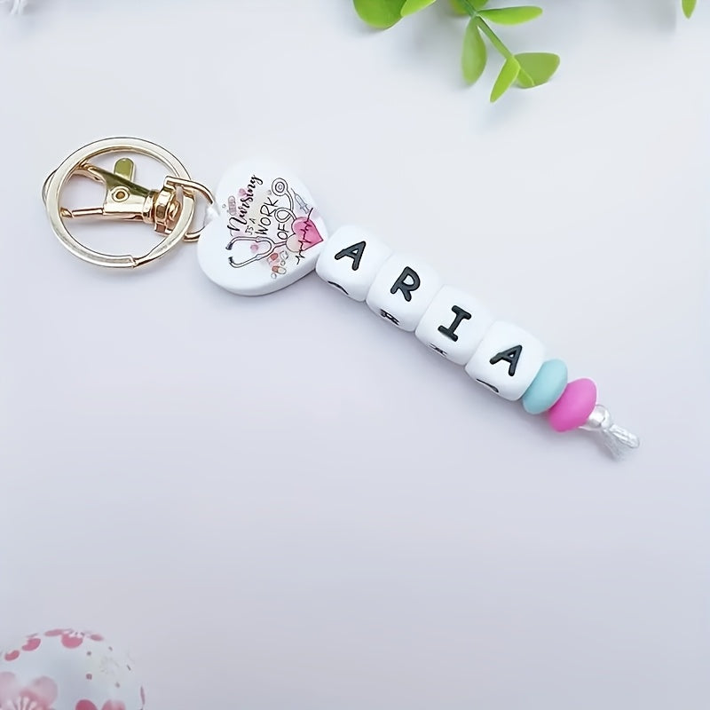 Get a custom silicone bead keychain with heart, teacher, nurse work pattern, and personalized English letters. Ideal gift for friends.