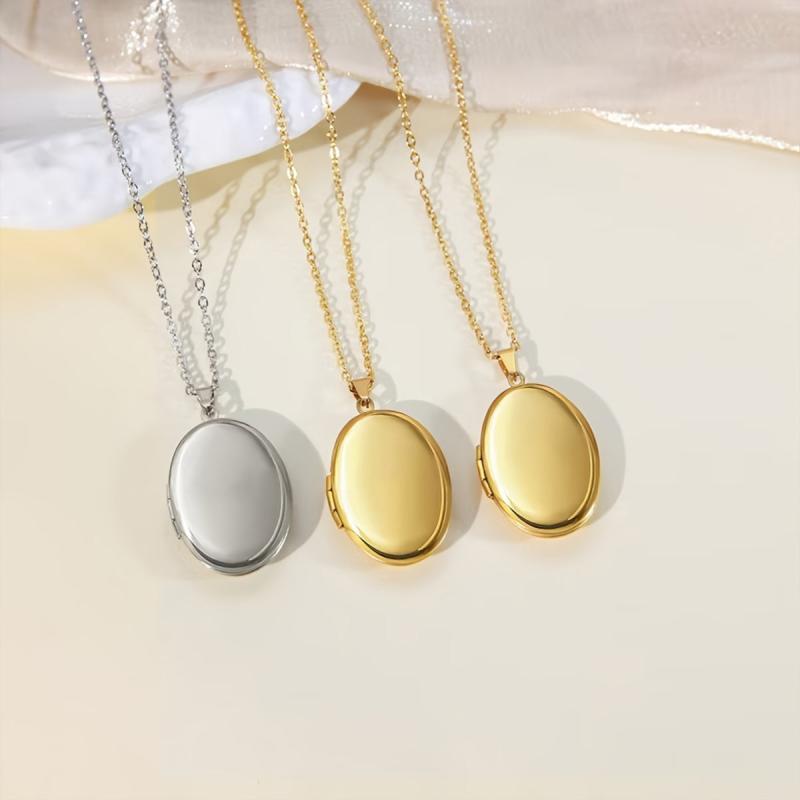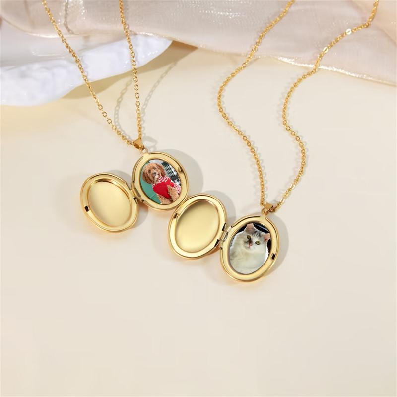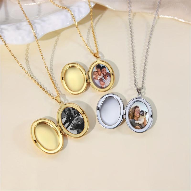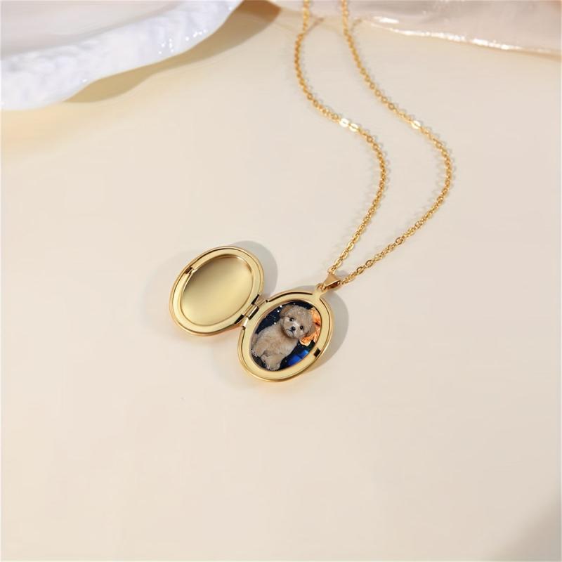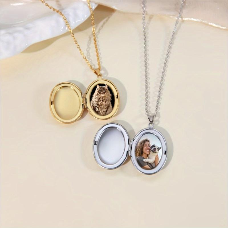 This custom oval photo box necklace features a pendant that can be opened to insert and display a personal photo. The necklace is a unique way to keep cherished memories close.