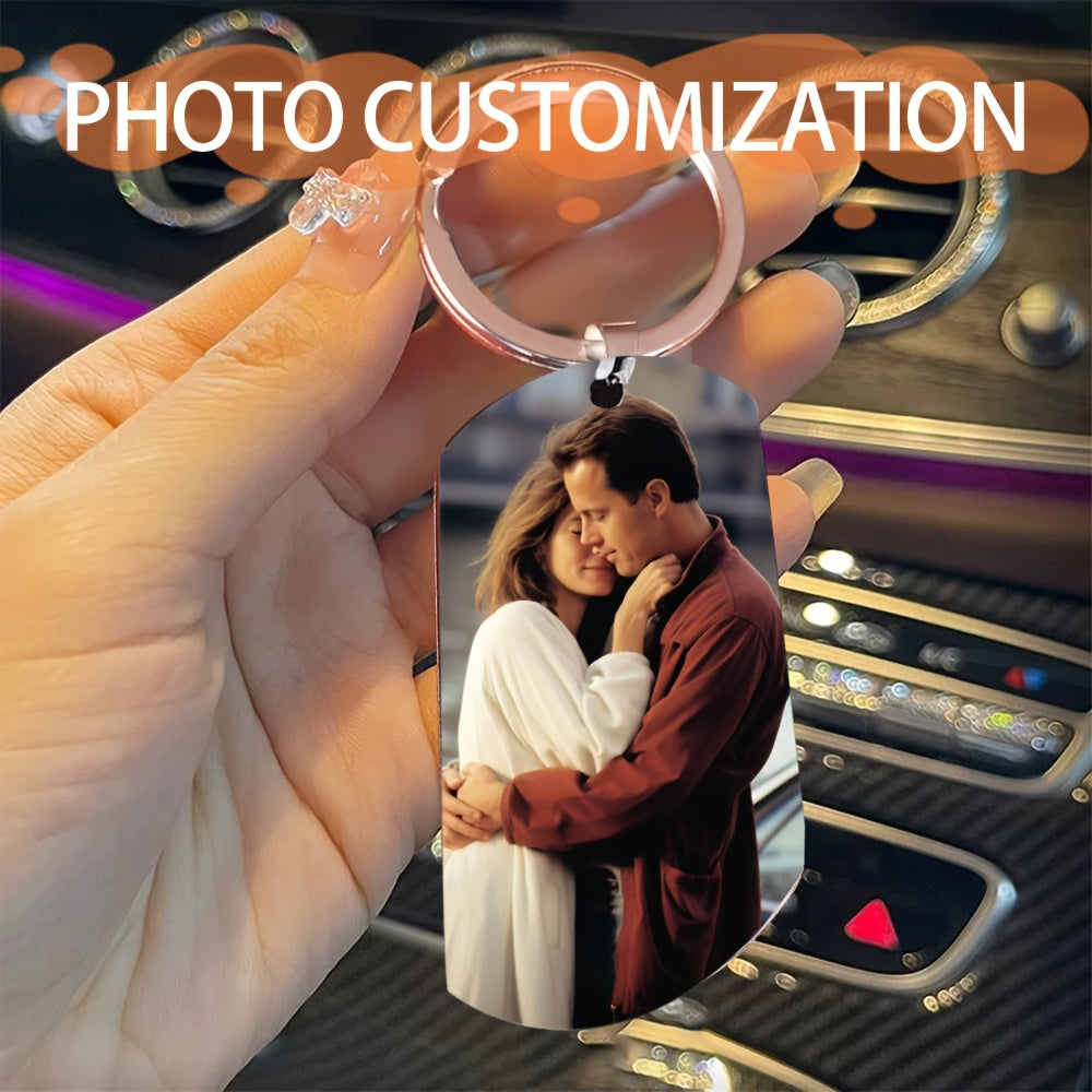 Capture your cherished memories with this personalized dog tag keychain. Upload a clear picture to create a unique keepsake for couples, anniversaries, and weddings.