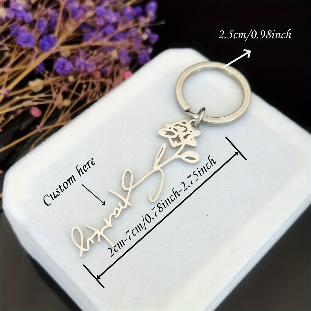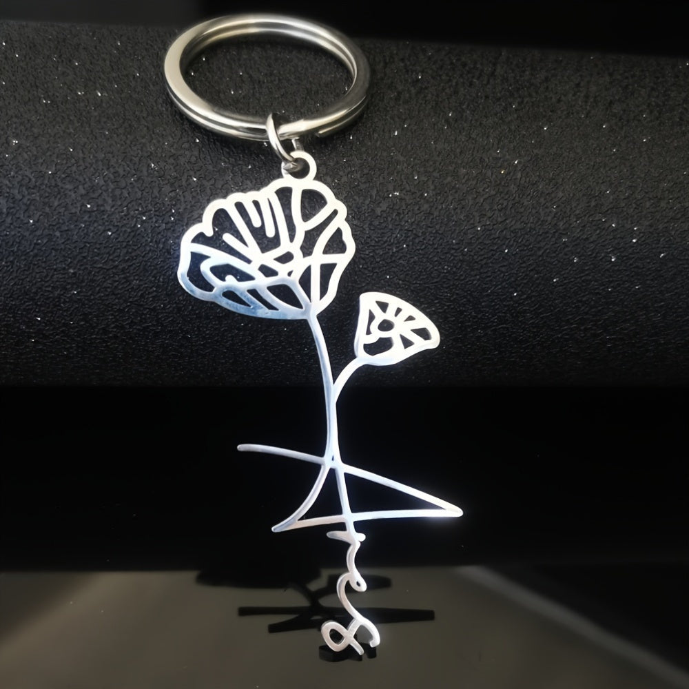 Elegant stainless steel flower keychain with customized name in alphabet and floral design. Perfect for wedding favors, bridesmaids gifts, and birthdays.