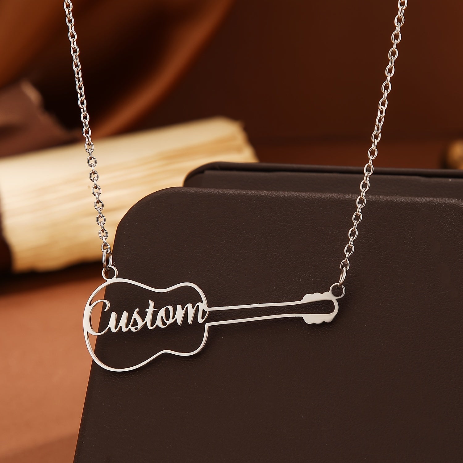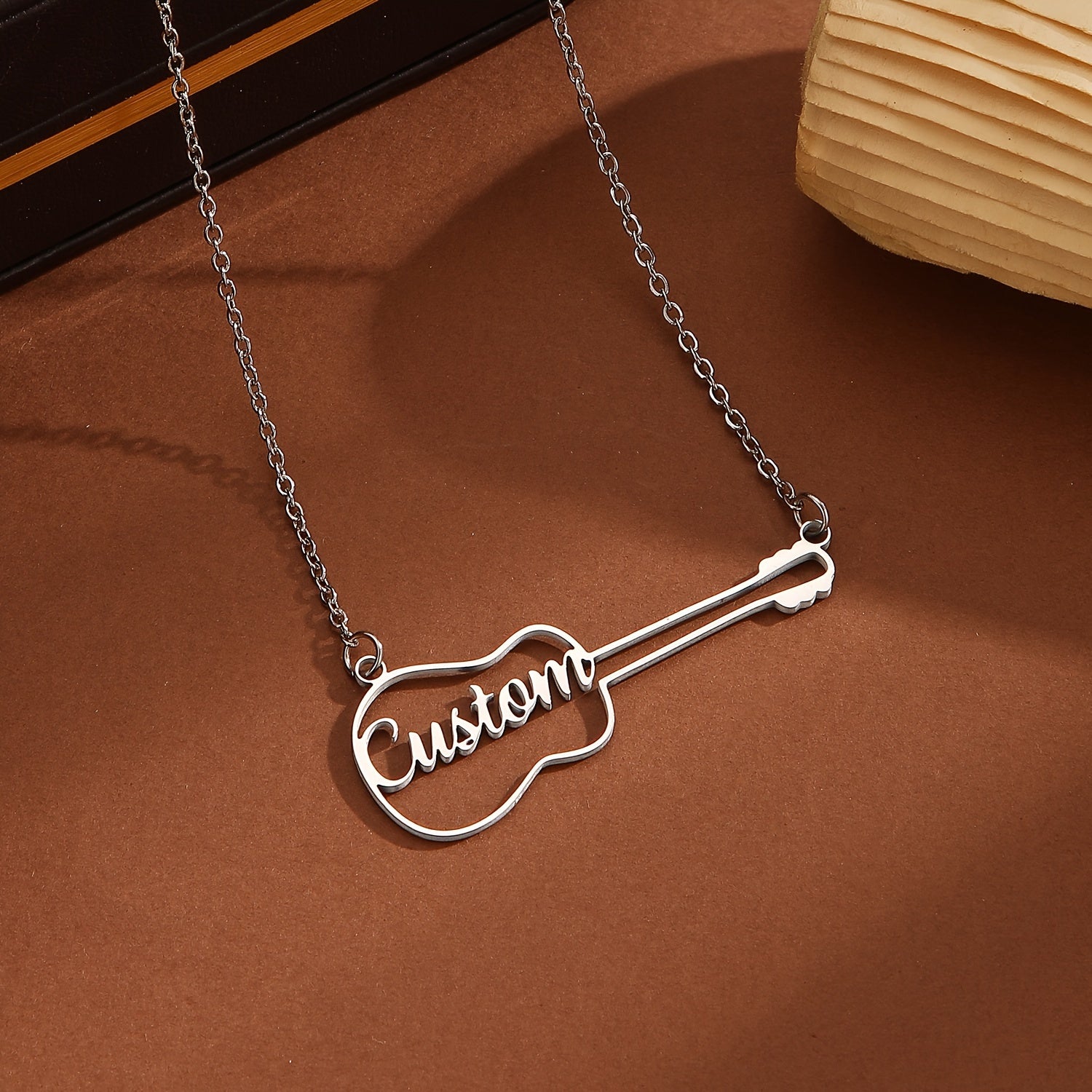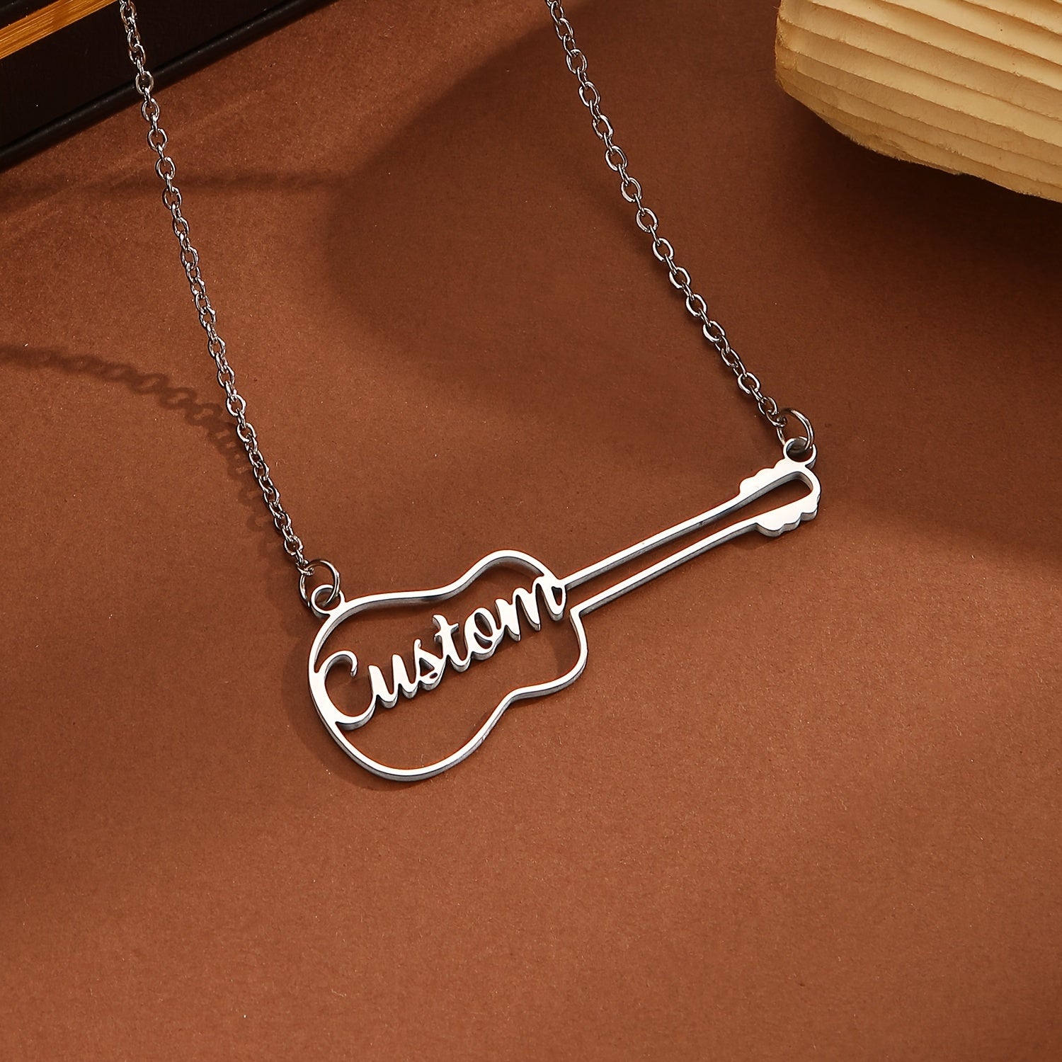 This unique guitar-shaped necklace is a versatile piece of jewelry that is perfect for everyday wear. Ideal as a birthday present, the necklace is engraved with a name for a personalized touch.