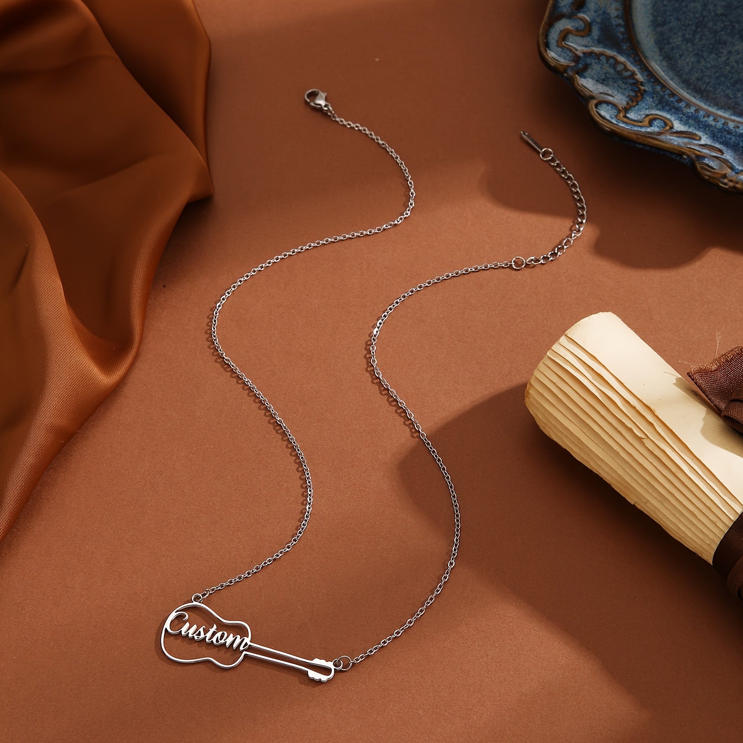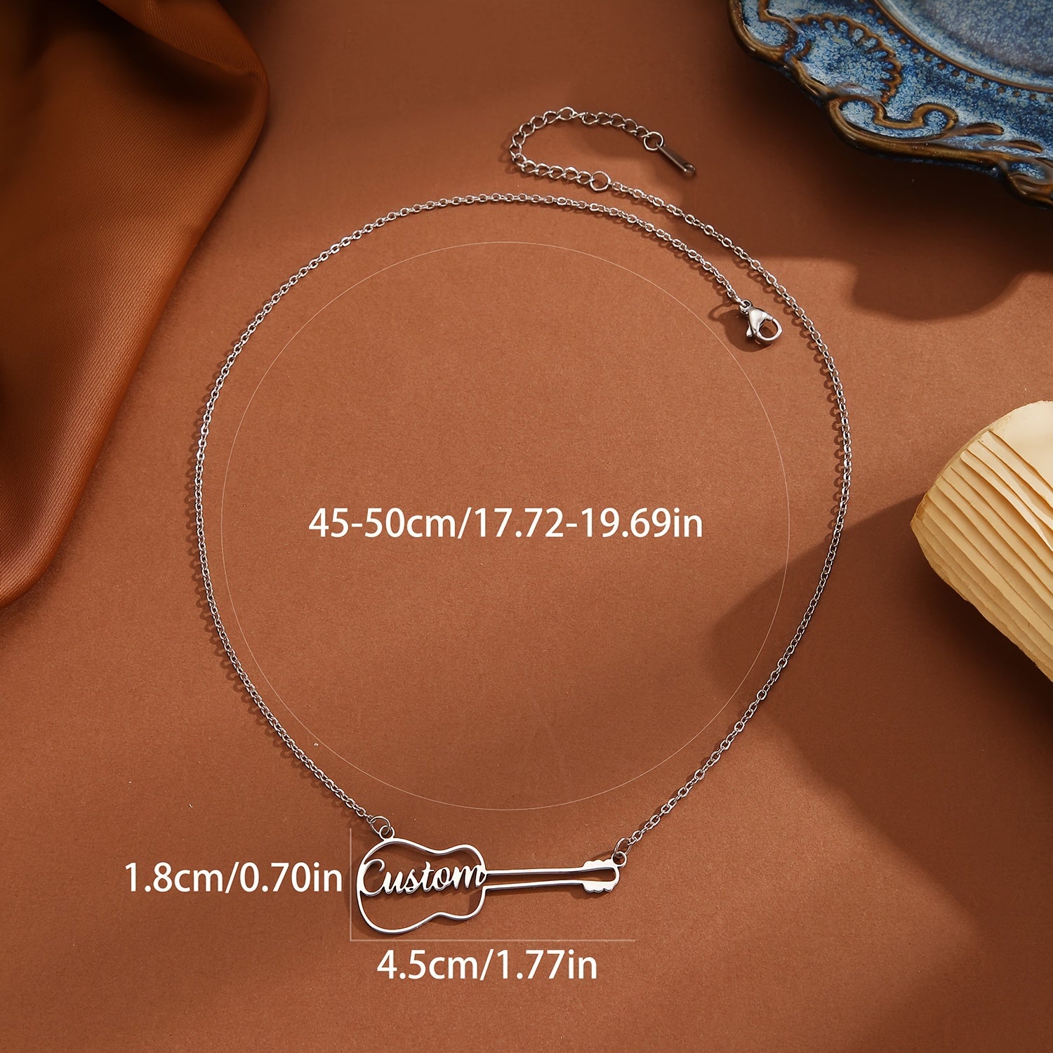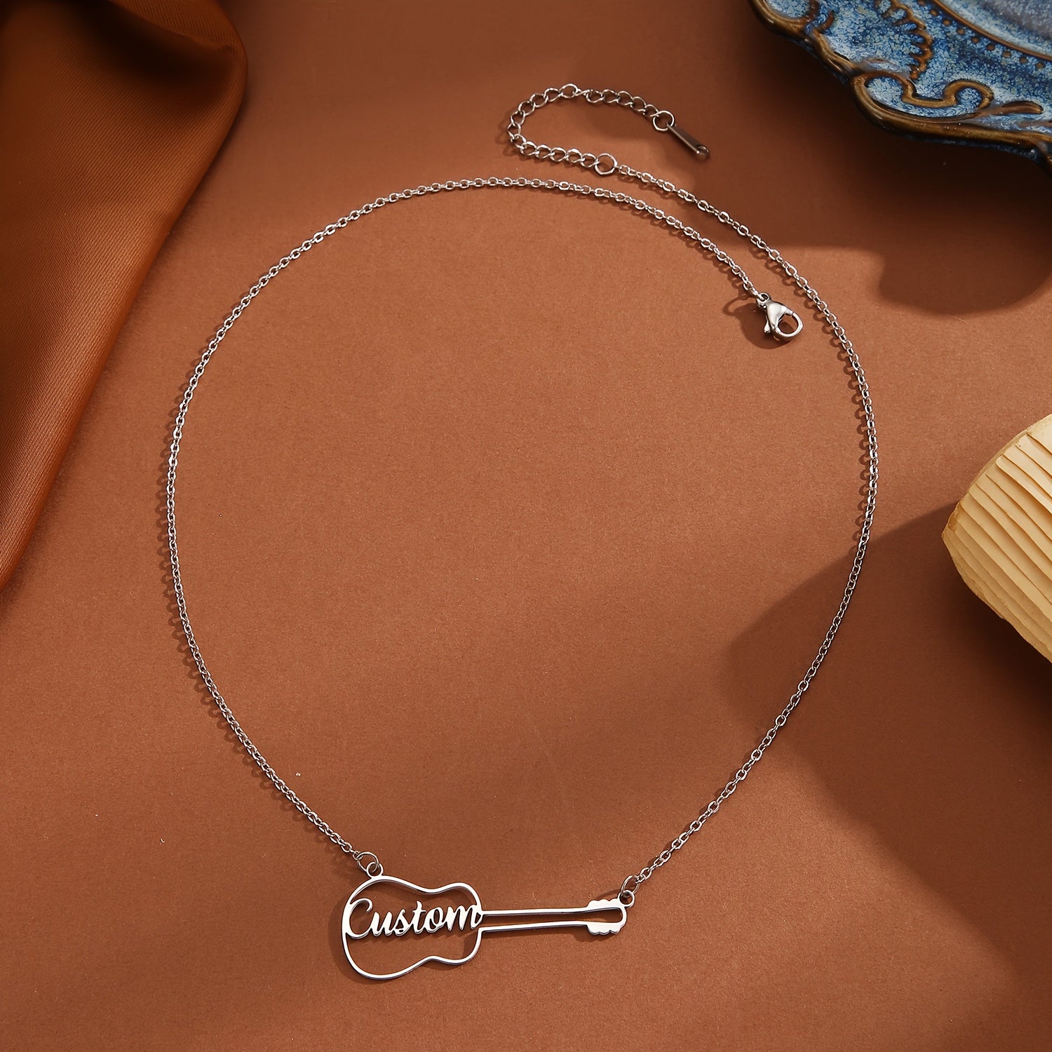 This unique guitar-shaped necklace is a versatile piece of jewelry that is perfect for everyday wear. Ideal as a birthday present, the necklace is engraved with a name for a personalized touch.