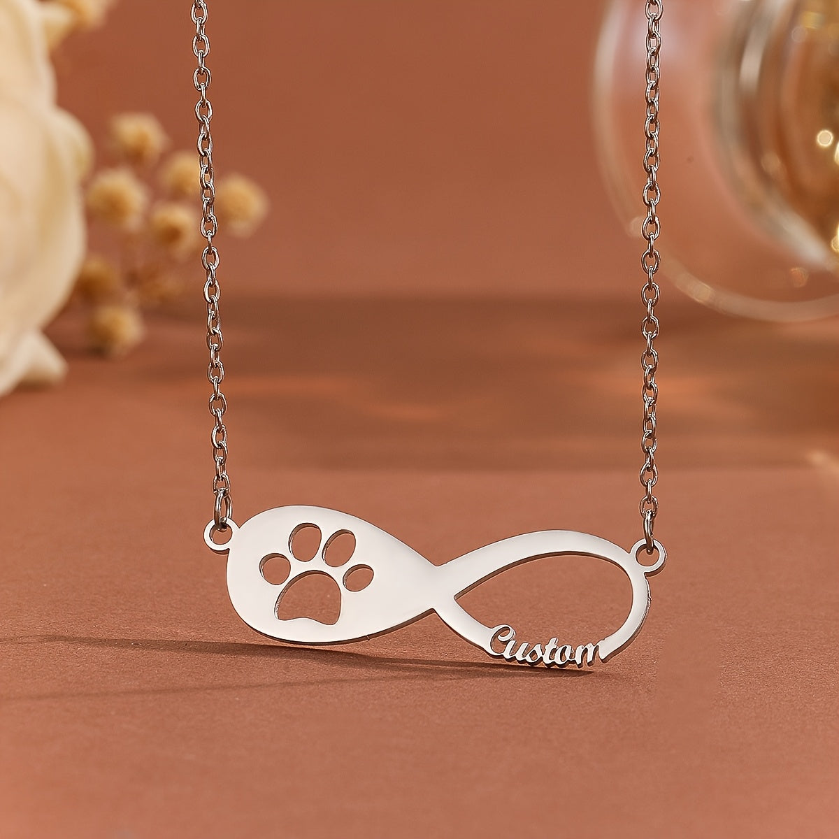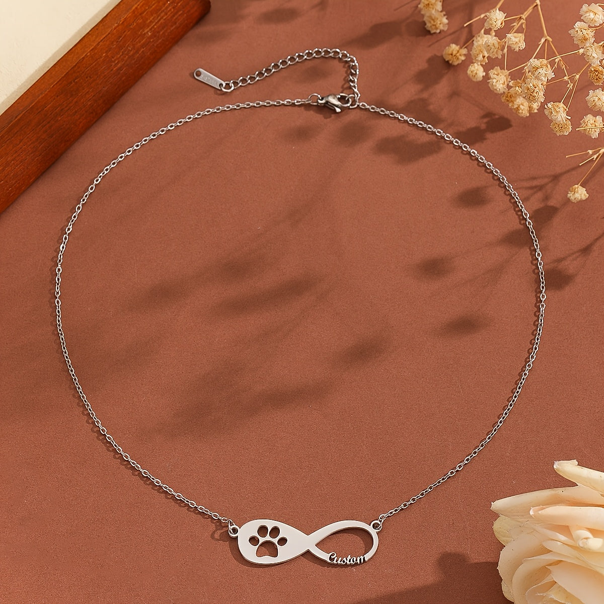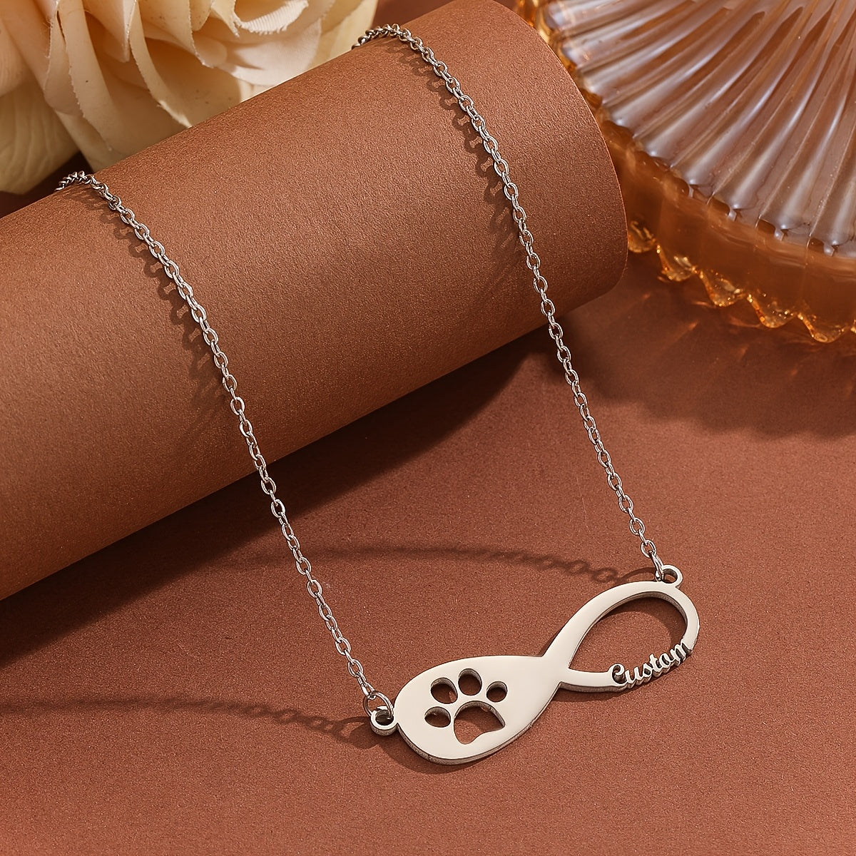 This stainless steel necklace features a unique design with a cat paw and infinity symbol. Customized with your name, it makes a lovely jewelry gift for men and women.