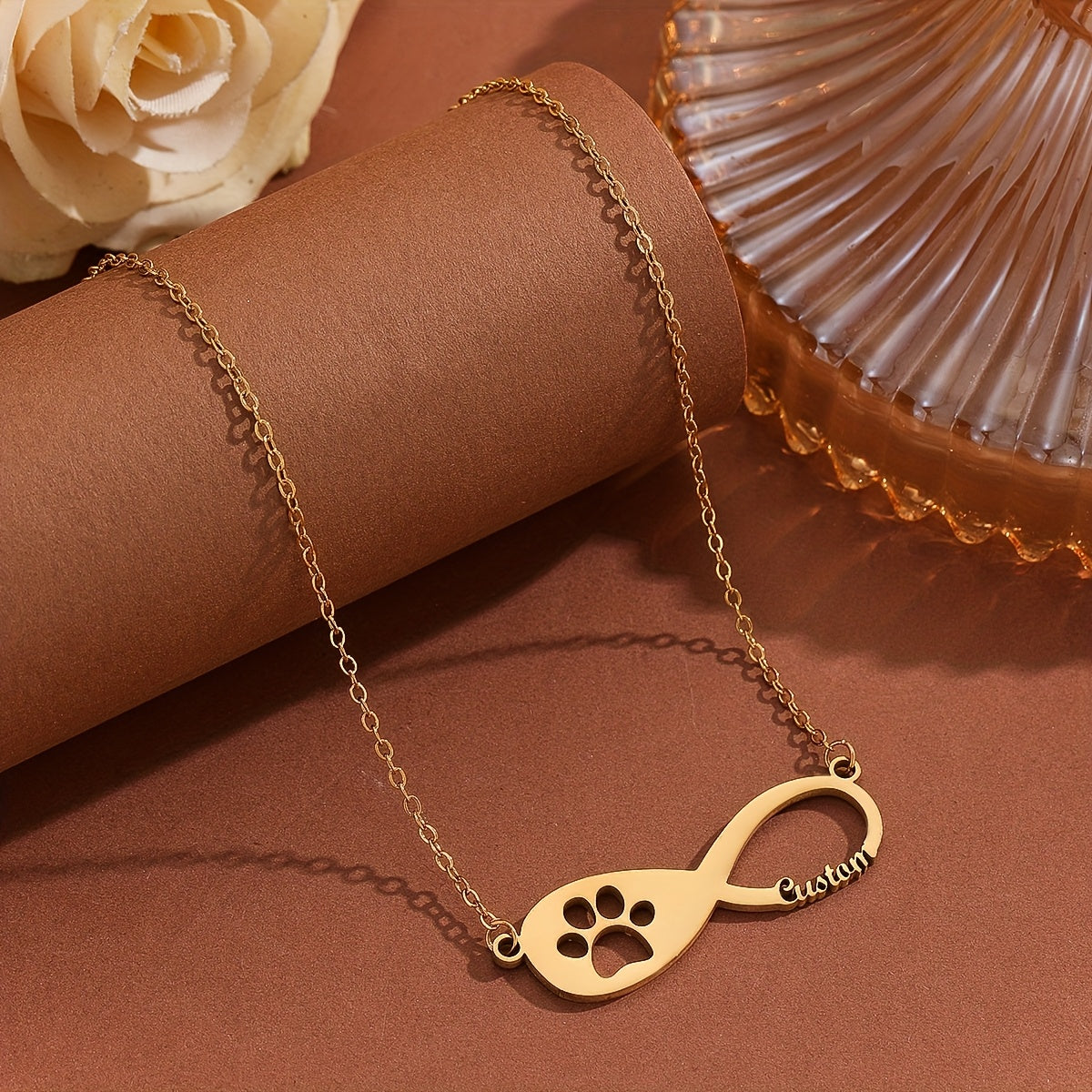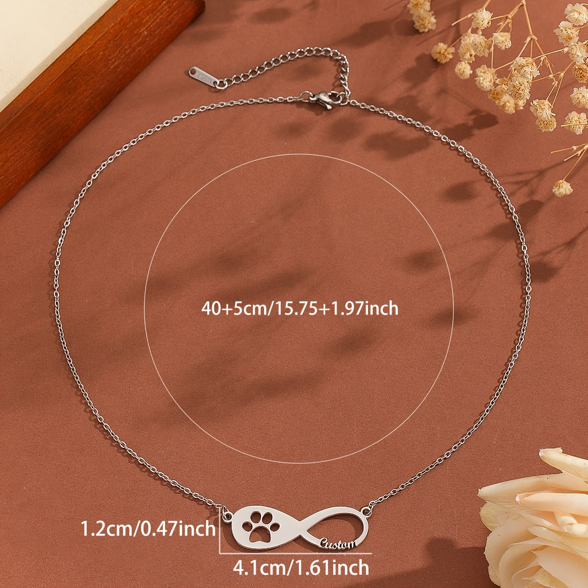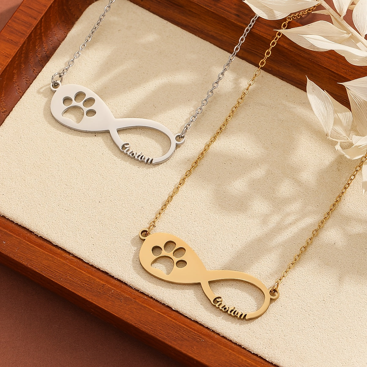 This stainless steel necklace features a unique design with a cat paw and infinity symbol. Customized with your name, it makes a lovely jewelry gift for men and women.