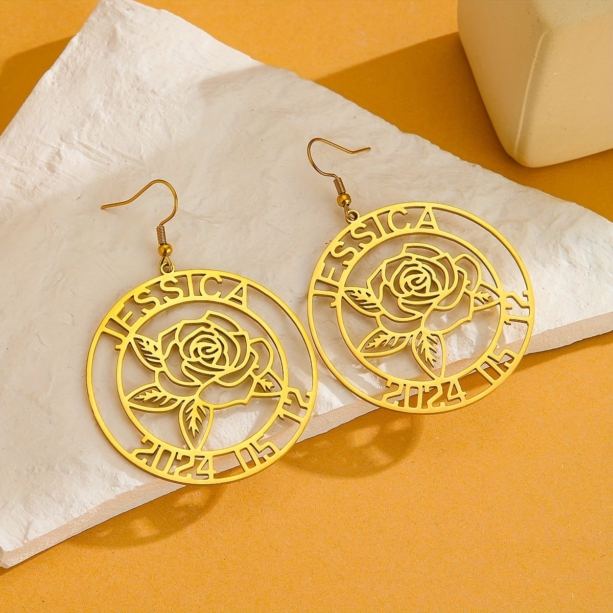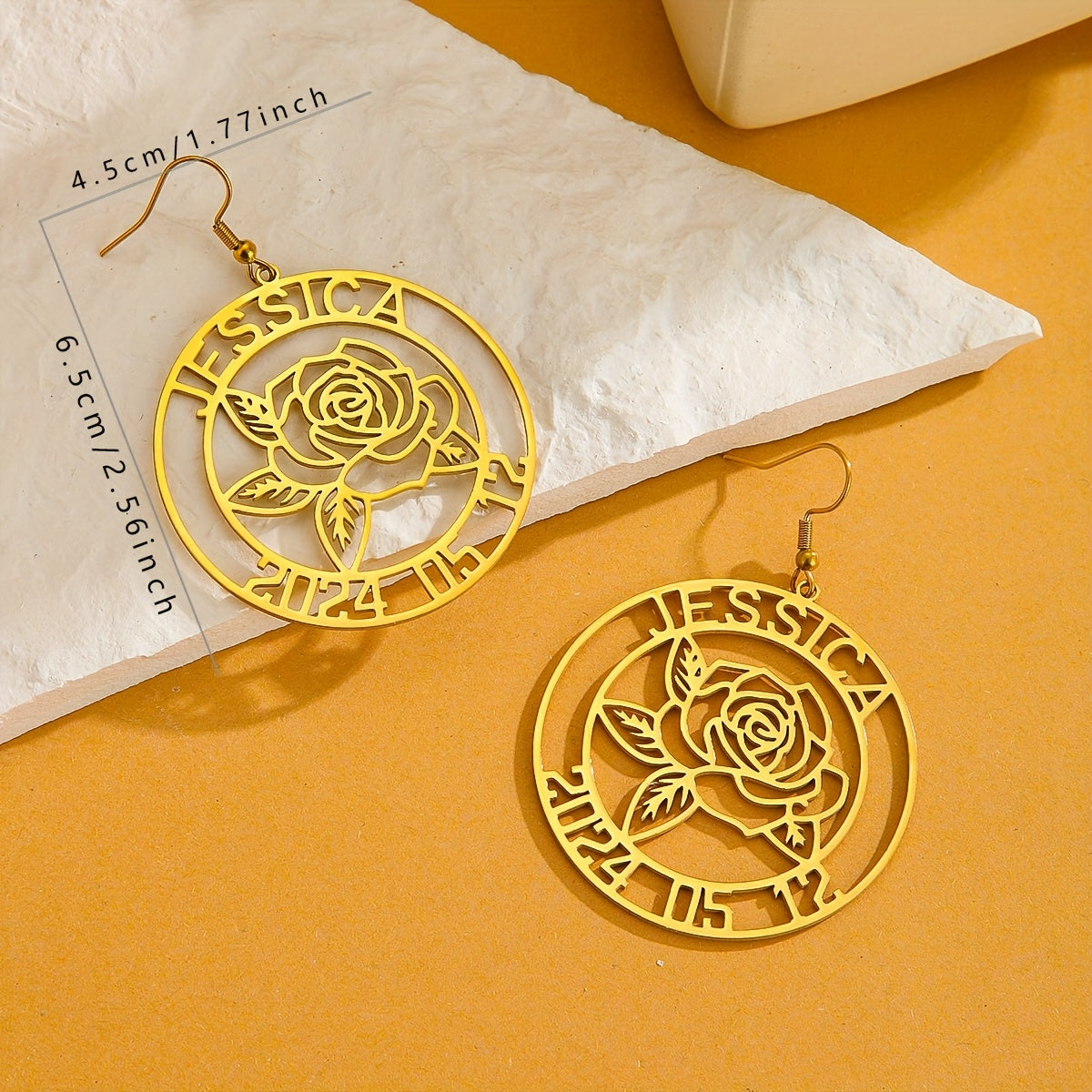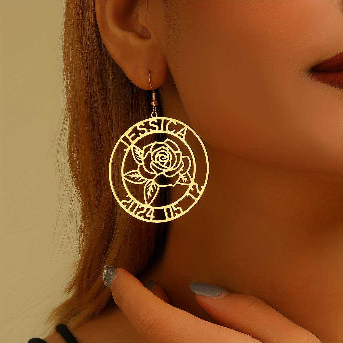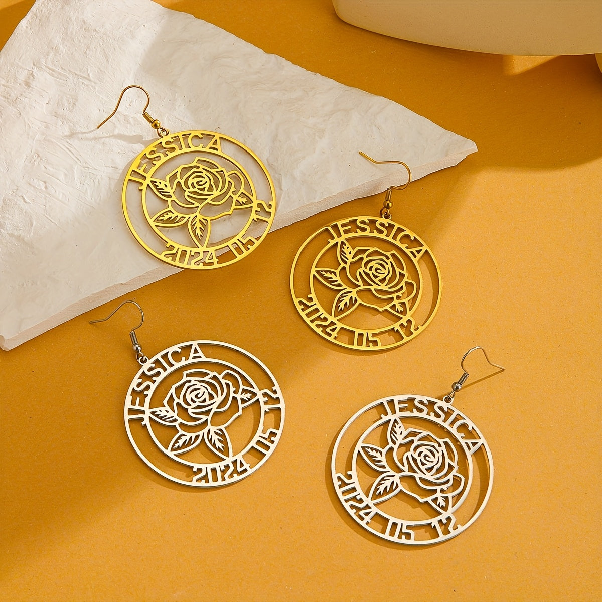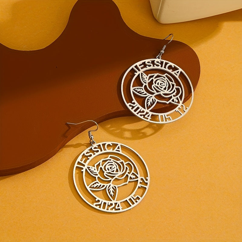 Surprise her with these romantic stainless steel hoop earrings featuring a round shape pendant with a beautiful rose design. Customized with her name and a special date, this jewelry is the perfect gift for any occasion.