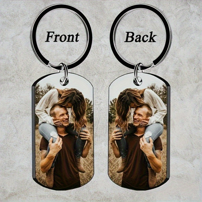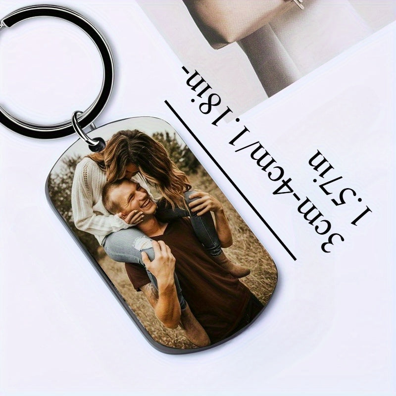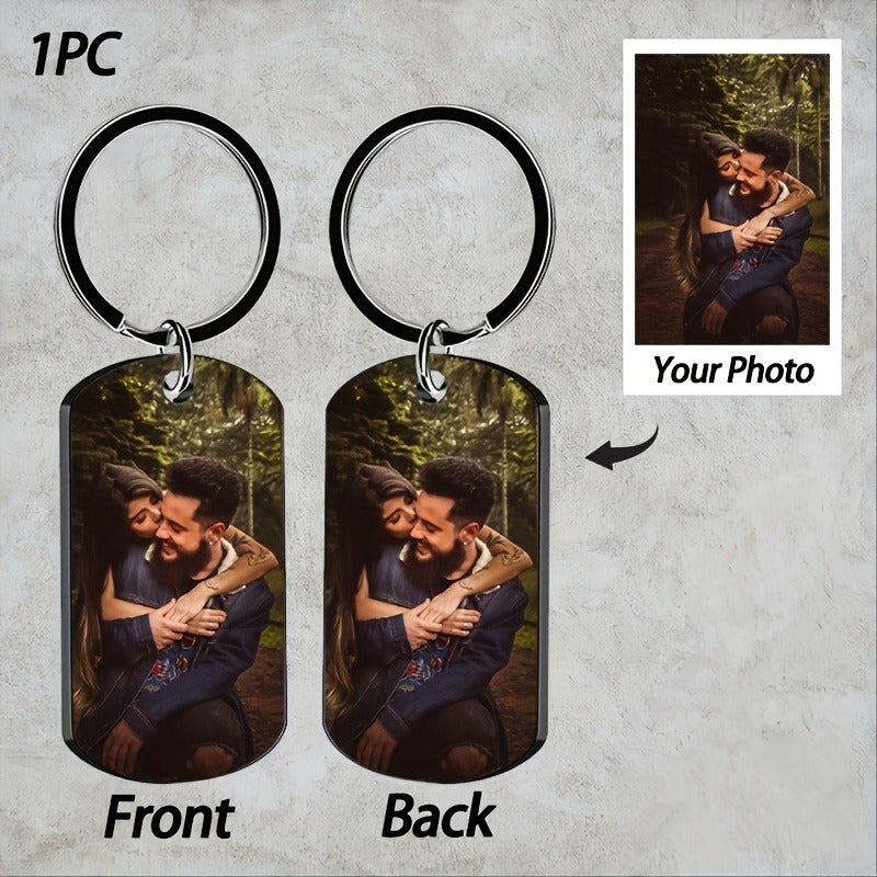 This dual-sided dog tag keychain is a perfect gift for couples. Made from stainless steel with a gray finish, you can customize it with a special photo. Ideal for anniversaries or special occasions.