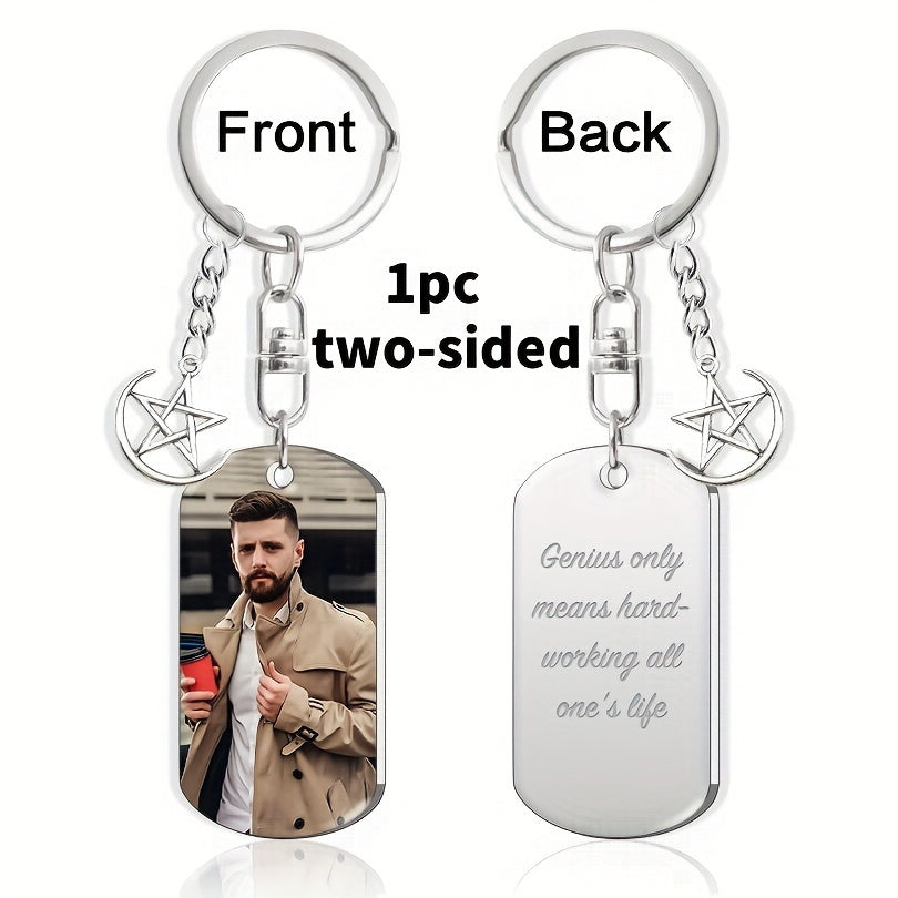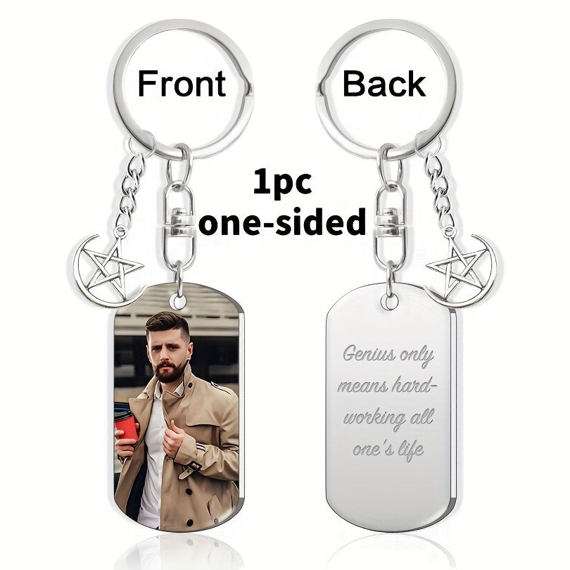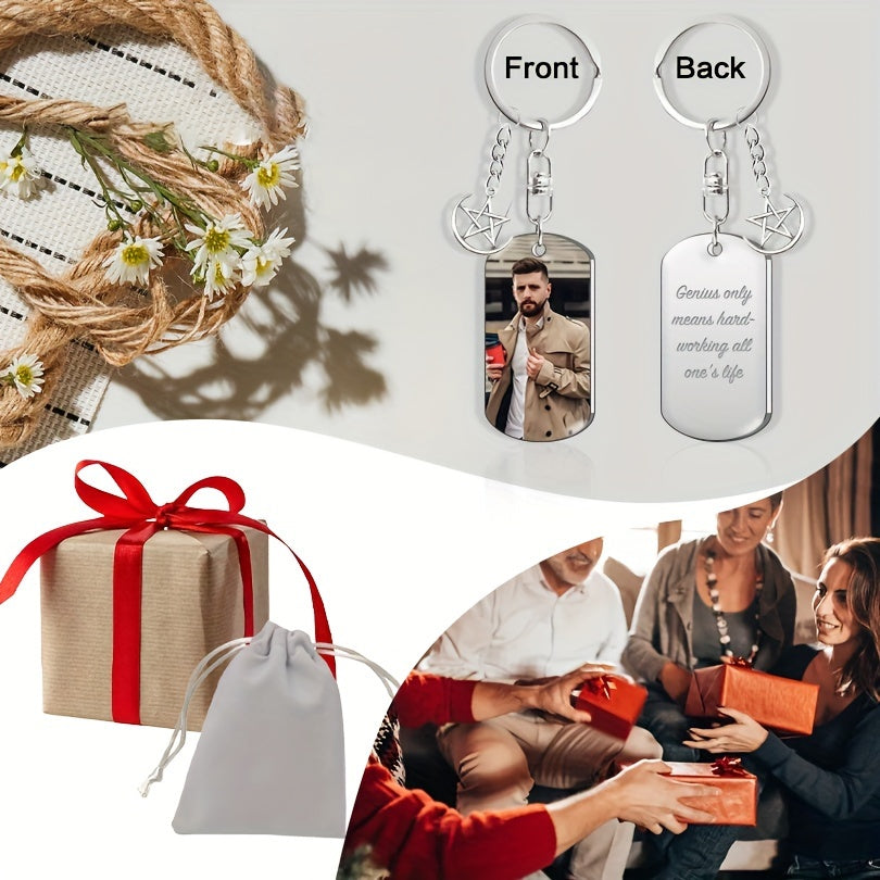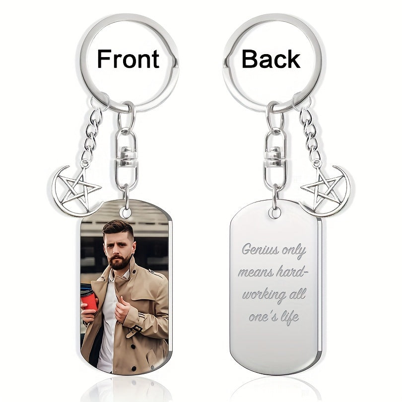 Customizable keychain featuring a photo and engraved quote, crafted from durable stainless steel. Ideal gift for father, boyfriend, husband. Perfect for adding a personal touch to your accessories.