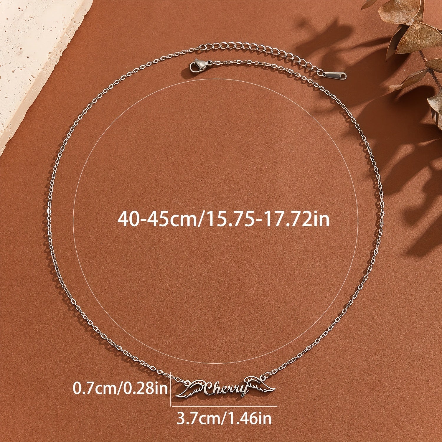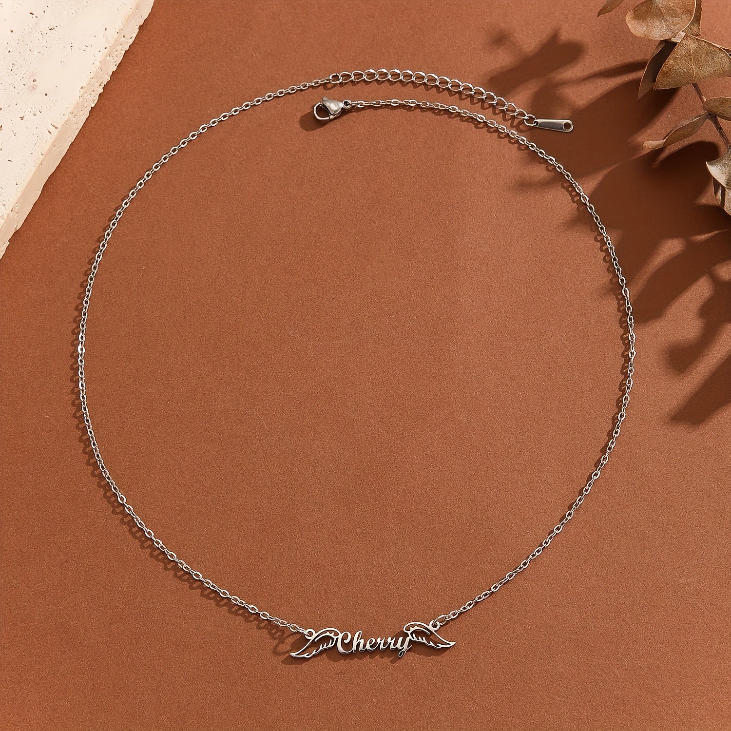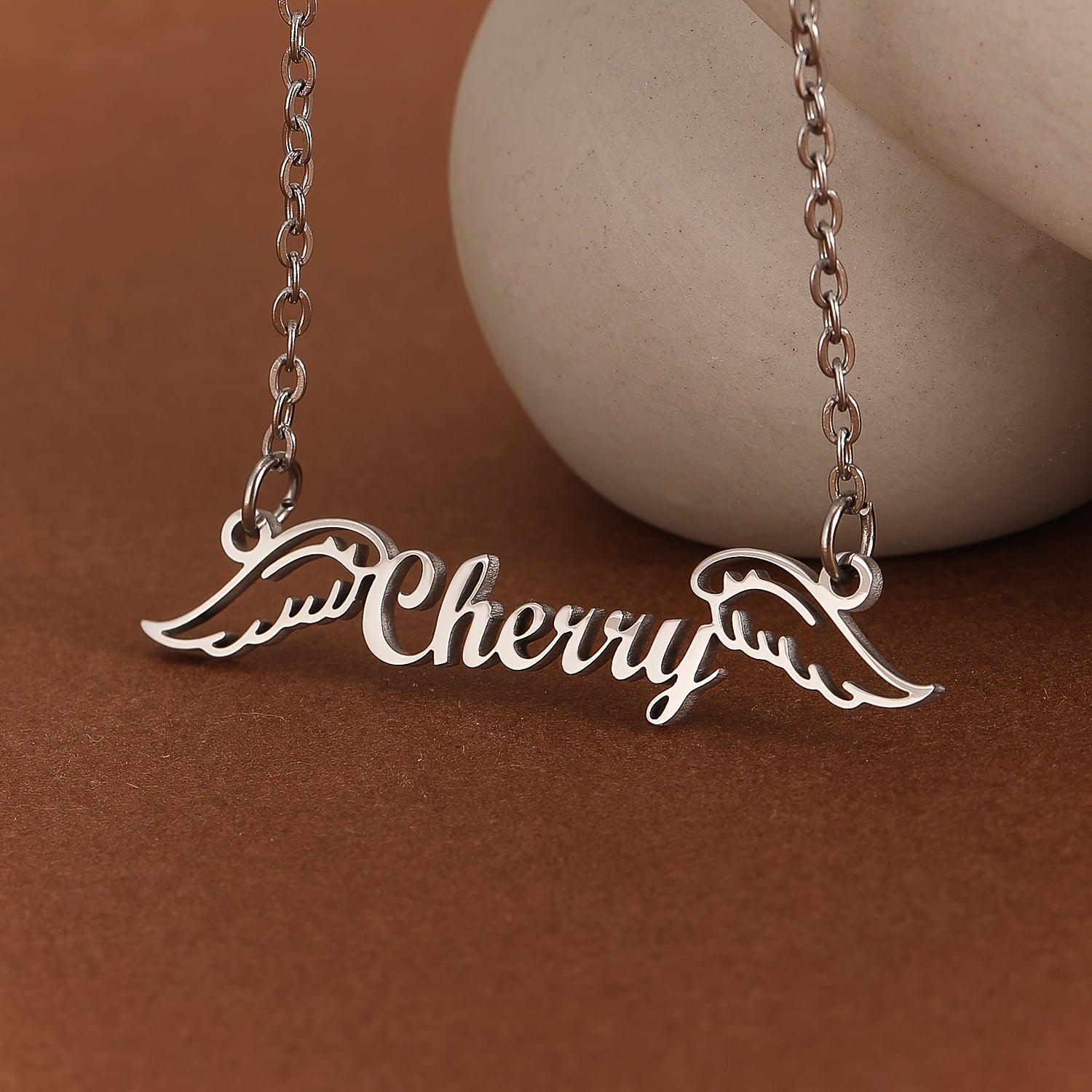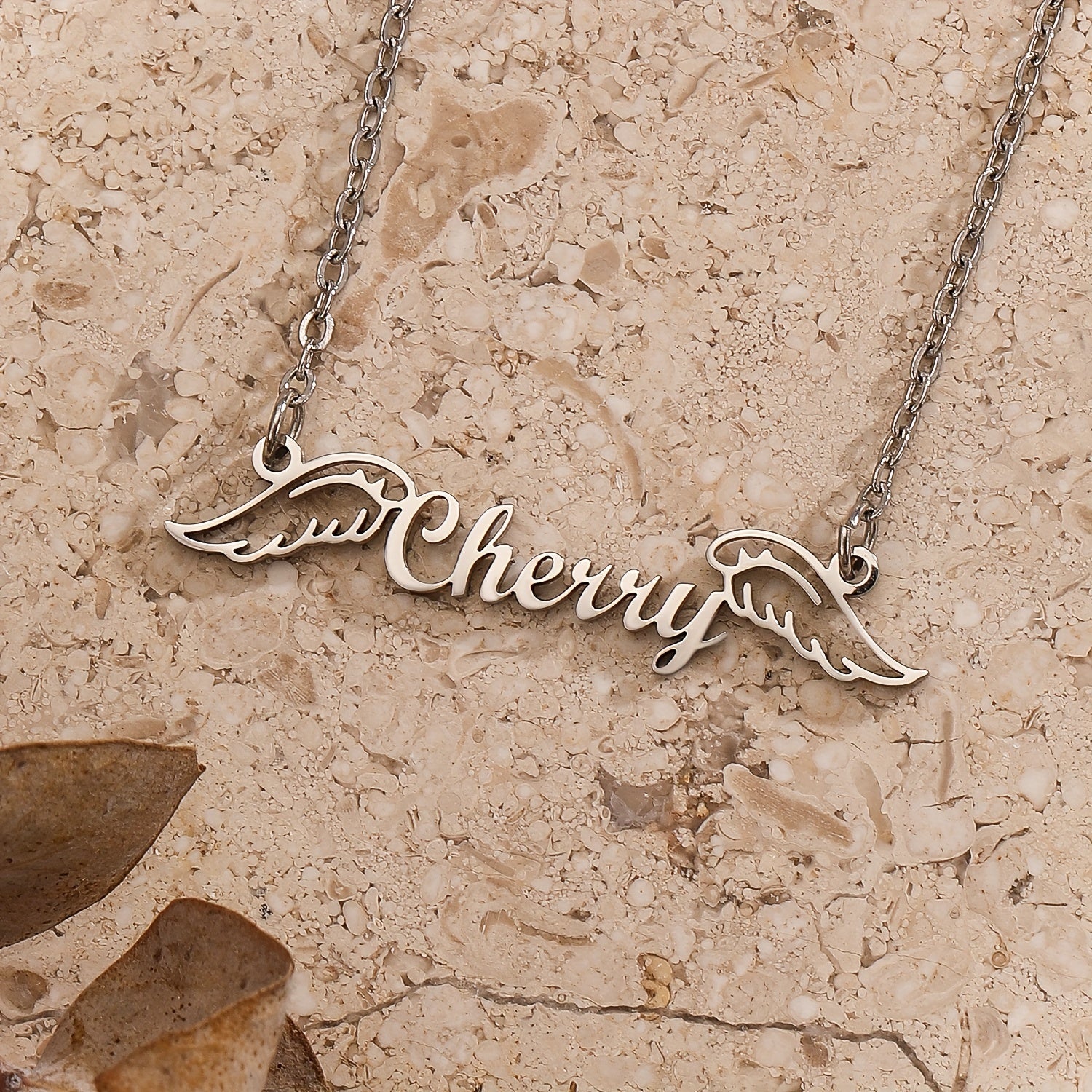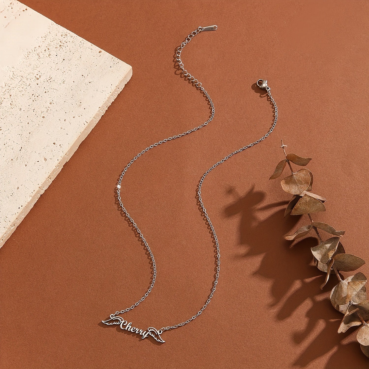 This custom name pendant necklace features angel wings design, made of stainless steel. It comes with an adjustable neck chain. A thoughtful and unique birthday gift.